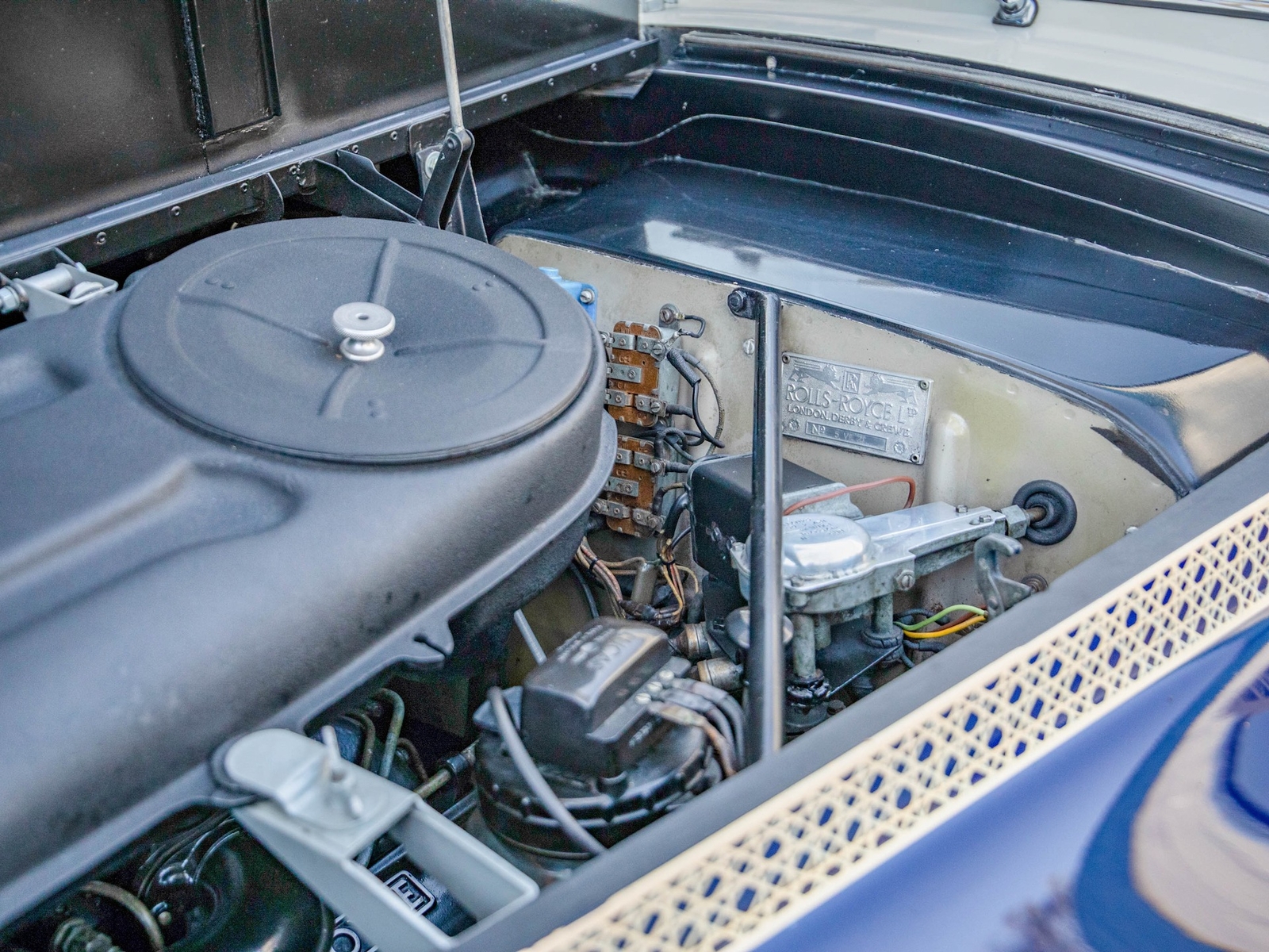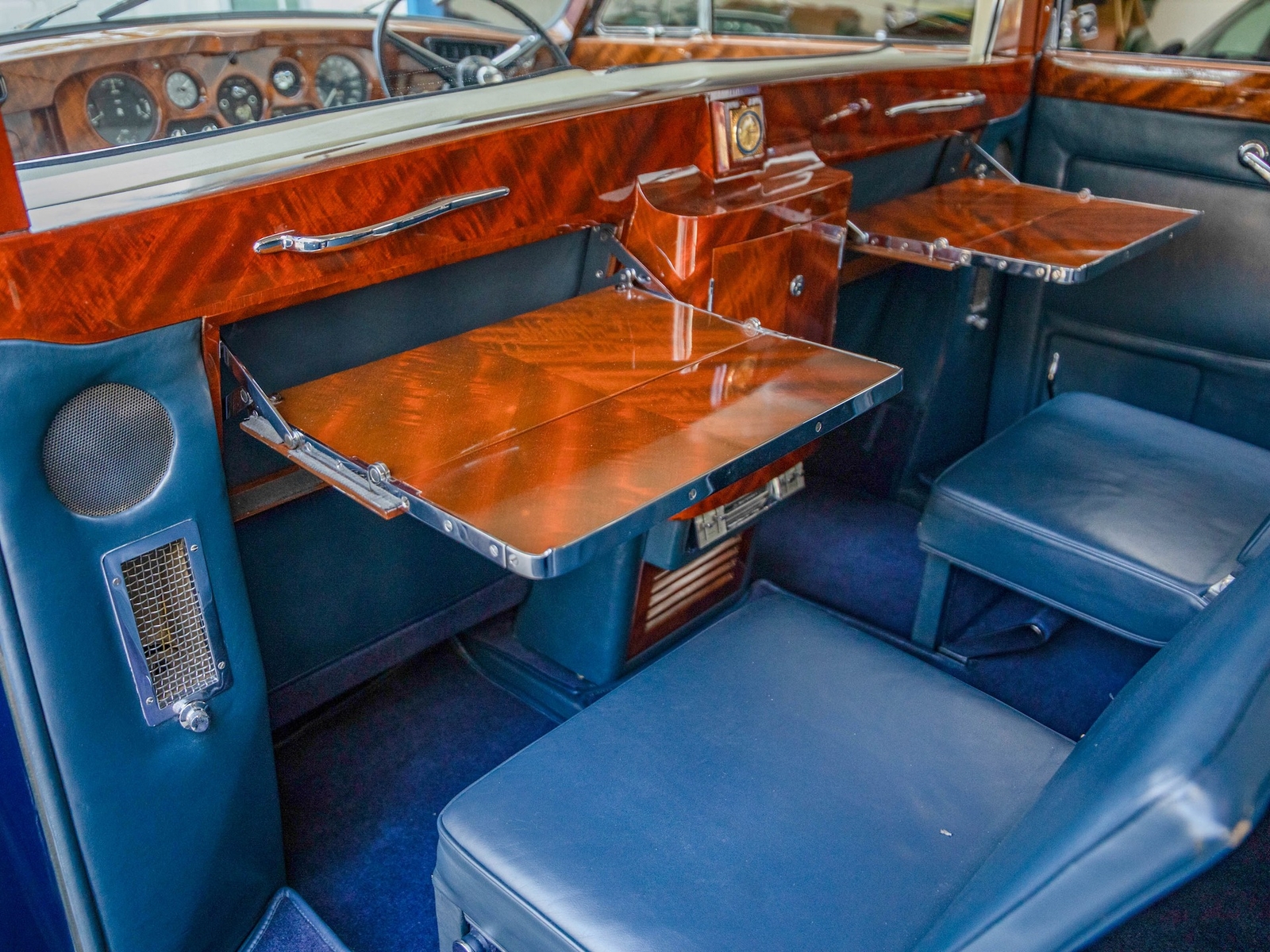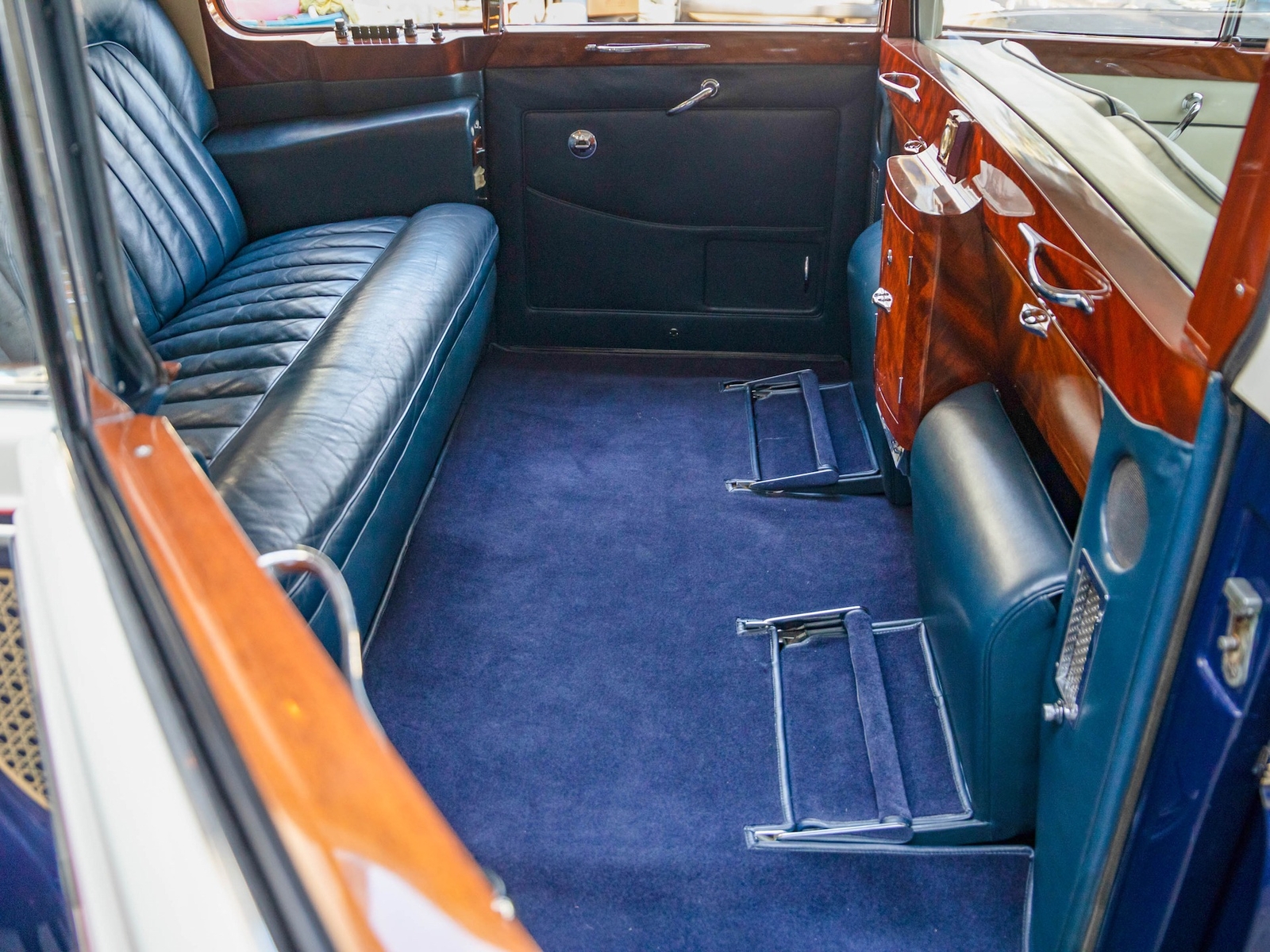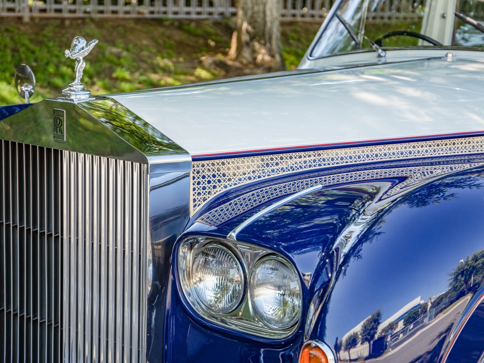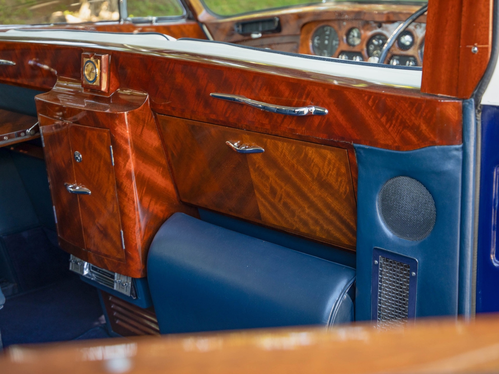 The body was liveried for Swinging London, in ivory white and royal blue with panels of decorative sham cane. In this form it surely turned heads at the 1965 Earls Court Motor Show, as is noted on both its build sheet and in Rolls-Royce Foundation records; a book published by its later home, Californias Behring Collection, notes it received a bronze medal at the show. Afterward it was delivered to the original owner B.P. Jenks, of Astbury Hall in Bridgnorth, Shropshire. At one point it was used as the basis for a Top Marques 1/43-scale model.