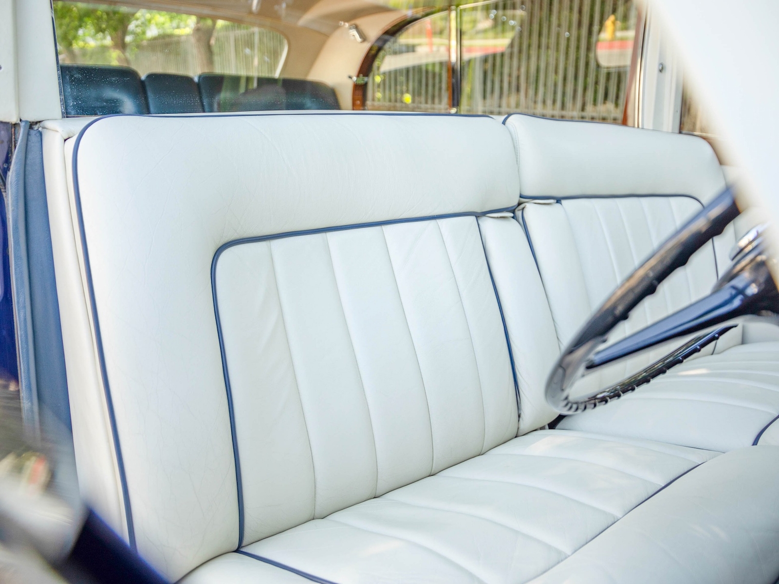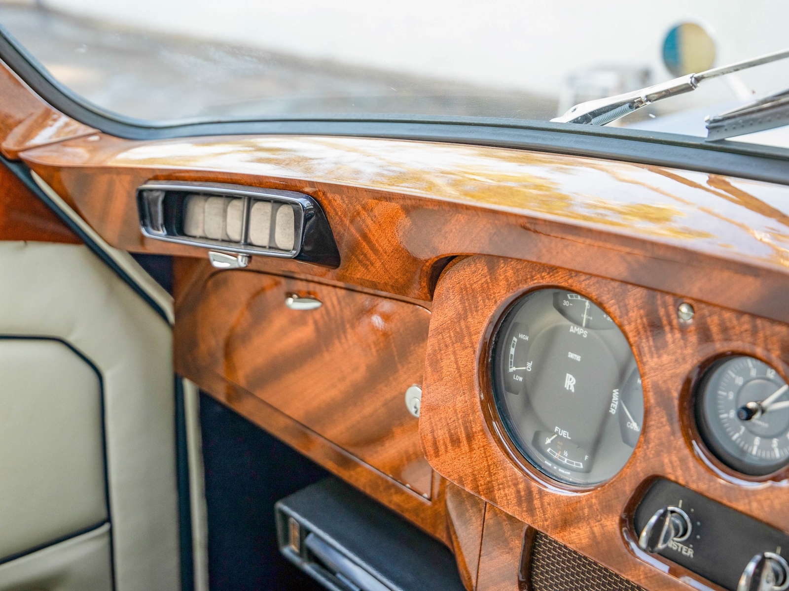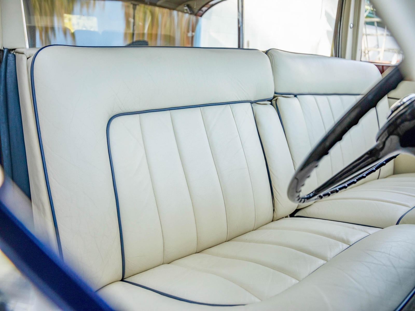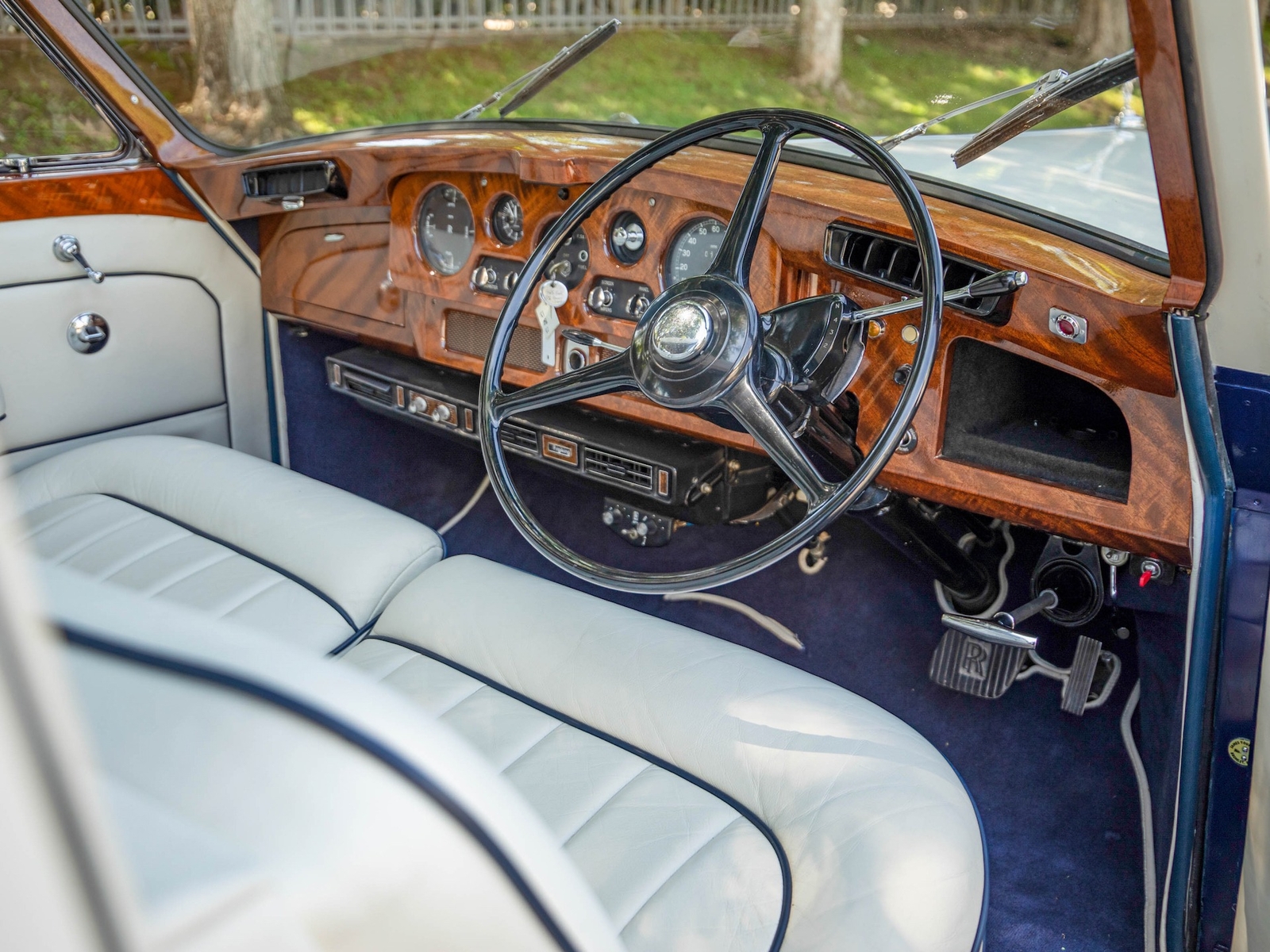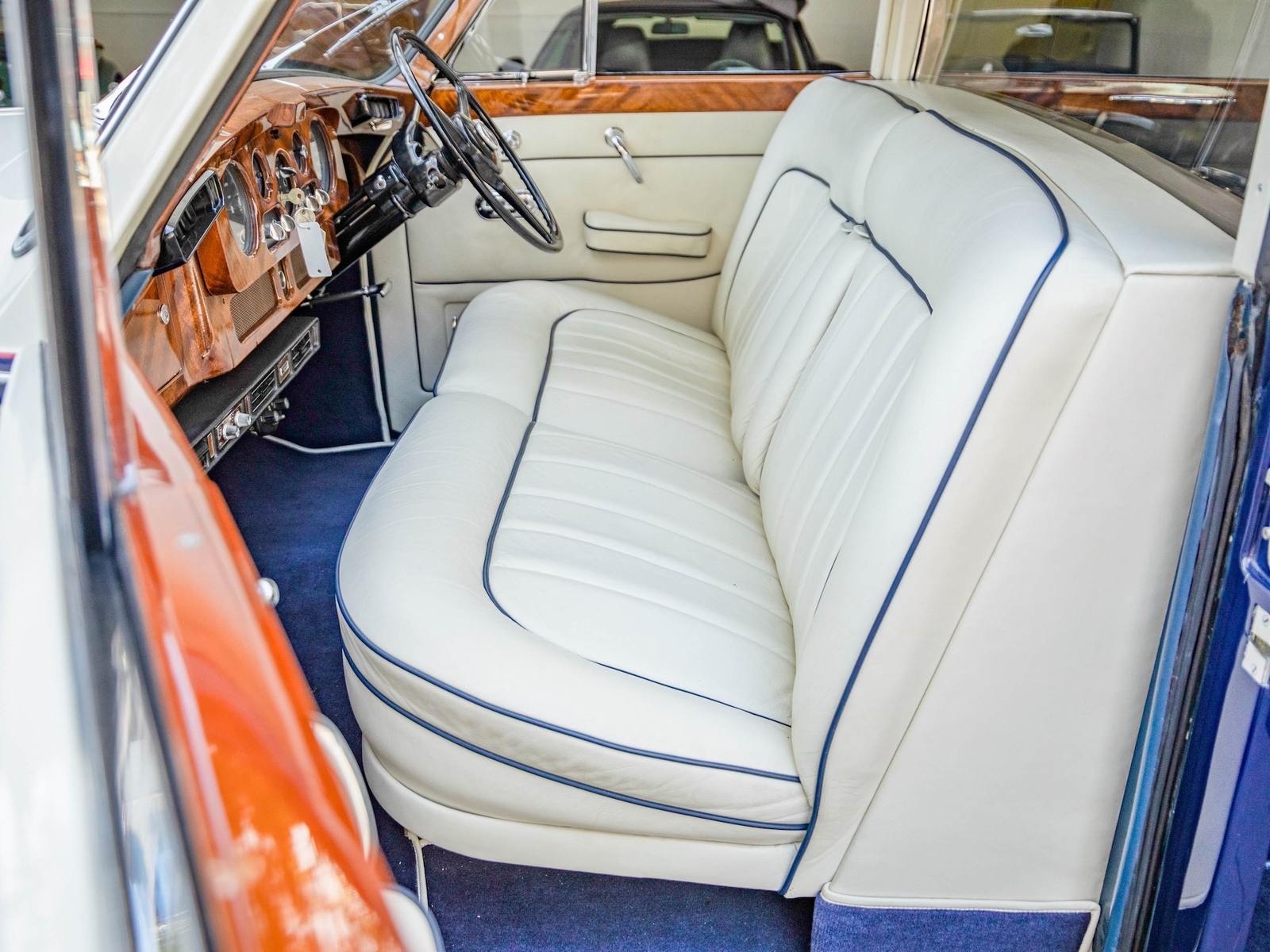 The body was liveried for Swinging London, in ivory white and royal blue with panels of decorative sham cane. In this form it surely turned heads at the 1965 Earls Court Motor Show, as is noted on both its build sheet and in Rolls-Royce Foundation records; a book published by its later home, Californias Behring Collection, notes it received a bronze medal at the show. Afterward it was delivered to the original owner B.P. Jenks, of Astbury Hall in Bridgnorth, Shropshire. At one point it was used as the basis for a Top Marques 1/43-scale model.