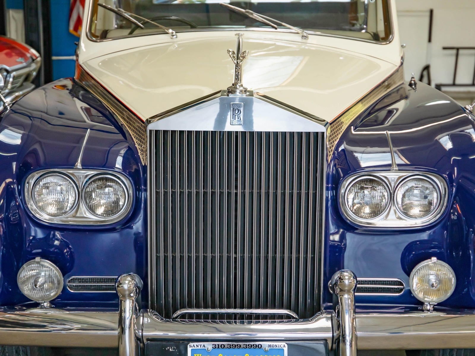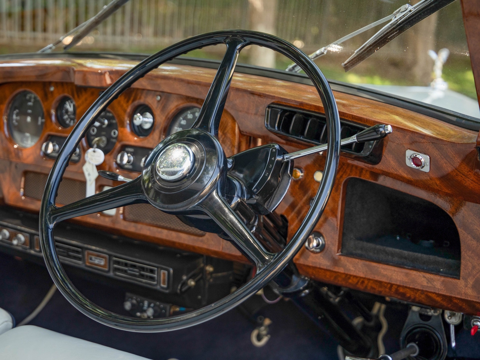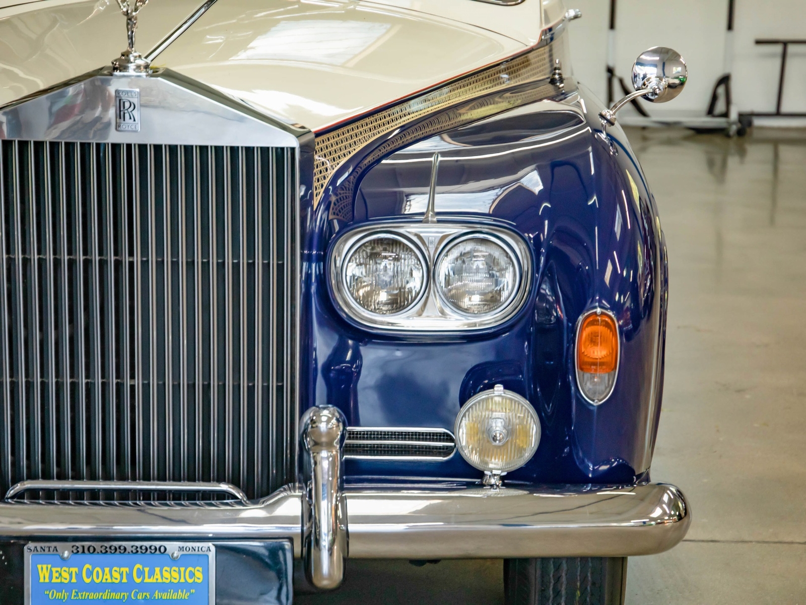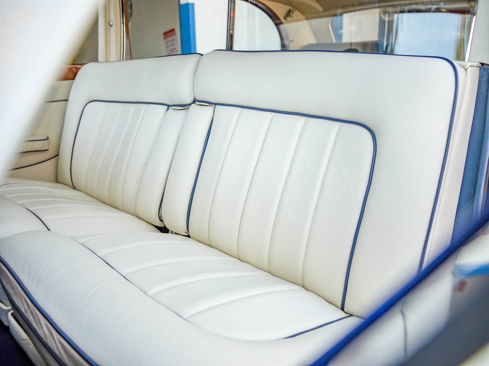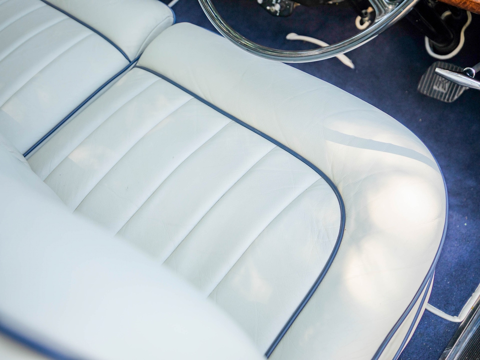 The body was liveried for Swinging London, in ivory white and royal blue with panels of decorative sham cane. In this form it surely turned heads at the 1965 Earls Court Motor Show, as is noted on both its build sheet and in Rolls-Royce Foundation records; a book published by its later home, Californias Behring Collection, notes it received a bronze medal at the show. Afterward it was delivered to the original owner B.P. Jenks, of Astbury Hall in Bridgnorth, Shropshire. At one point it was used as the basis for a Top Marques 1/43-scale model.