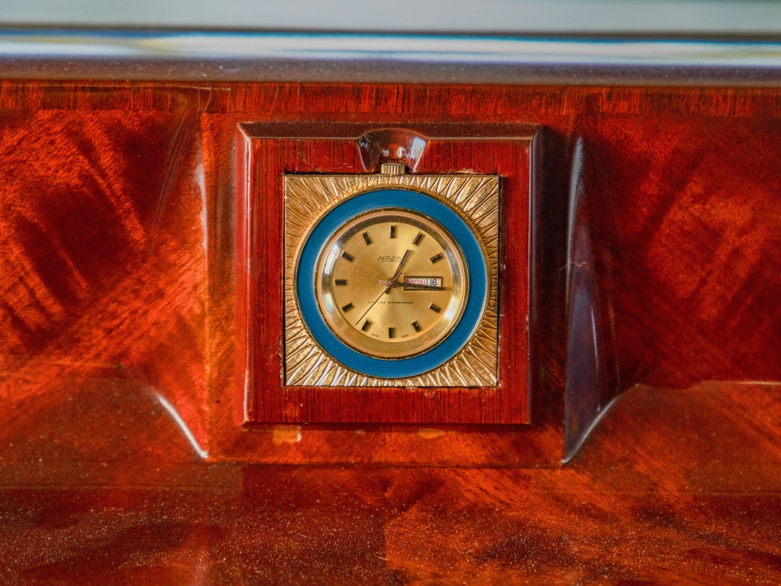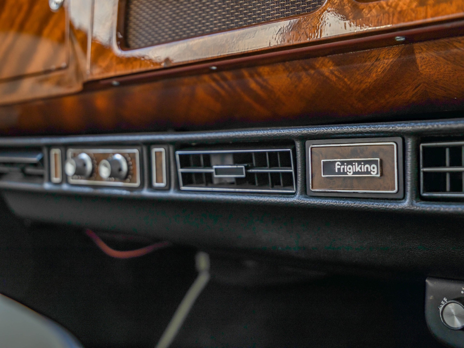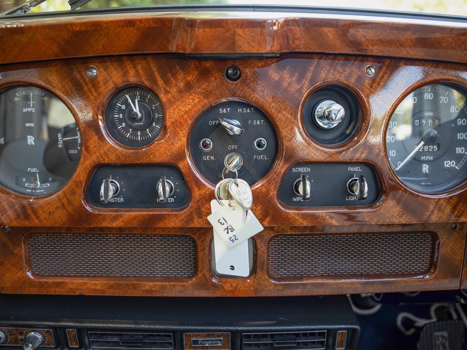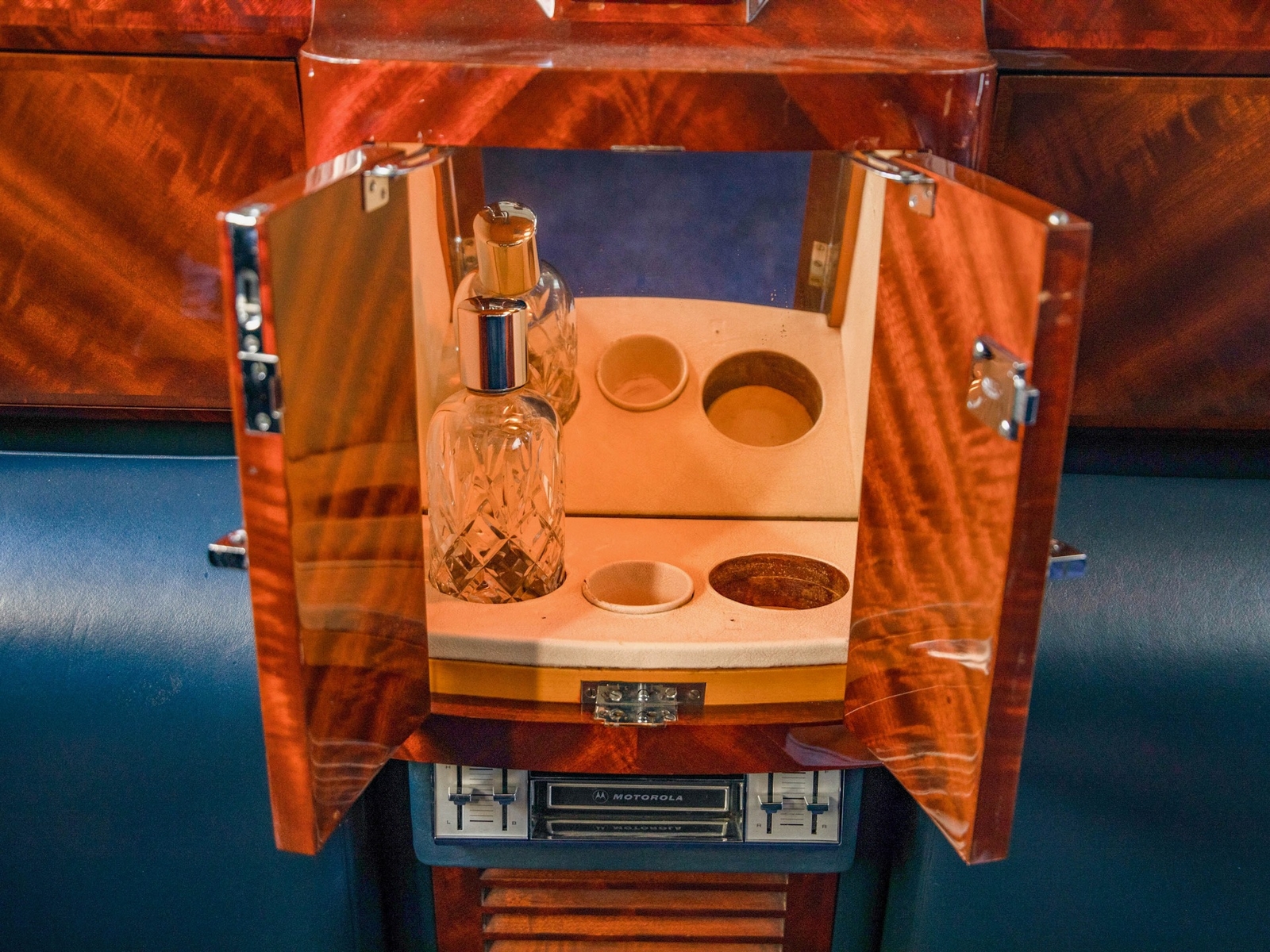 James Young produced 11 open-drive Sedanca de Ville bodies for Phantom V chassis, most of them variants of the coachbuilders PV22 or PV23 touring limousines. The example shown here, chassis number 5VE21, was the only car built to the Sedanca de Ville version of design number PV15, a limousine with a somewhat more formal roofline and a true seven-passenger interior. As the car has a rather early body, number 9053, on a later Phantom V chassis, it is believed that the coachwork may have been built as a standard limousine and then converted by James Young to a limousine de Ville for mounting on chassis number 5VE21. Lavish appointments included a leather-upholstered rear compartment with power-adjustable seat, facing a lighted bar, Mazal clock, and Motorola tape deck, as well as dual front and rear air conditioning systems.