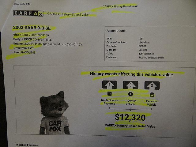 You are viewing a Very nice Low mileage Hard to find 2003 Saab 9-3 SE with Sports Package! Only 47K Actual Miles! Only ONE OWNER Since new! Well maintained! Carfax NO accidents! Priced to sell fast!