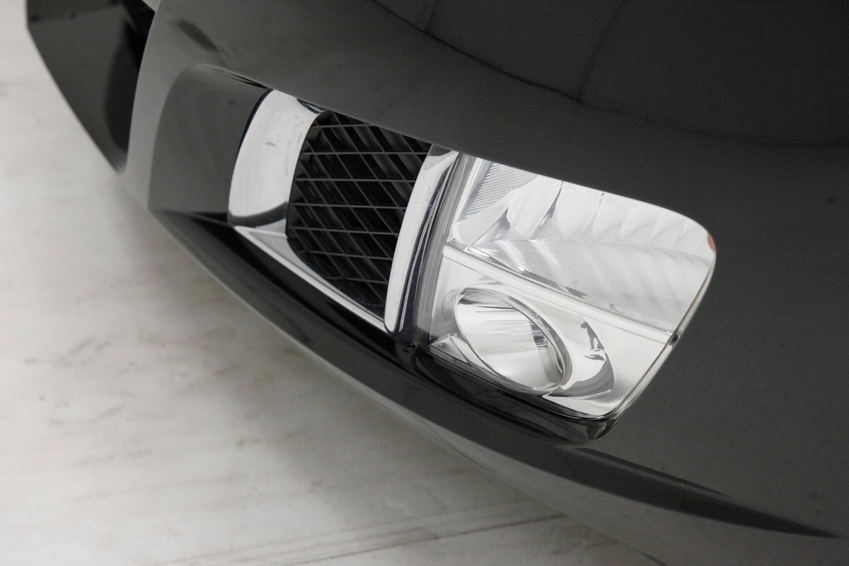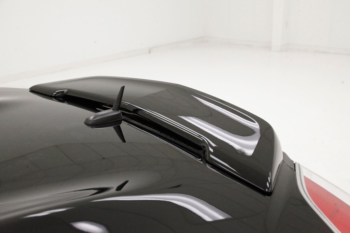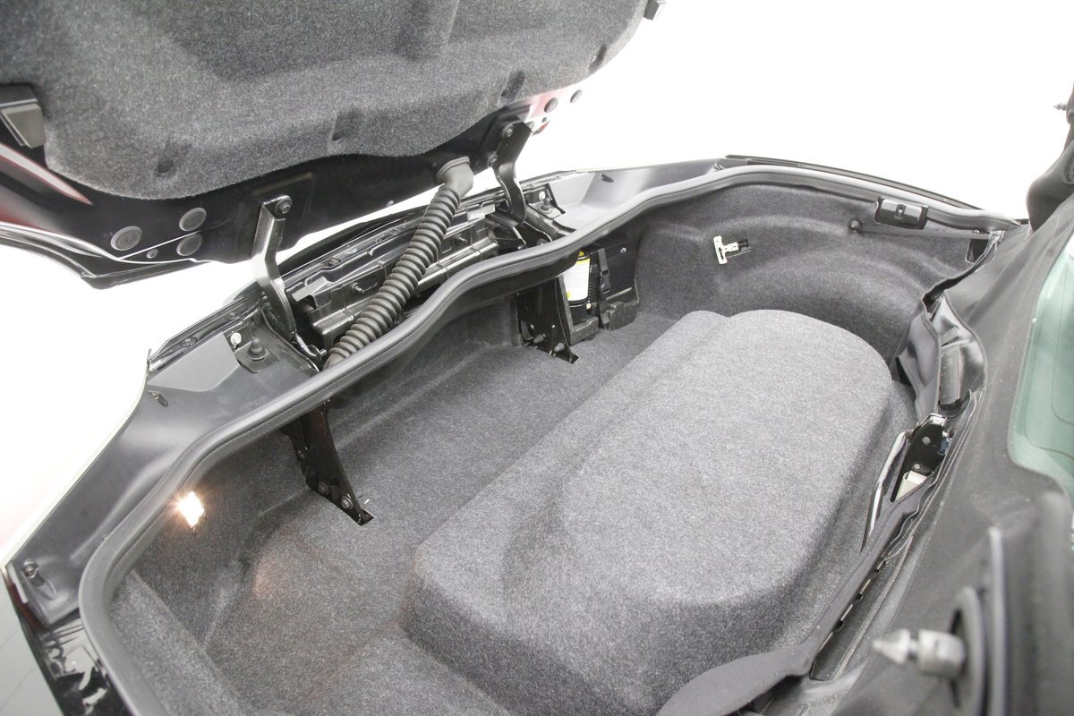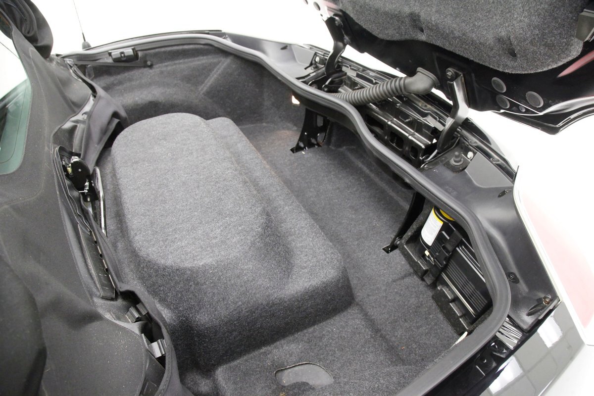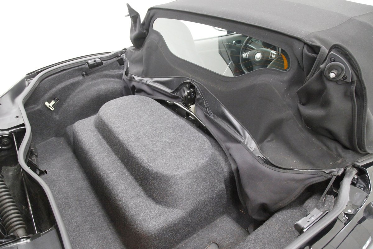 Sinister black is seen draping all the panels on this car's exterior, and all appears in like new condition. A black colored cloth convertible top is fully operational, albeit manually, and keeps the blacked out theme going just perfectly. This fast little bean shaped aero car sports a few throwbacks to the classics. One that is very obvious would be the rear deck bump ups that begin as headrests then slowly get thinner where they die before the rear spoiler. The other is a vertical vent v-cove in the front quarter just behind the wheel well, which harkens back to the early corvettes. A vented hopped rear spoiler, and low front opened bumper/chin splitter are also seen. 18-inch chrome wheels wearing the factory installed tires are noted all around and give this car an even more sporty look with the larger wheels.