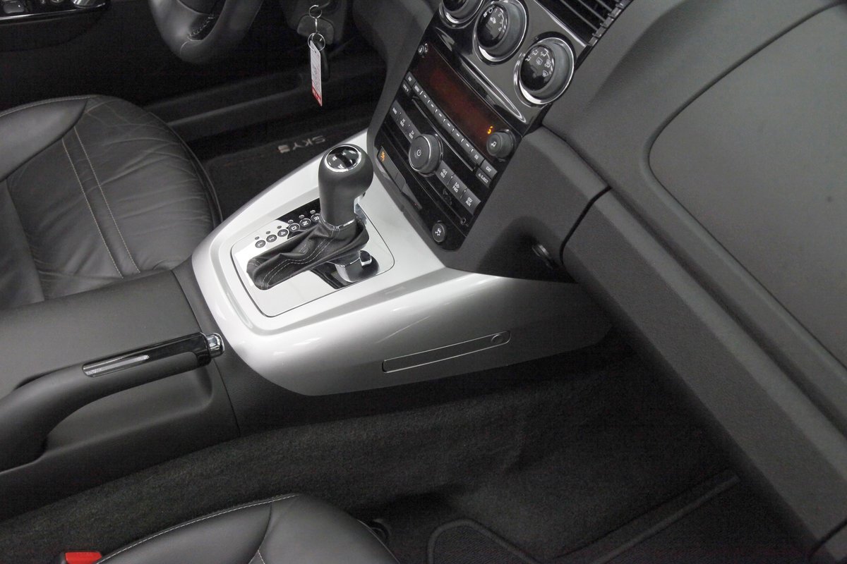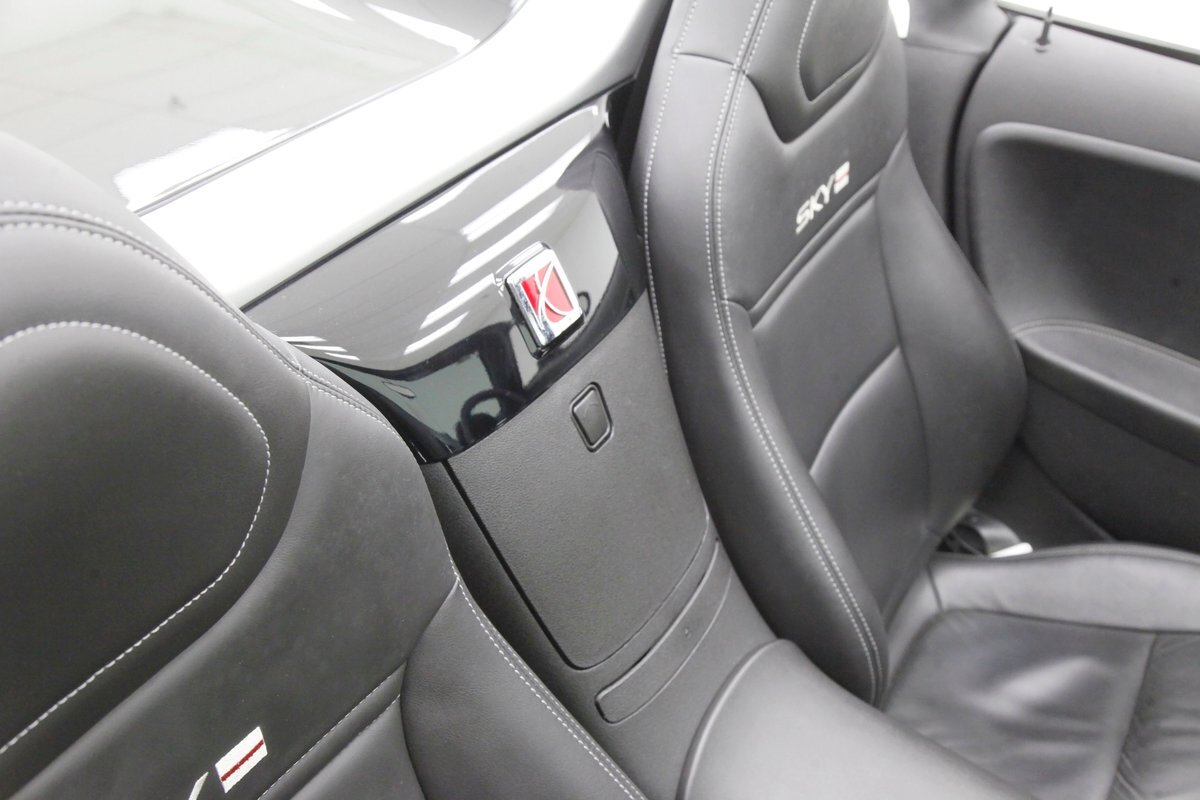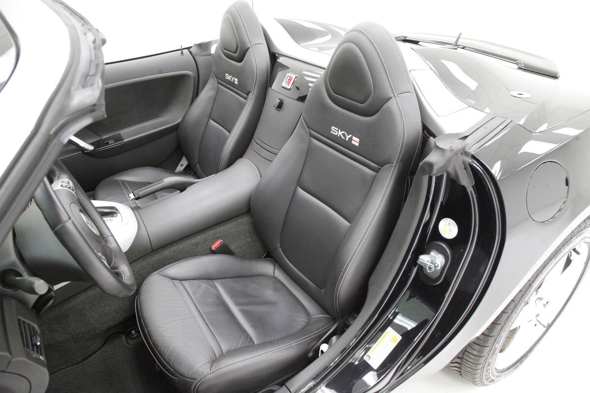 Lowering the top, we can examine the interior, which is draped in charcoal black leather with white stitched bolsters and molded in headrests, and black inserts emblazoned with embroidered white SKY logos. The door panels carry over the same motif and appear virtually showroom new. A simple 3-gauge cluster barreled curved eyebrow shaped dash fronts a two toned black and red leather steering wheel, and shows RPM, speed, and temperature analog gauges. The center of the dash presents climate controls, and an AM/FM/6 disc CD radio with a 6 speaker audiophile's dream sound system. A chrome trimmed and leather booted shifter is within the center console along with the parking brake. Sport alloy pedals hang above black carpeting which floods the floors. Power driver's seat, ABS, power mirrors, power locks, and power windows, plus air conditioning are installed options on this car.