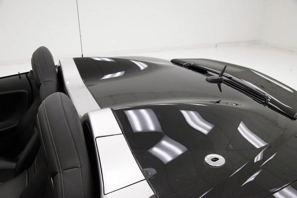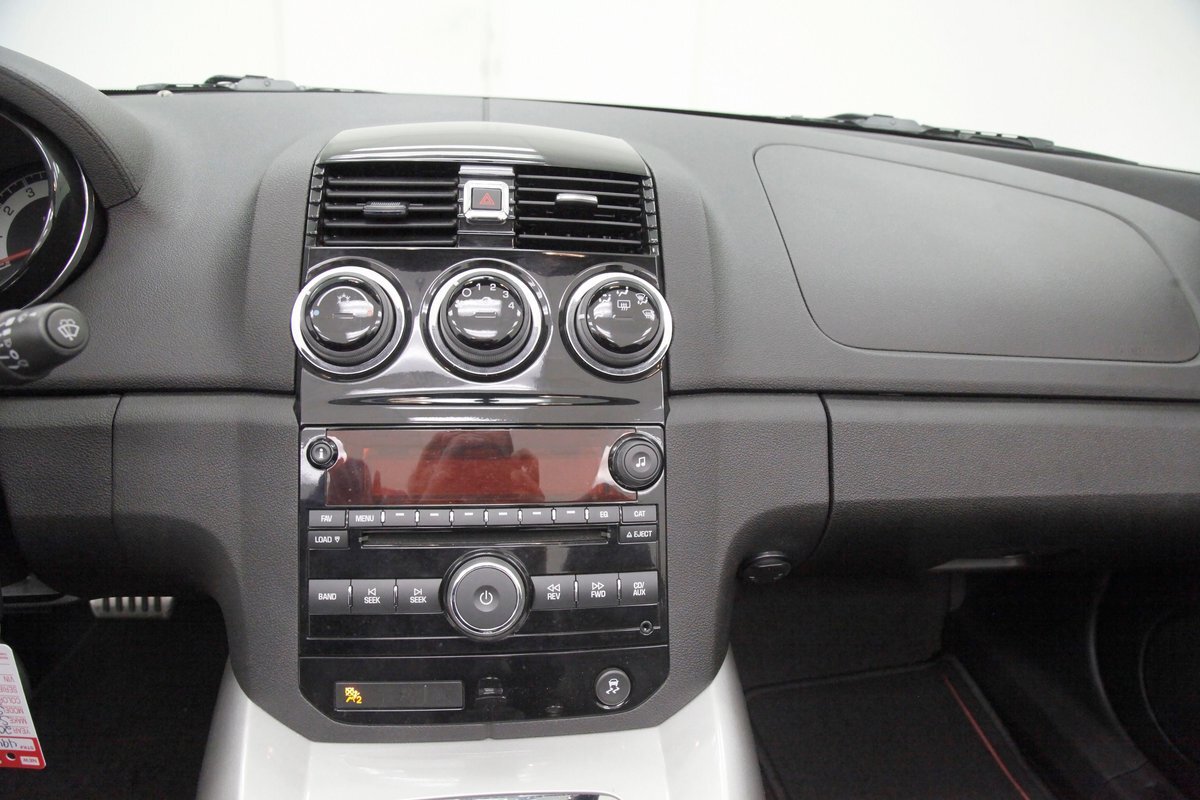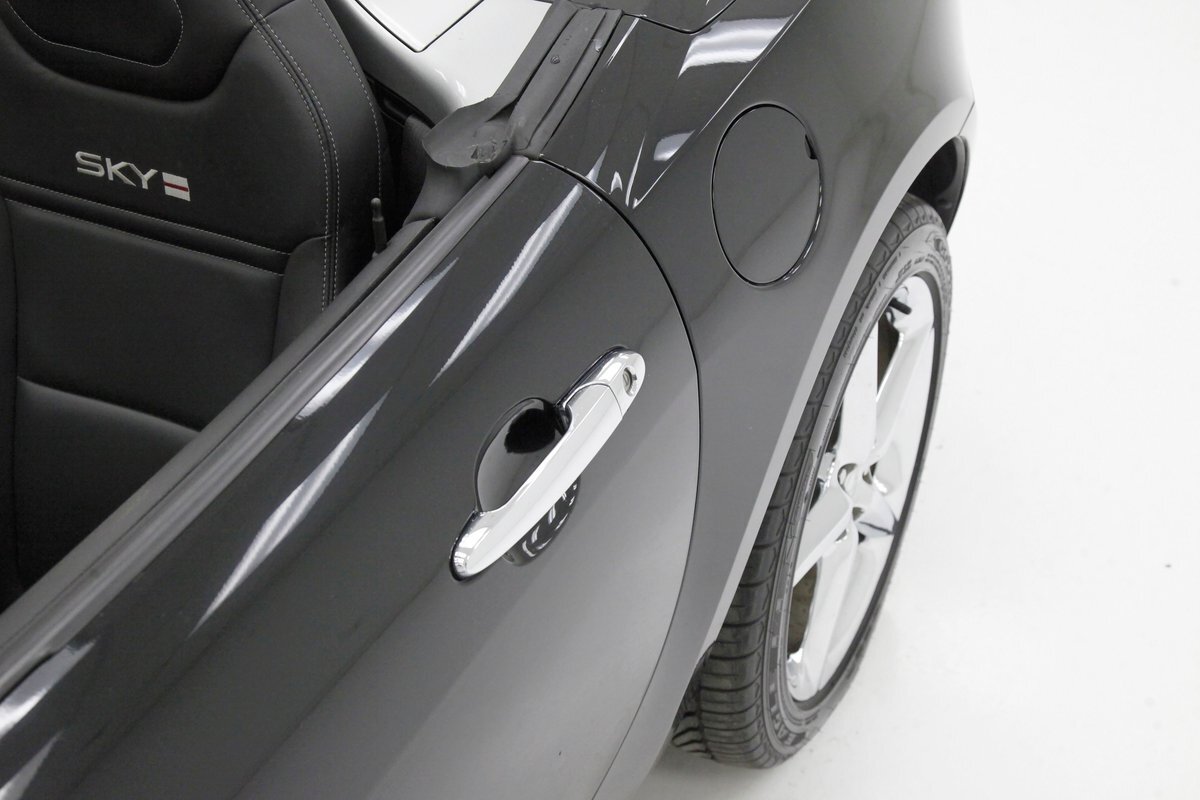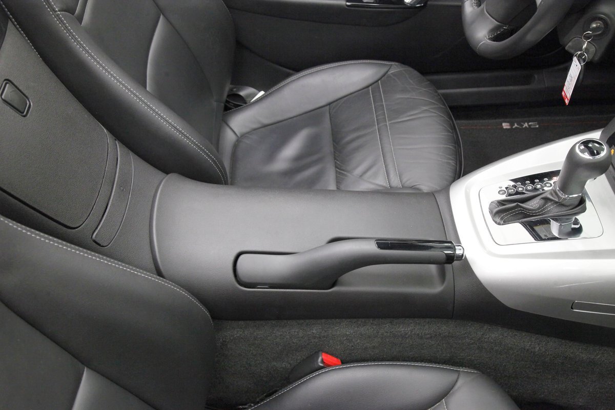 Lowering the top, we can examine the interior, which is draped in charcoal black leather with white stitched bolsters and molded in headrests, and black inserts emblazoned with embroidered white SKY logos. The door panels carry over the same motif and appear virtually showroom new. A simple 3-gauge cluster barreled curved eyebrow shaped dash fronts a two toned black and red leather steering wheel, and shows RPM, speed, and temperature analog gauges. The center of the dash presents climate controls, and an AM/FM/6 disc CD radio with a 6 speaker audiophile's dream sound system. A chrome trimmed and leather booted shifter is within the center console along with the parking brake. Sport alloy pedals hang above black carpeting which floods the floors. Power driver's seat, ABS, power mirrors, power locks, and power windows, plus air conditioning are installed options on this car.