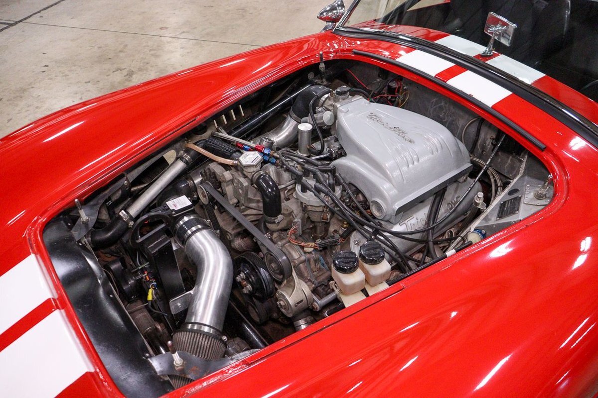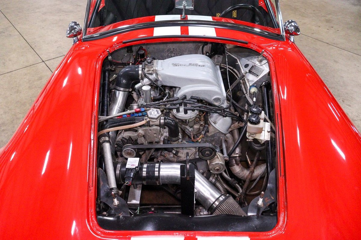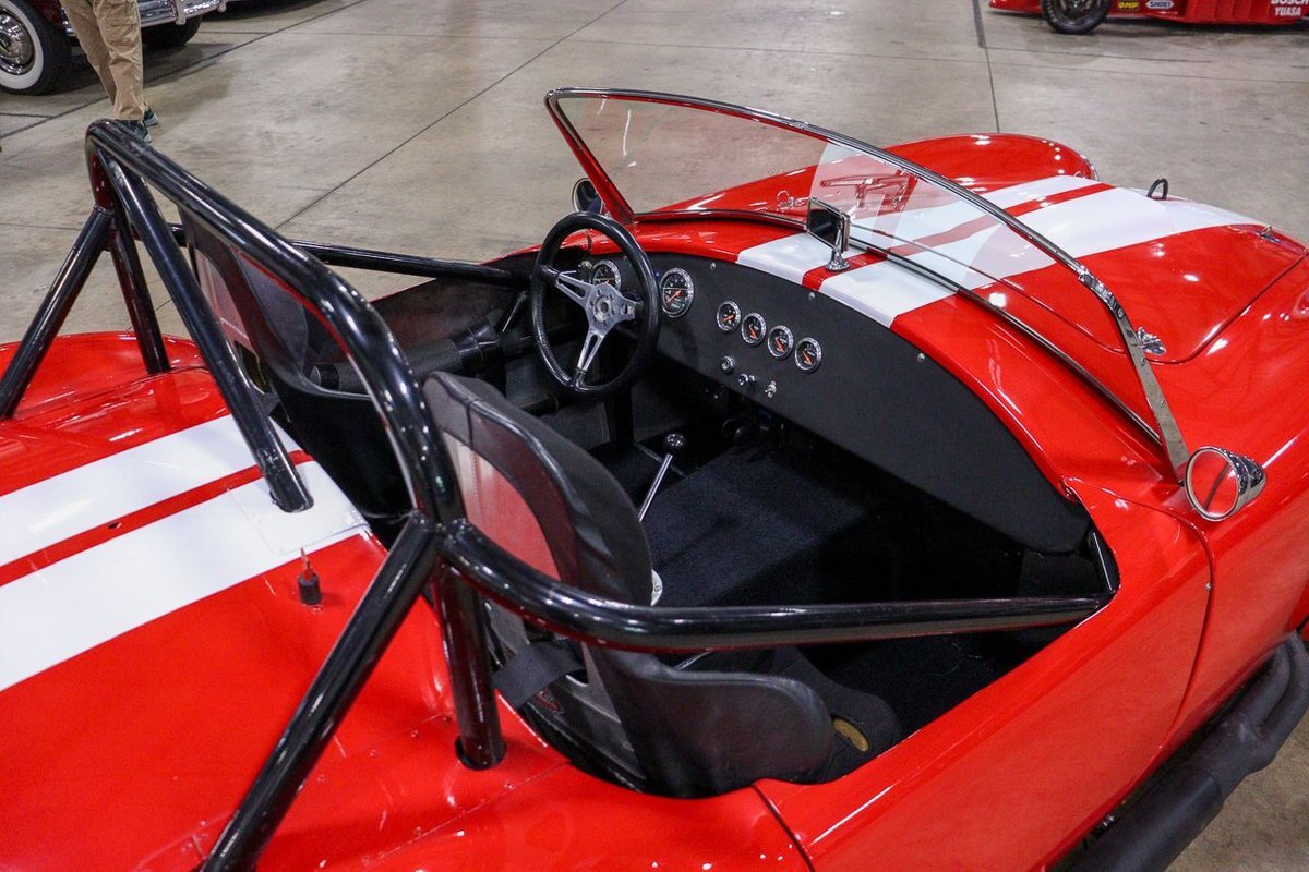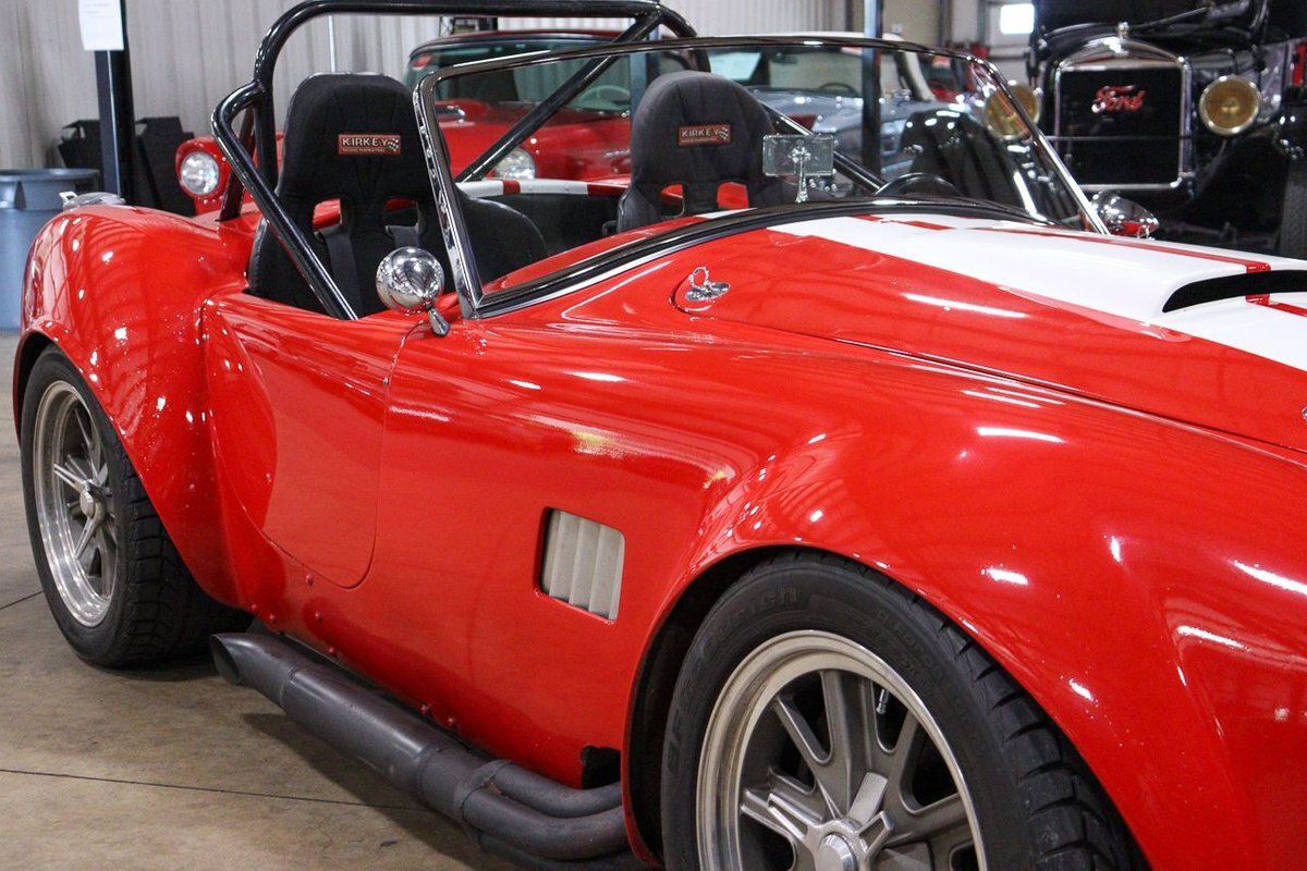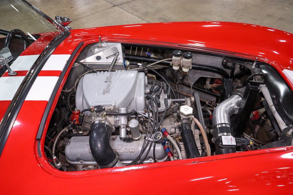 A fuel-injected 5.0-liter Ford V8 sends power to the rear wheels through a Tremec T5 five-speed manual transmission and has been fitted with a Trick Flow Stage 1 roller camshaft, cylinder heads, and upper intake manifold plenum. The fiberglass body is finished in red with white center stripes, and additional features include 17" Haibrand-style wheels, a roll cage, and a three-link 8.8 rear axle with 3.27:1 gears in addition to aluminum Kirkey racing seats, OMP harnesses, AutoMeter instrumentation, Talbot Berlin-style mirrors, and a Le Mans-style fuel filler. Vehicle has a Michigan Title and is listed as a 1965 Shelby Cobra
