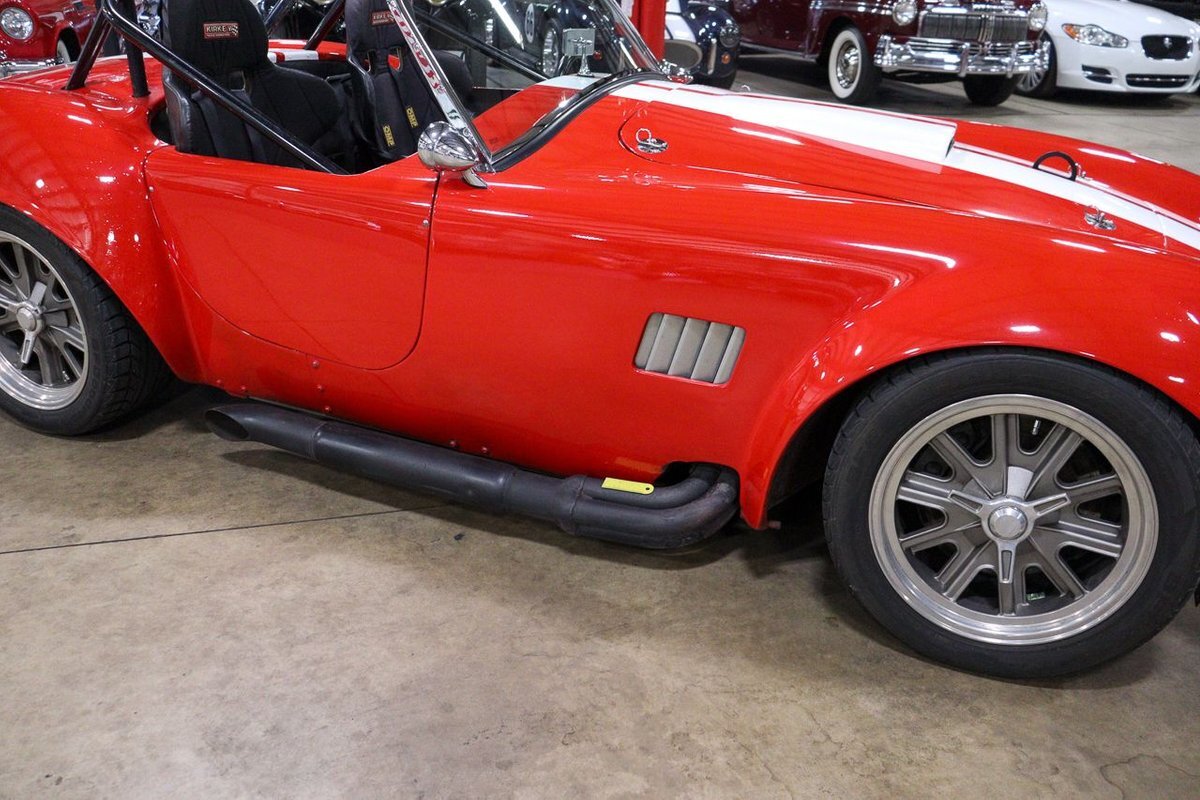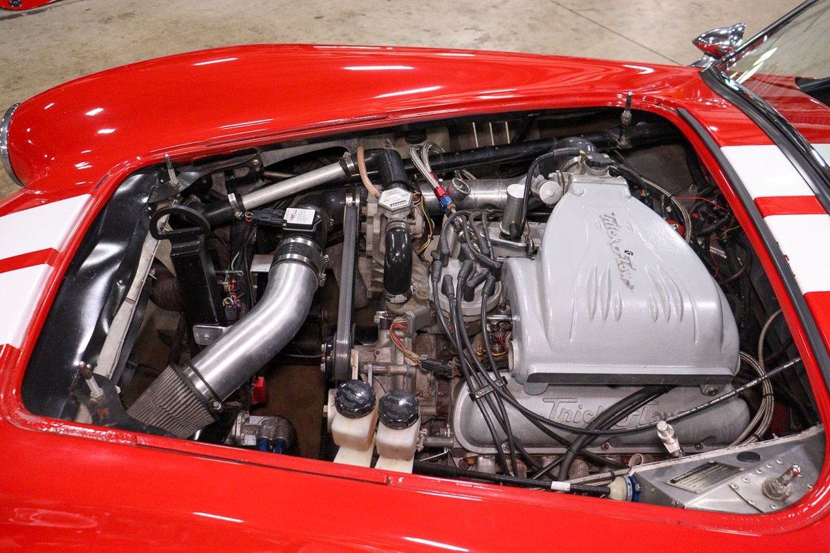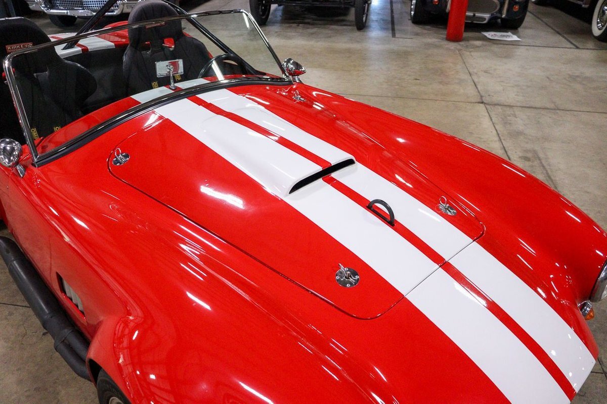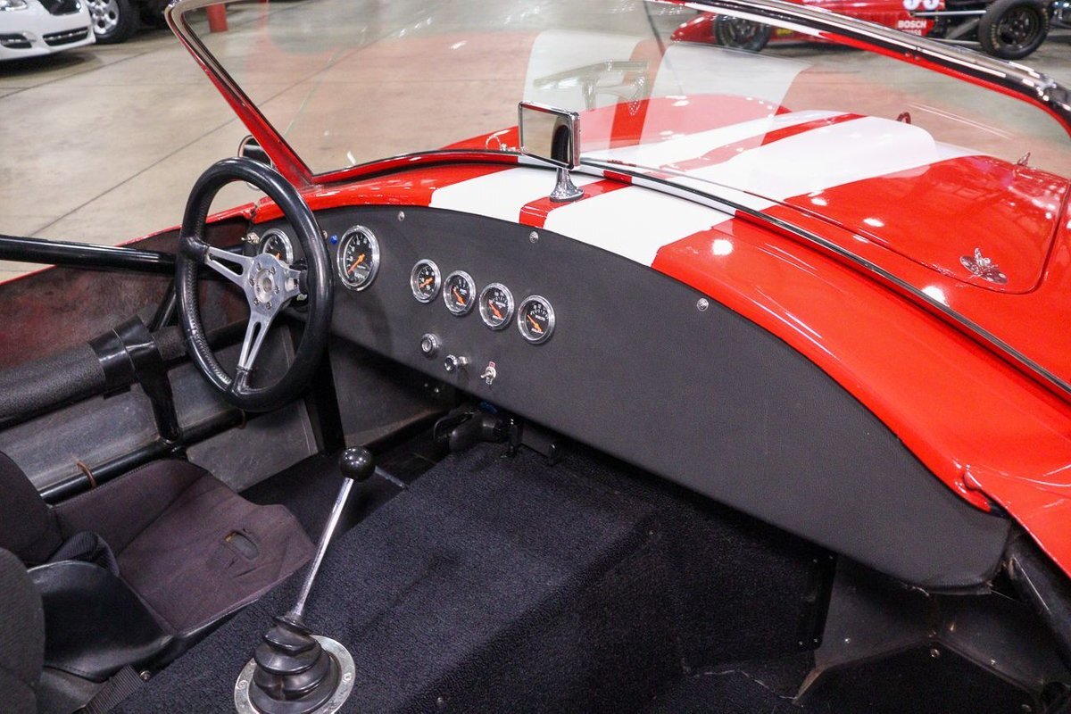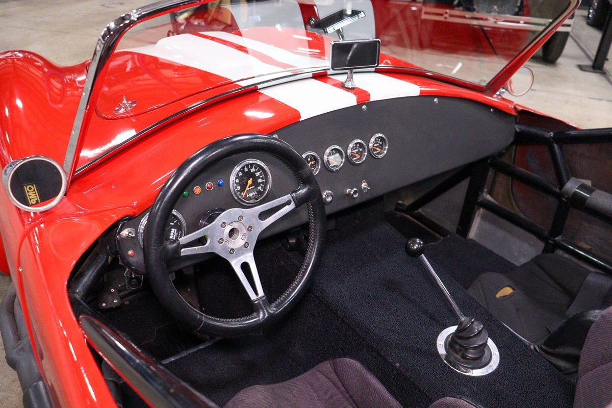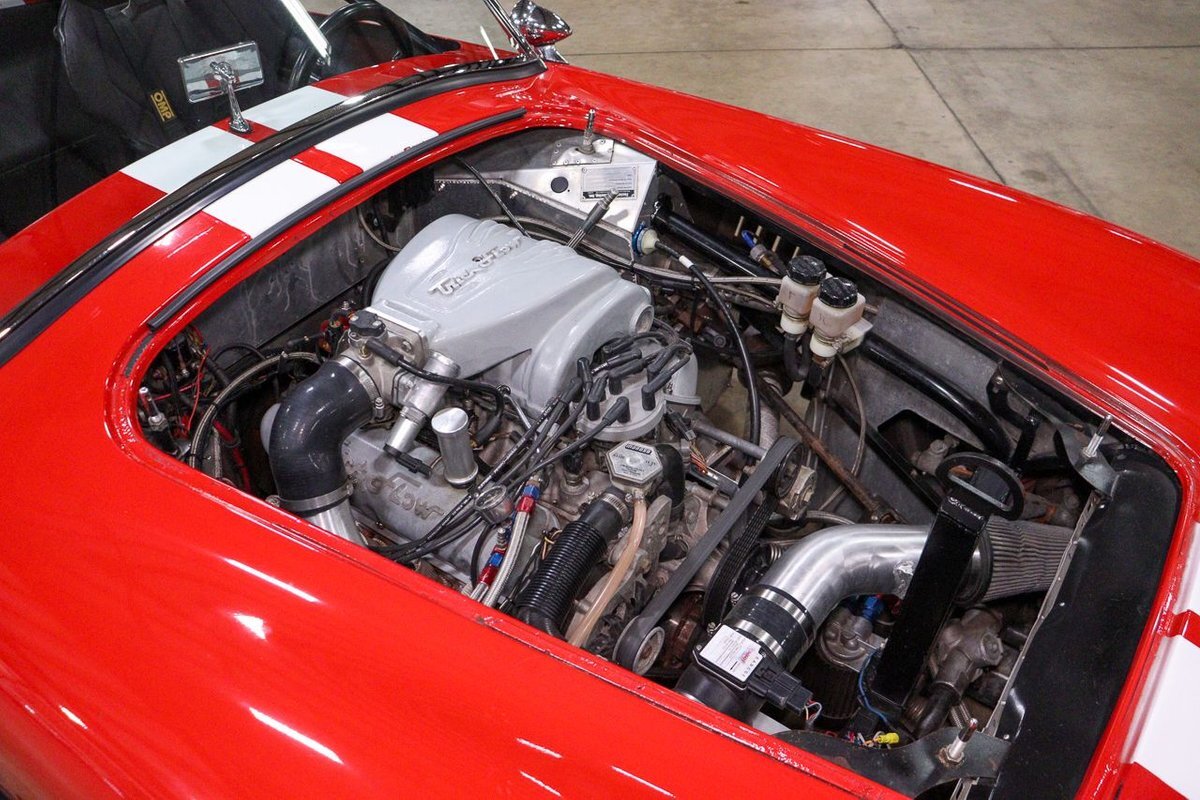 A fuel-injected 5.0-liter Ford V8 sends power to the rear wheels through a Tremec T5 five-speed manual transmission and has been fitted with a Trick Flow Stage 1 roller camshaft, cylinder heads, and upper intake manifold plenum. The fiberglass body is finished in red with white center stripes, and additional features include 17" Haibrand-style wheels, a roll cage, and a three-link 8.8 rear axle with 3.27:1 gears in addition to aluminum Kirkey racing seats, OMP harnesses, AutoMeter instrumentation, Talbot Berlin-style mirrors, and a Le Mans-style fuel filler. Vehicle has a Michigan Title and is listed as a 1965 Shelby Cobra