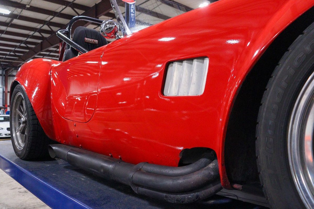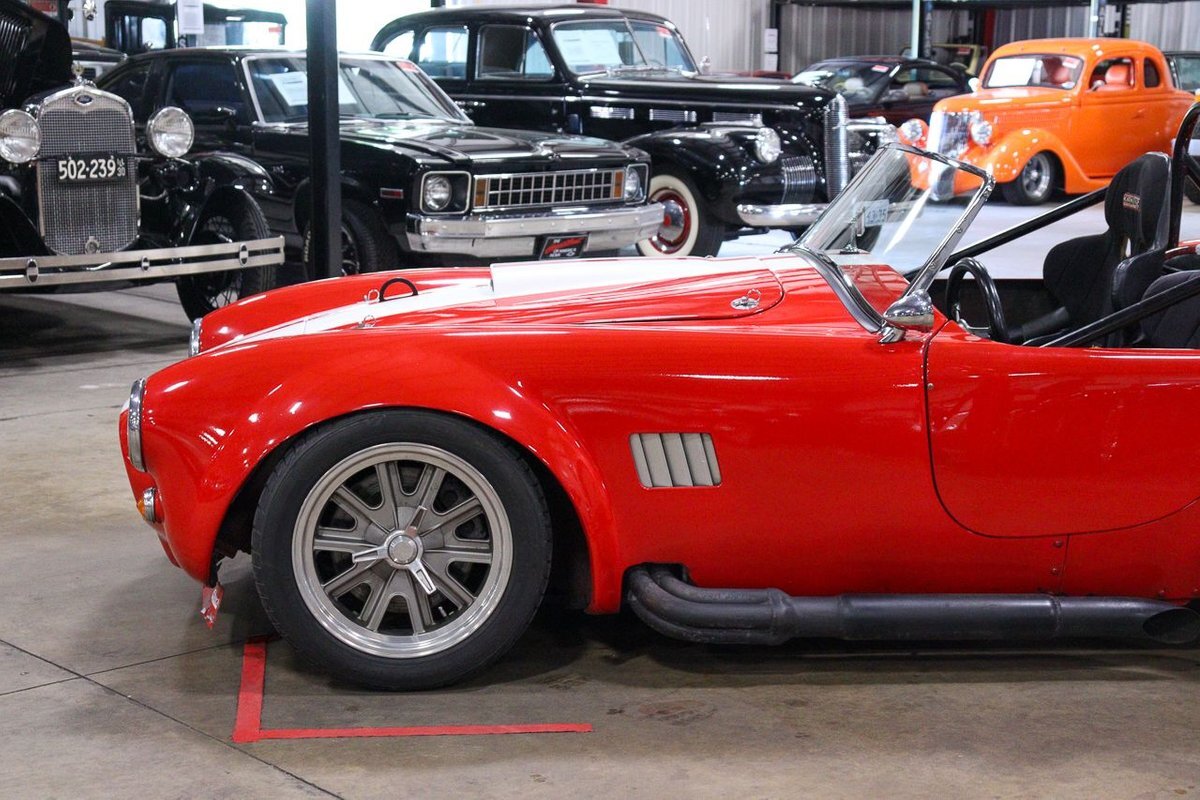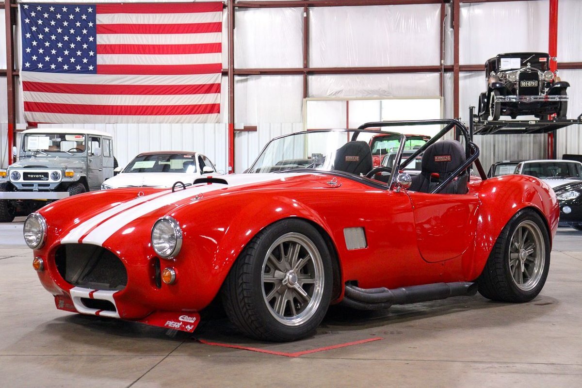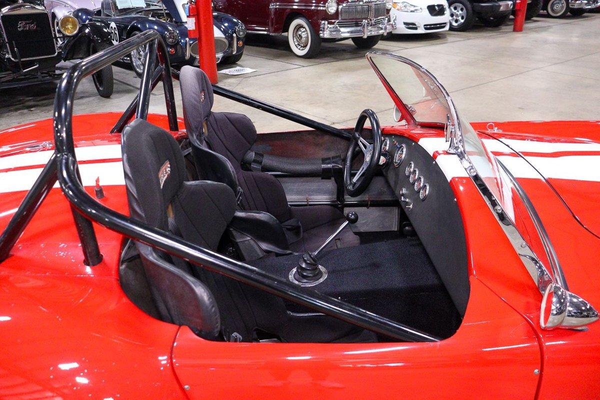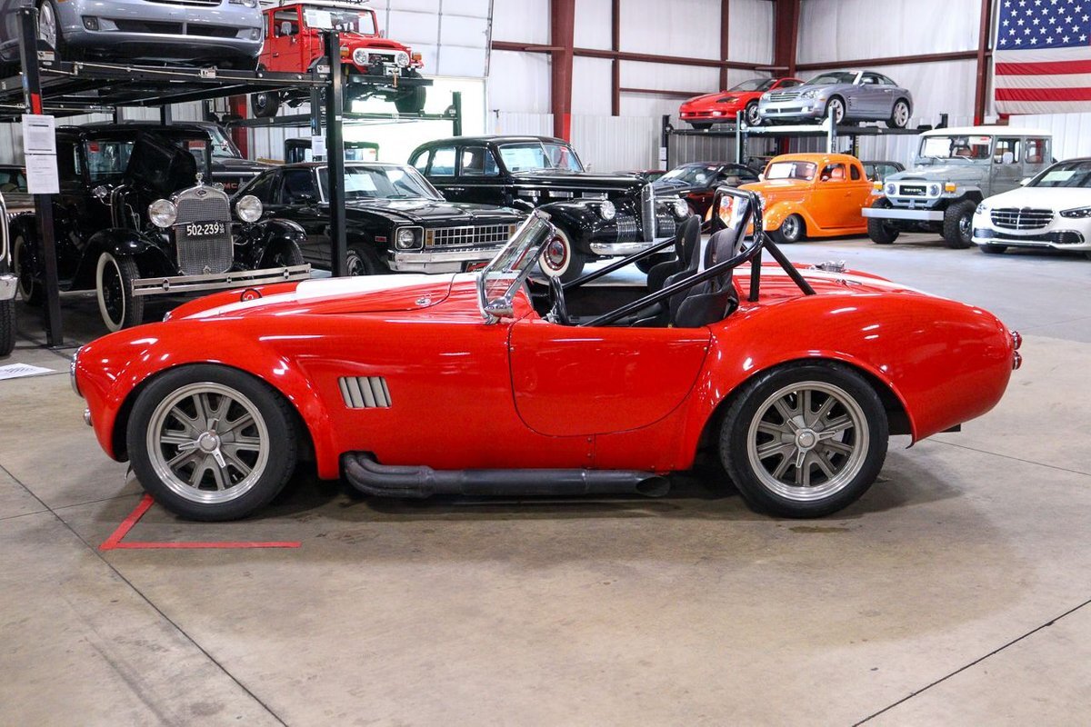 A fuel-injected 5.0-liter Ford V8 sends power to the rear wheels through a Tremec T5 five-speed manual transmission and has been fitted with a Trick Flow Stage 1 roller camshaft, cylinder heads, and upper intake manifold plenum. The fiberglass body is finished in red with white center stripes, and additional features include 17" Haibrand-style wheels, a roll cage, and a three-link 8.8 rear axle with 3.27:1 gears in addition to aluminum Kirkey racing seats, OMP harnesses, AutoMeter instrumentation, Talbot Berlin-style mirrors, and a Le Mans-style fuel filler. Vehicle has a Michigan Title and is listed as a 1965 Shelby Cobra
