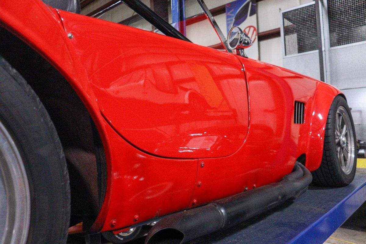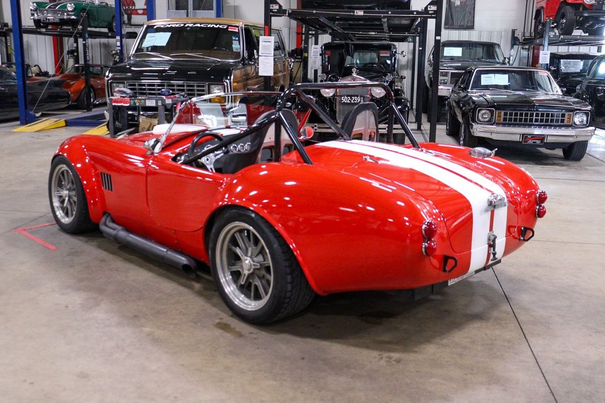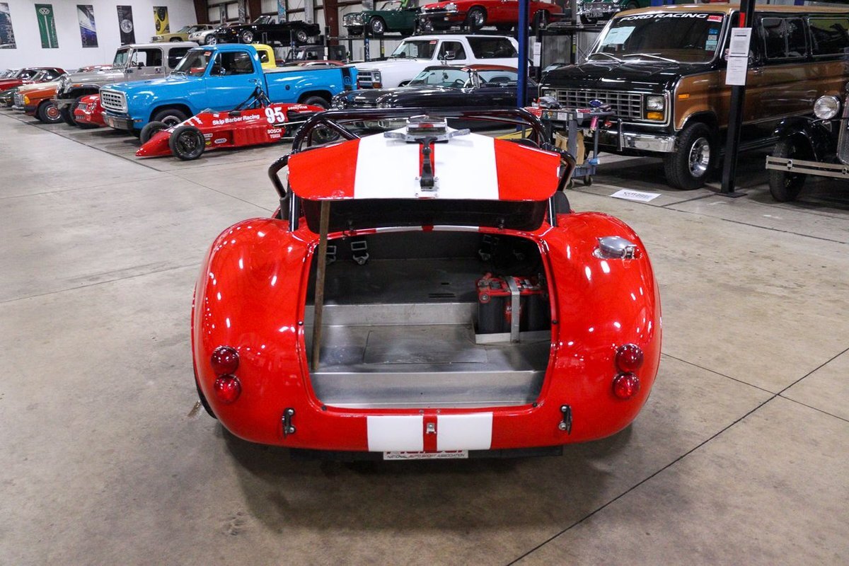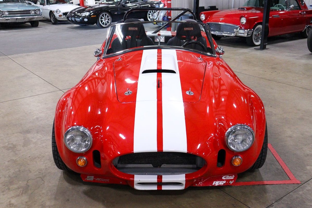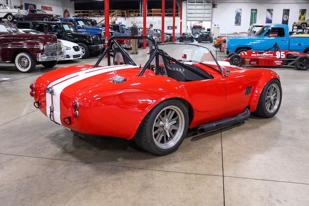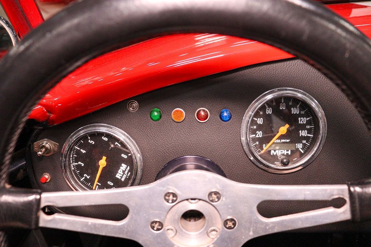A fuel-injected 5.0-liter Ford V8 sends power to the rear wheels through a Tremec T5 five-speed manual transmission and has been fitted with a Trick Flow Stage 1 roller camshaft, cylinder heads, and upper intake manifold plenum. The fiberglass body is finished in red with white center stripes, and additional features include 17" Haibrand-style wheels, a roll cage, and a three-link 8.8 rear axle with 3.27:1 gears in addition to aluminum Kirkey racing seats, OMP harnesses, AutoMeter instrumentation, Talbot Berlin-style mirrors, and a Le Mans-style fuel filler. Vehicle has a Michigan Title and is listed as a 1965 Shelby Cobra