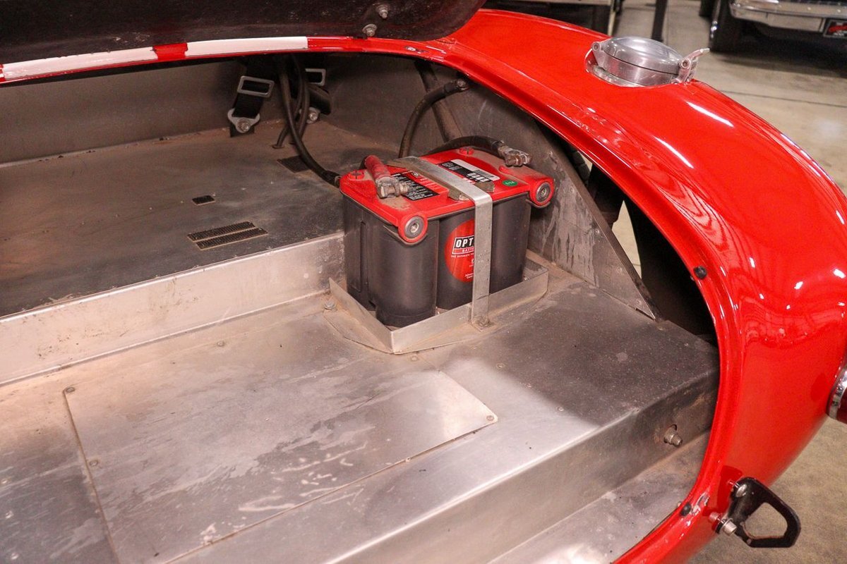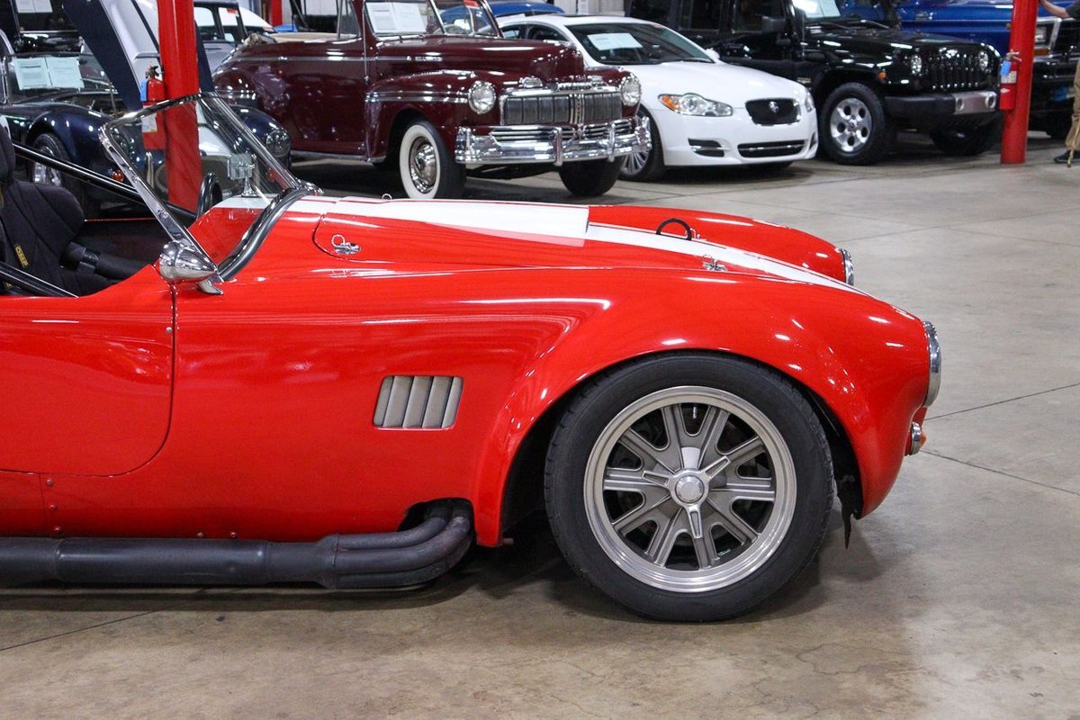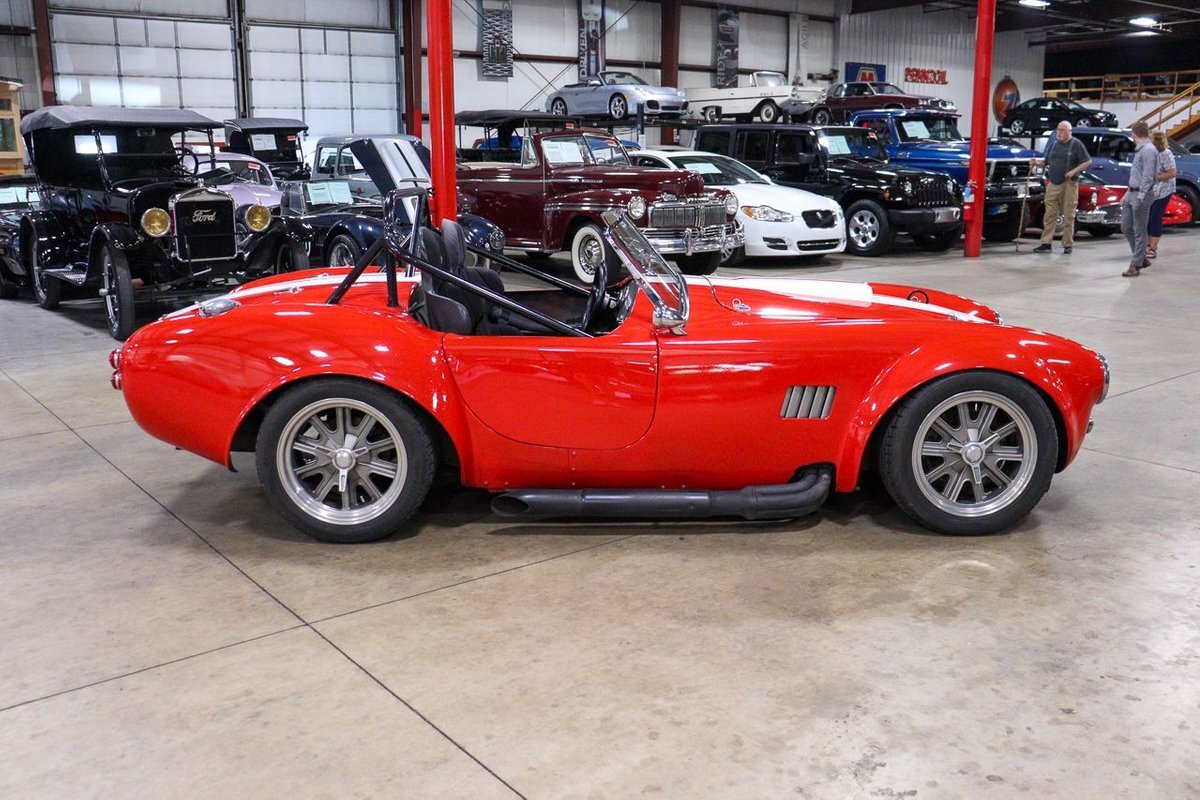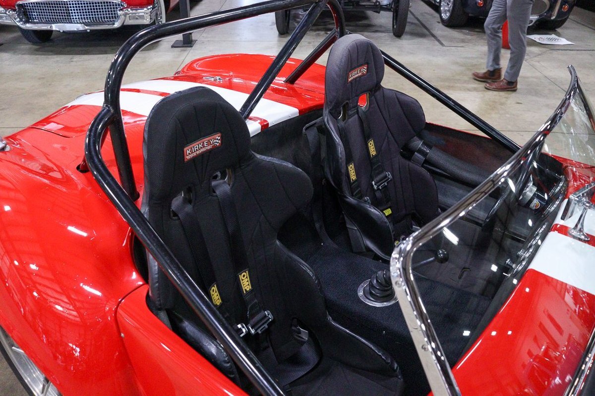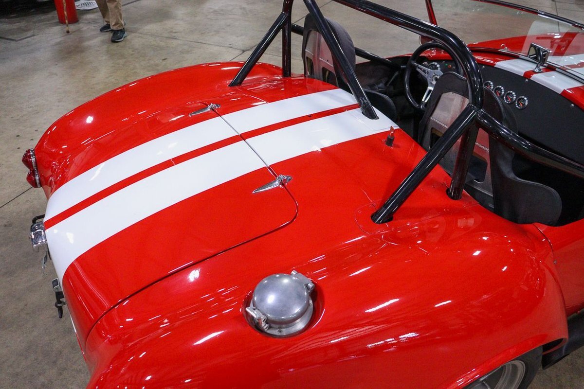 A fuel-injected 5.0-liter Ford V8 sends power to the rear wheels through a Tremec T5 five-speed manual transmission and has been fitted with a Trick Flow Stage 1 roller camshaft, cylinder heads, and upper intake manifold plenum. The fiberglass body is finished in red with white center stripes, and additional features include 17" Haibrand-style wheels, a roll cage, and a three-link 8.8 rear axle with 3.27:1 gears in addition to aluminum Kirkey racing seats, OMP harnesses, AutoMeter instrumentation, Talbot Berlin-style mirrors, and a Le Mans-style fuel filler. Vehicle has a Michigan Title and is listed as a 1965 Shelby Cobra