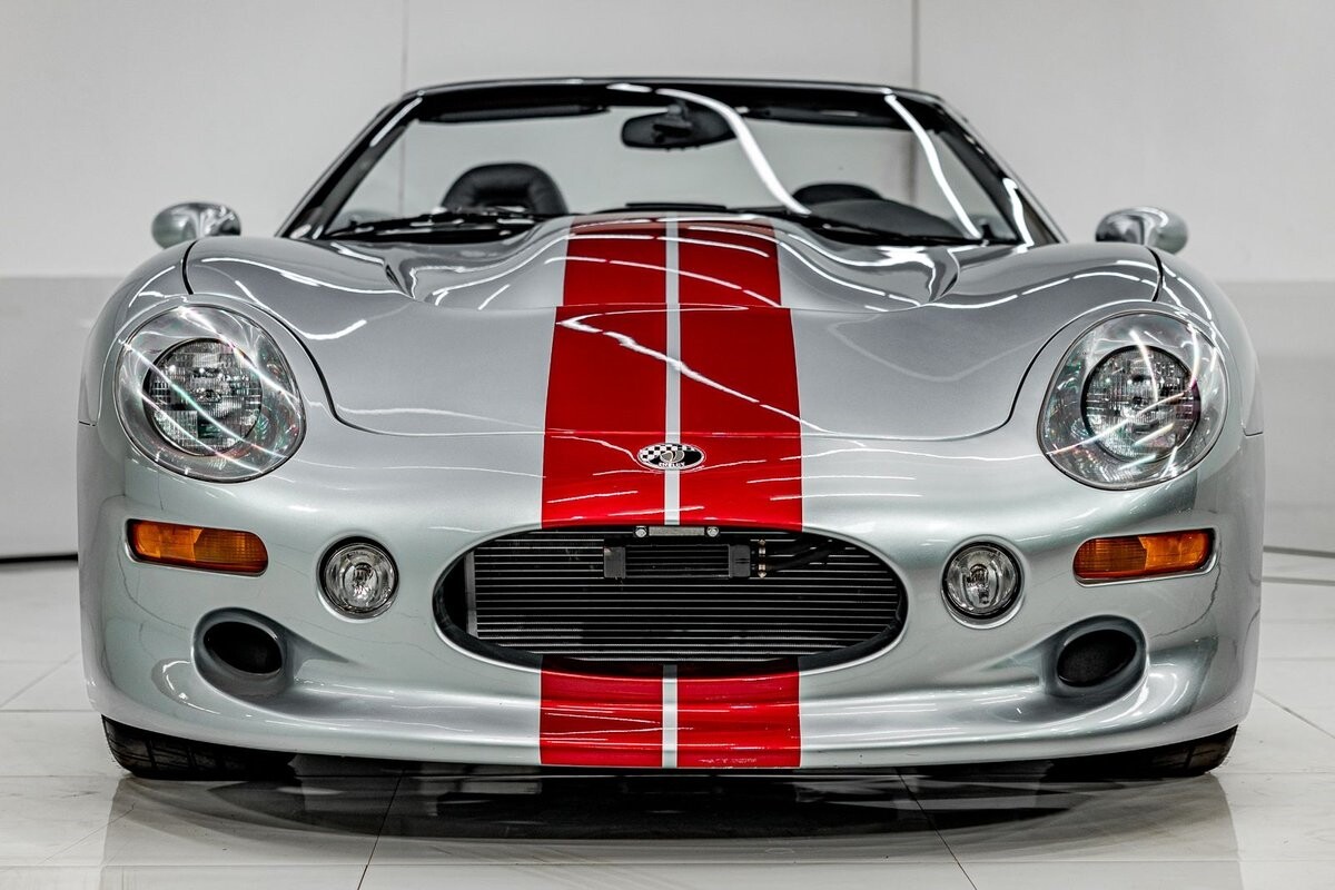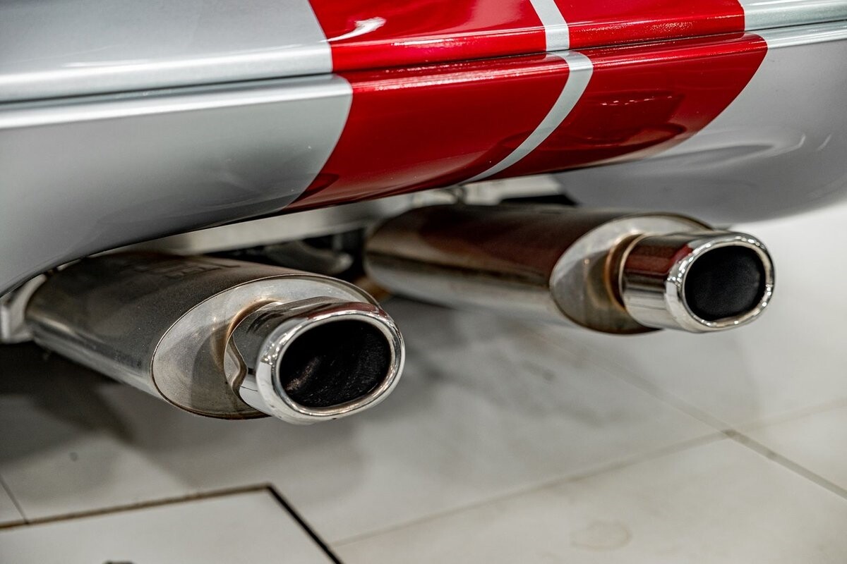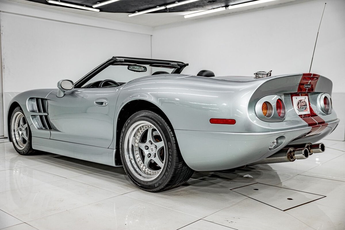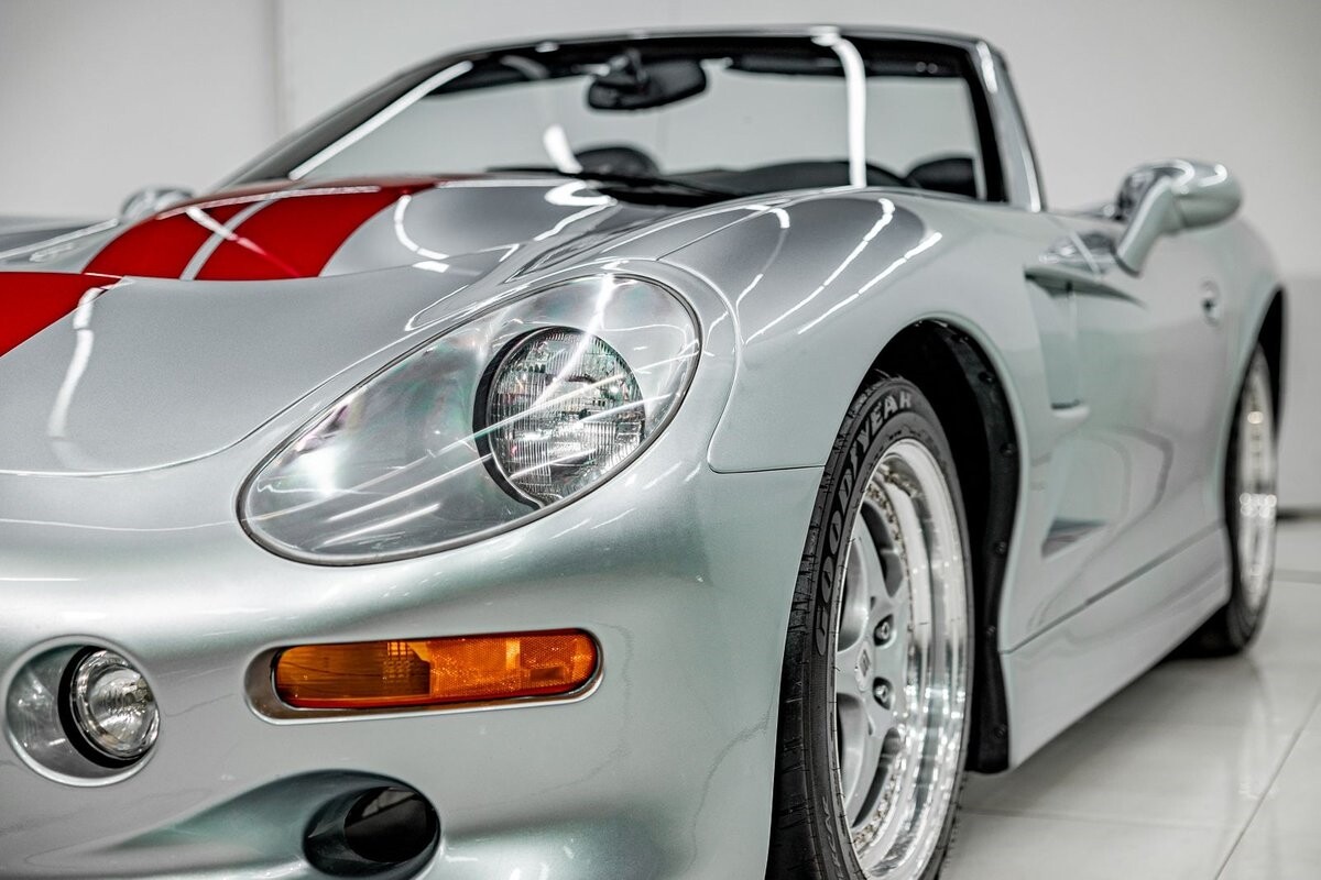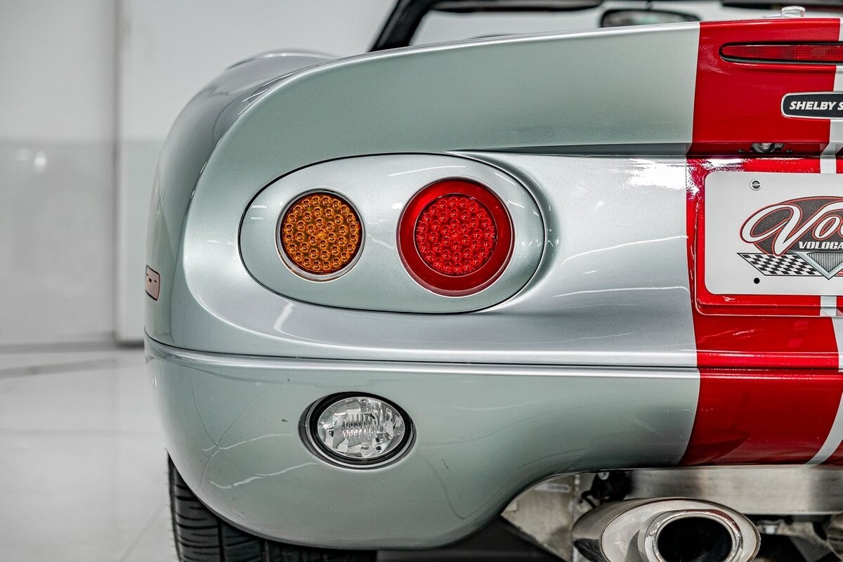 EXTERIOR: Finished in centennial silver with maroon optioned stripes. These cars are very distinct yet familiar looking. They have ties to Shelby's favorite cars like the Shelby Cobra, Dodge Viper, and Ford GT40. At first glance you're not sure what kind of car this is but when you take a closer look you see resemblances to those very vehicles. The paint is in excellent shape aside from a couple minor blemishes. There's a light scratch on the passenger side mirror cap and a slight crack in the paint on the driver rear quarter. You really have to look close to find it. The 18" wheels are a unique Shelby 2 piece finished in hyper silver centers with polished aluminum lips. They fit the aggressive stance of the car perfectly. The convertible top is black and a soft top. It is manually raised and lowered and hides nicely under the tonneau cover.