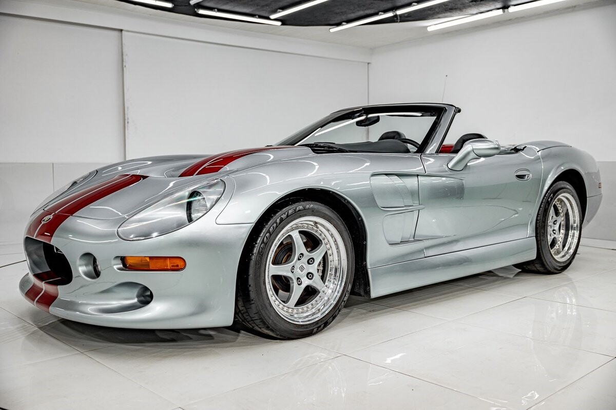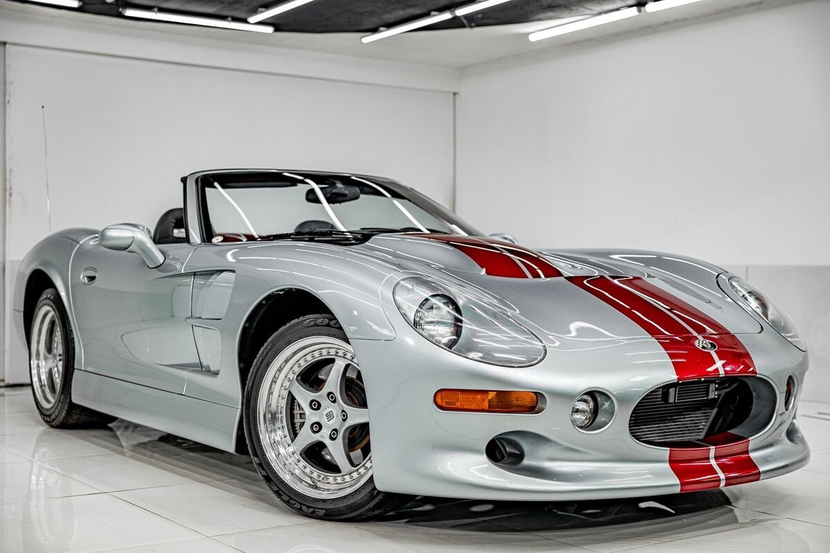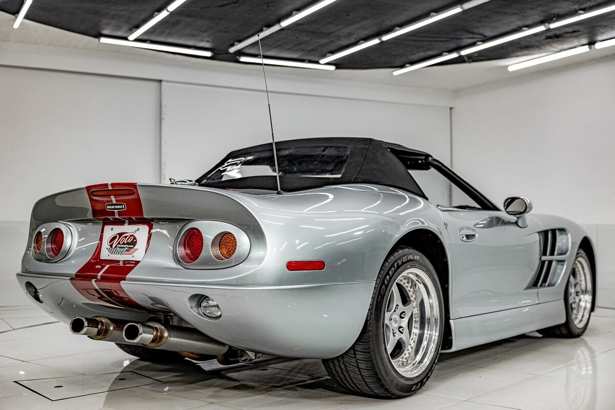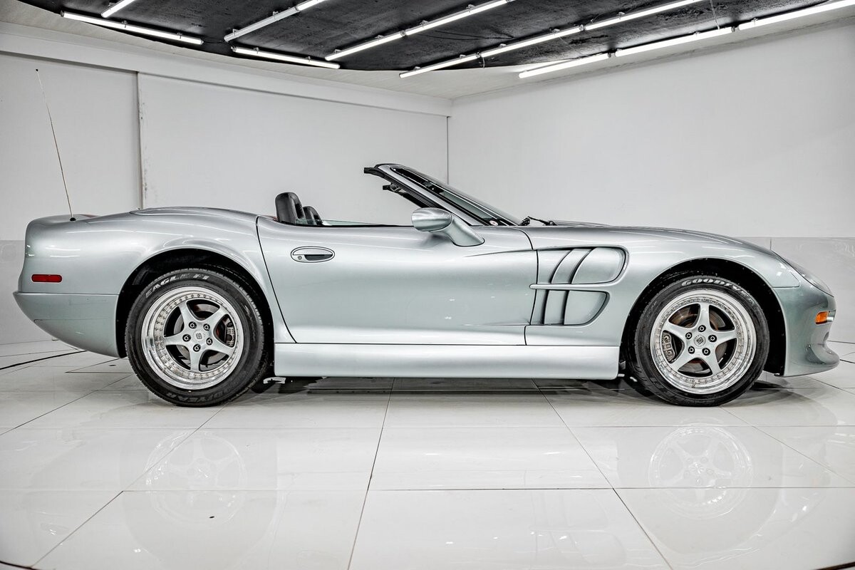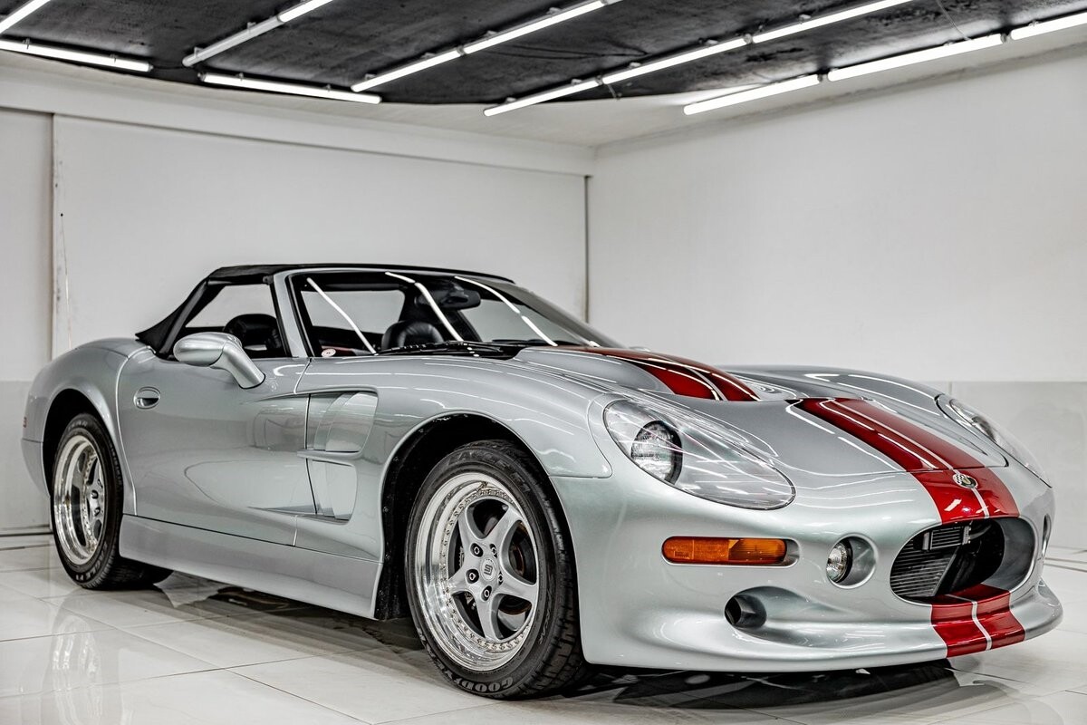 EXTERIOR: Finished in centennial silver with maroon optioned stripes. These cars are very distinct yet familiar looking. They have ties to Shelby's favorite cars like the Shelby Cobra, Dodge Viper, and Ford GT40. At first glance you're not sure what kind of car this is but when you take a closer look you see resemblances to those very vehicles. The paint is in excellent shape aside from a couple minor blemishes. There's a light scratch on the passenger side mirror cap and a slight crack in the paint on the driver rear quarter. You really have to look close to find it. The 18" wheels are a unique Shelby 2 piece finished in hyper silver centers with polished aluminum lips. They fit the aggressive stance of the car perfectly. The convertible top is black and a soft top. It is manually raised and lowered and hides nicely under the tonneau cover.