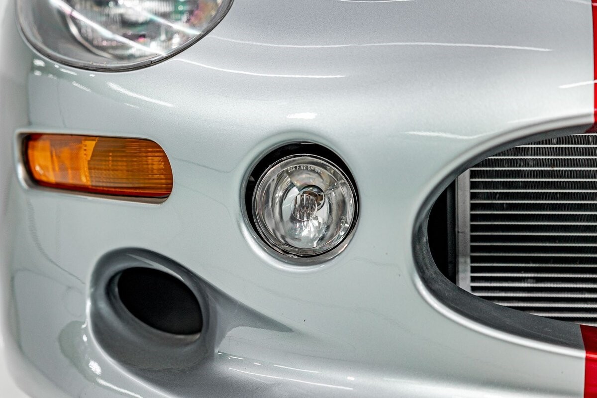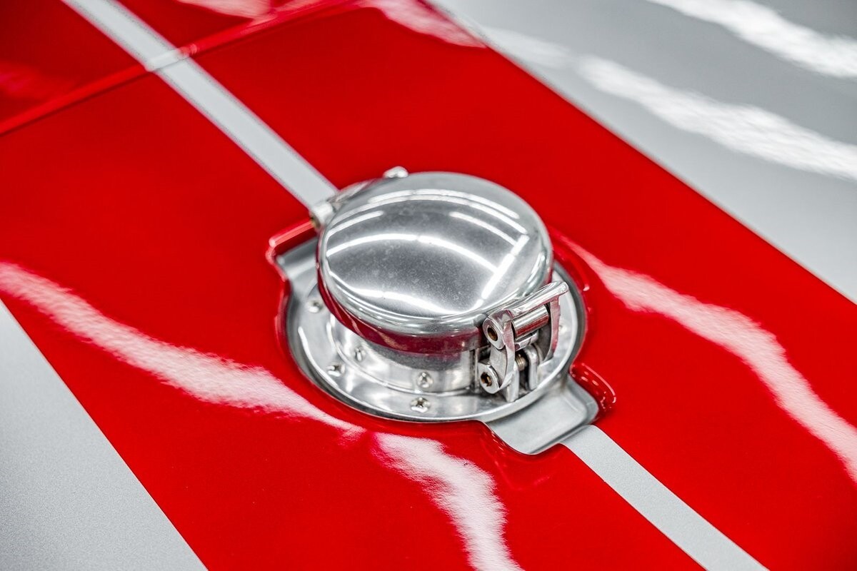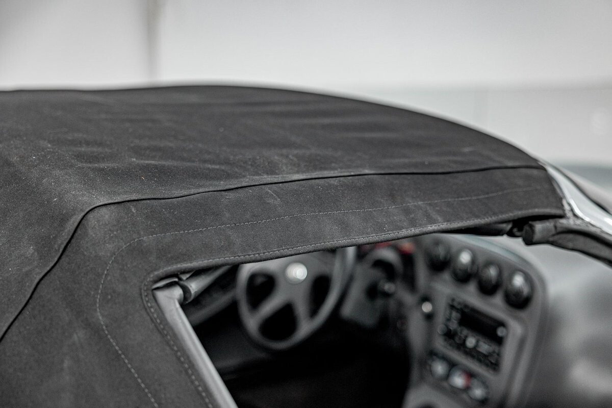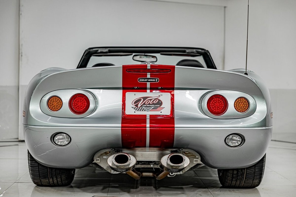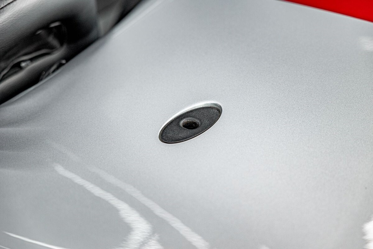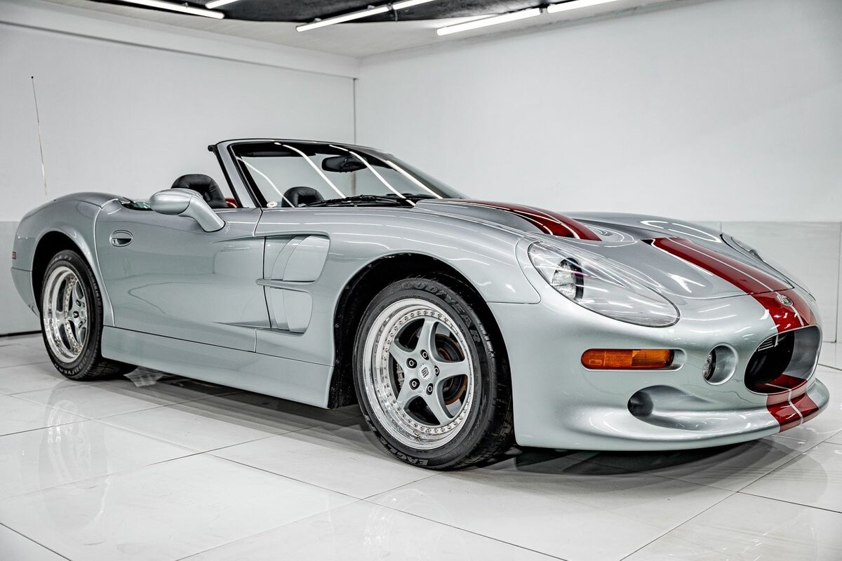 EXTERIOR: Finished in centennial silver with maroon optioned stripes. These cars are very distinct yet familiar looking. They have ties to Shelby's favorite cars like the Shelby Cobra, Dodge Viper, and Ford GT40. At first glance you're not sure what kind of car this is but when you take a closer look you see resemblances to those very vehicles. The paint is in excellent shape aside from a couple minor blemishes. There's a light scratch on the passenger side mirror cap and a slight crack in the paint on the driver rear quarter. You really have to look close to find it. The 18" wheels are a unique Shelby 2 piece finished in hyper silver centers with polished aluminum lips. They fit the aggressive stance of the car perfectly. The convertible top is black and a soft top. It is manually raised and lowered and hides nicely under the tonneau cover.