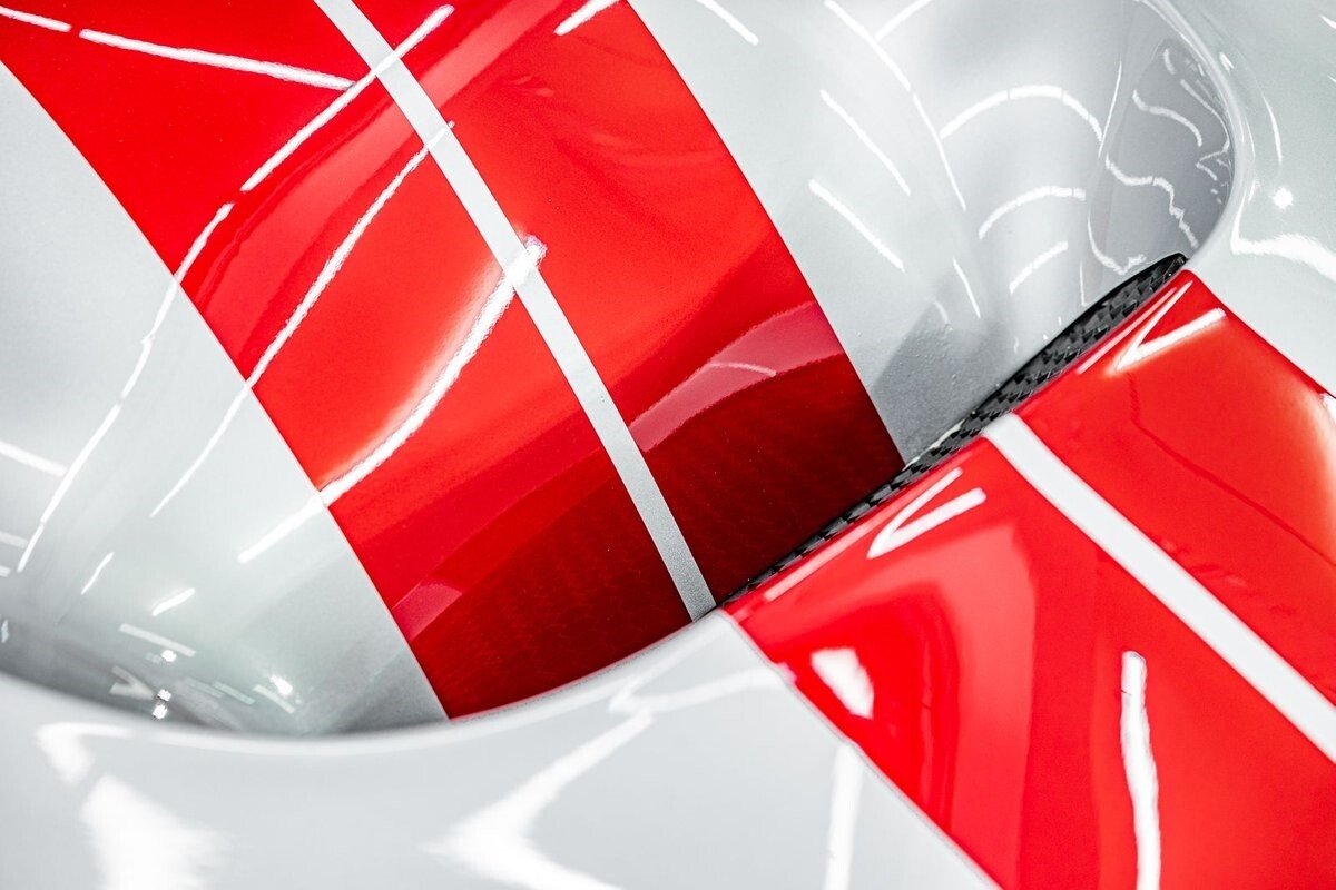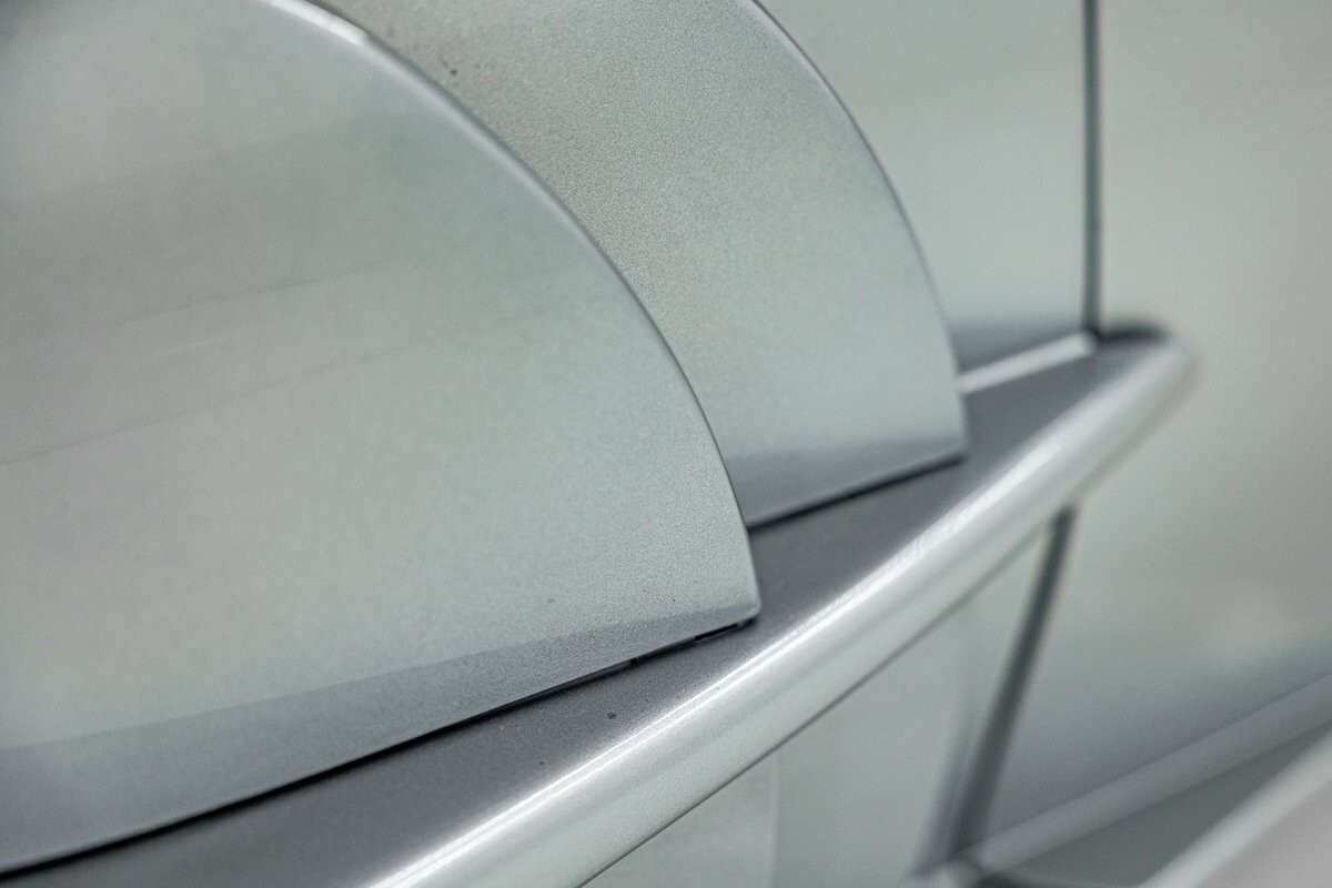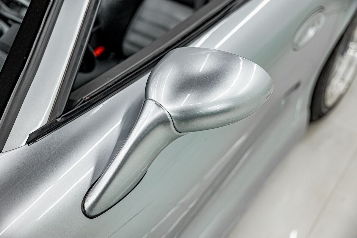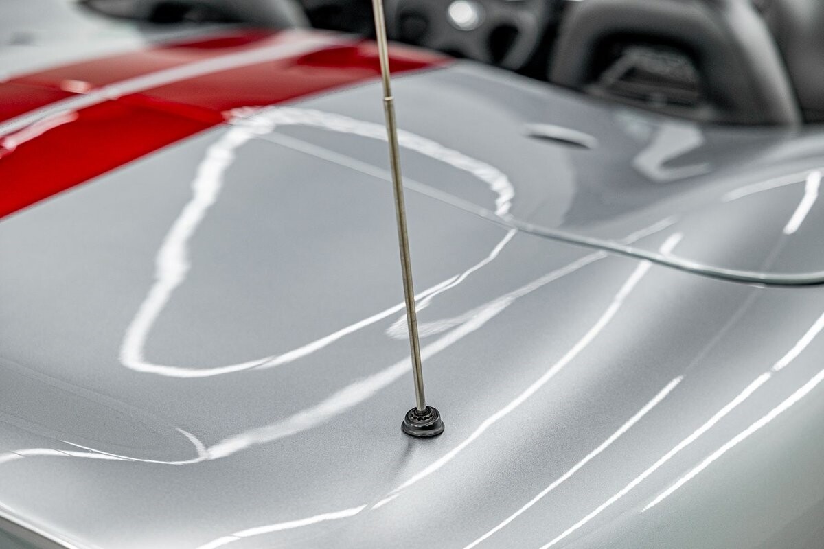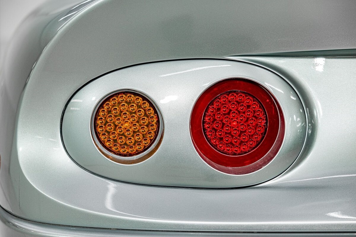 EXTERIOR: Finished in centennial silver with maroon optioned stripes. These cars are very distinct yet familiar looking. They have ties to Shelby's favorite cars like the Shelby Cobra, Dodge Viper, and Ford GT40. At first glance you're not sure what kind of car this is but when you take a closer look you see resemblances to those very vehicles. The paint is in excellent shape aside from a couple minor blemishes. There's a light scratch on the passenger side mirror cap and a slight crack in the paint on the driver rear quarter. You really have to look close to find it. The 18" wheels are a unique Shelby 2 piece finished in hyper silver centers with polished aluminum lips. They fit the aggressive stance of the car perfectly. The convertible top is black and a soft top. It is manually raised and lowered and hides nicely under the tonneau cover.