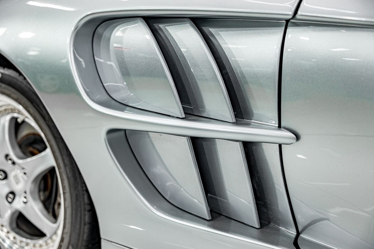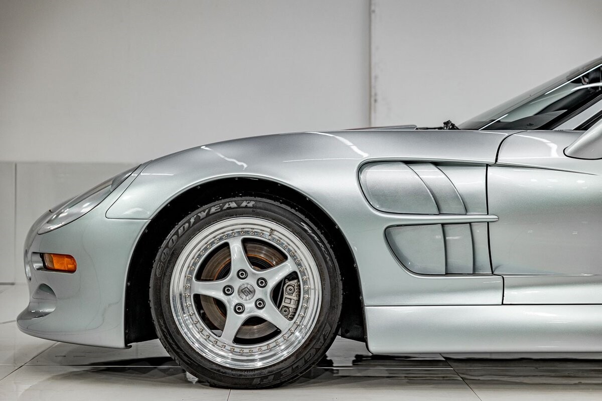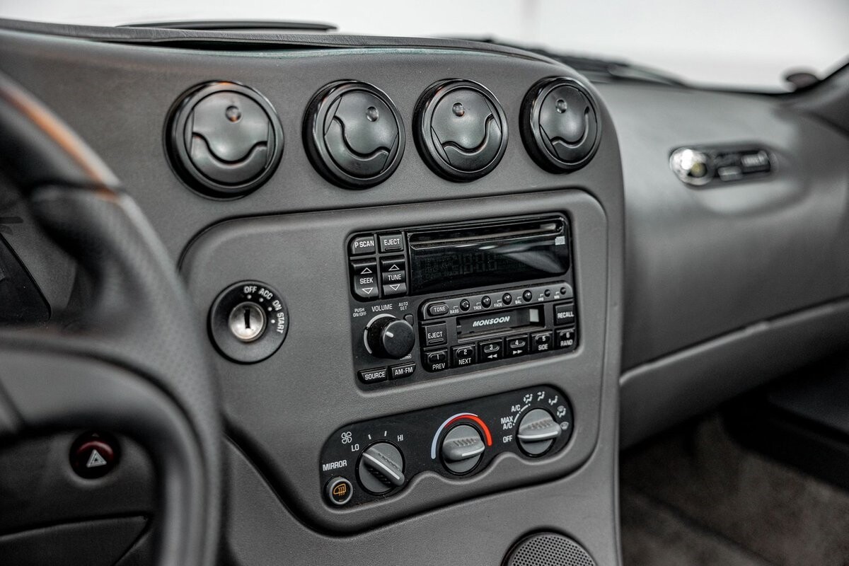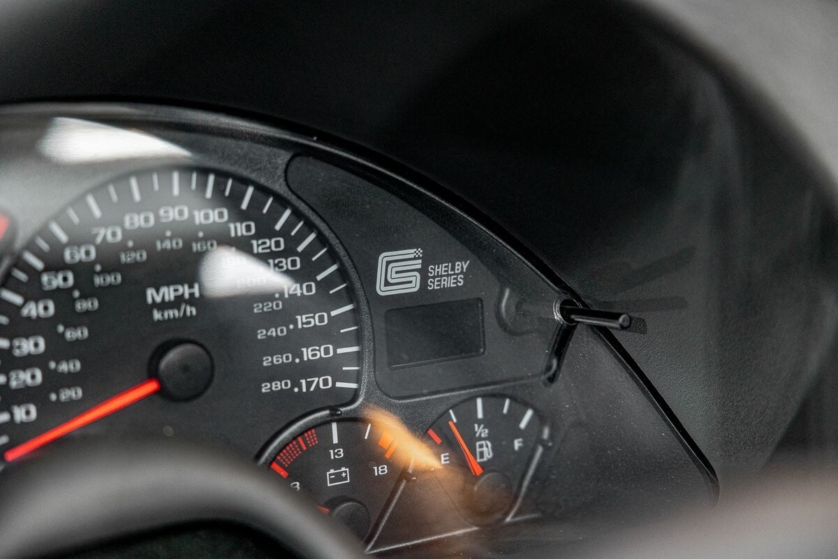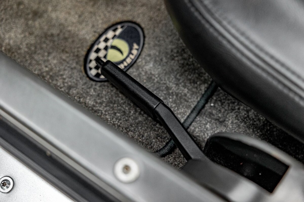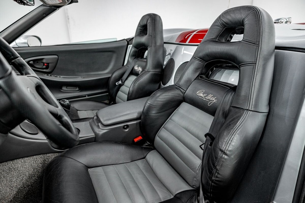INTERIOR: With only 522 miles the interior is practically spotless. The black/gray combo ties in nicely against the silver paint. The carpet mats are like new as well as the two-tone leather bucket seats. The interior will remind you of some GM cars as Carroll Shelby used spare parts leftover from Pontiac and Buick. It has tilt steering wheel, cruise control, air conditioning, monsoon premium stereo, and power windows, locks, and mirrors. On the passenger side of the dash is a numbered series one plaque identifying the authenticity of this car.