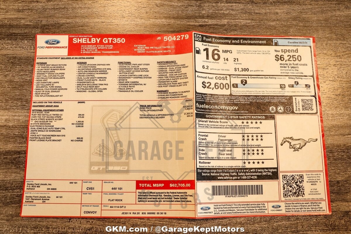 Under the hood lies a mighty 5.2L V8 engine, paired with a smooth 6-speed manual transmission, delivering exhilarating performance and a driving experience like no other. Plus, with the original window sticker and owner's manuals included, as well as the Shelby GT350 sales brochures and owner's supplement box, you'll have all the information you need to fully appreciate this iconic car.