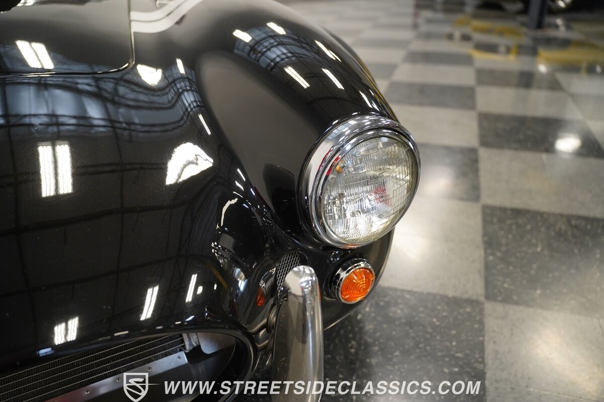 The beautiful black paint is highlighted by silver Grand Sport-style hash marks on the front fenders, which complement the Cobra's "Powered By Ford" badges and massive side pipes. Inside, we find the handsomely minimalist interior that Shelby originally intended for his masterpiece. Its five-gauge dashboard is augmented by enough switches to double as an old-school fighter jet cockpit. The level-front shifter is classic Cobra, while the three-spoke, wood-rimmed steering wheel uses a Factor Five center cap to remind you that this car is a bit more modern than the car it's modeled after.