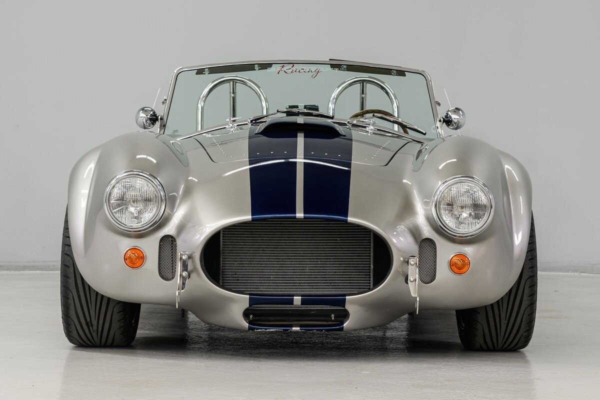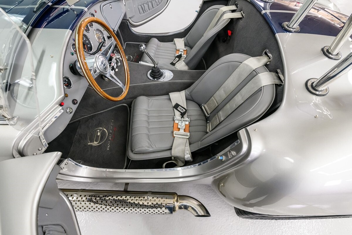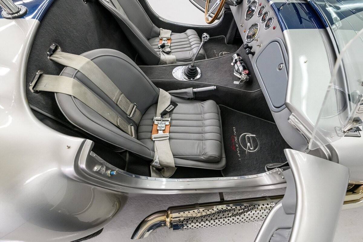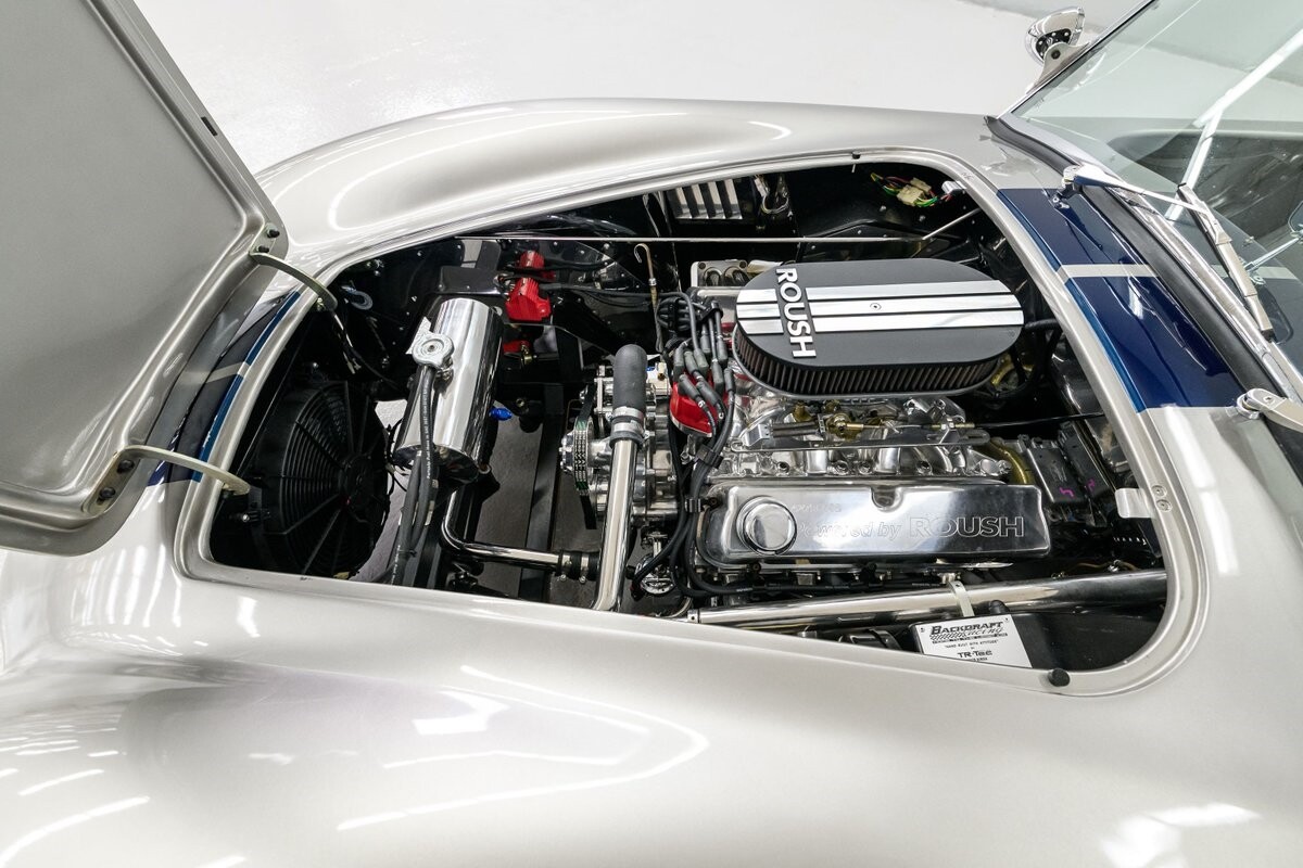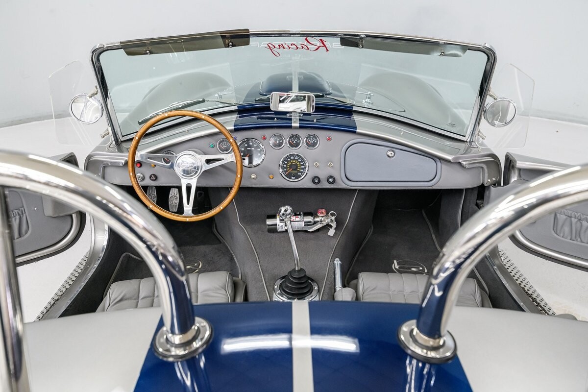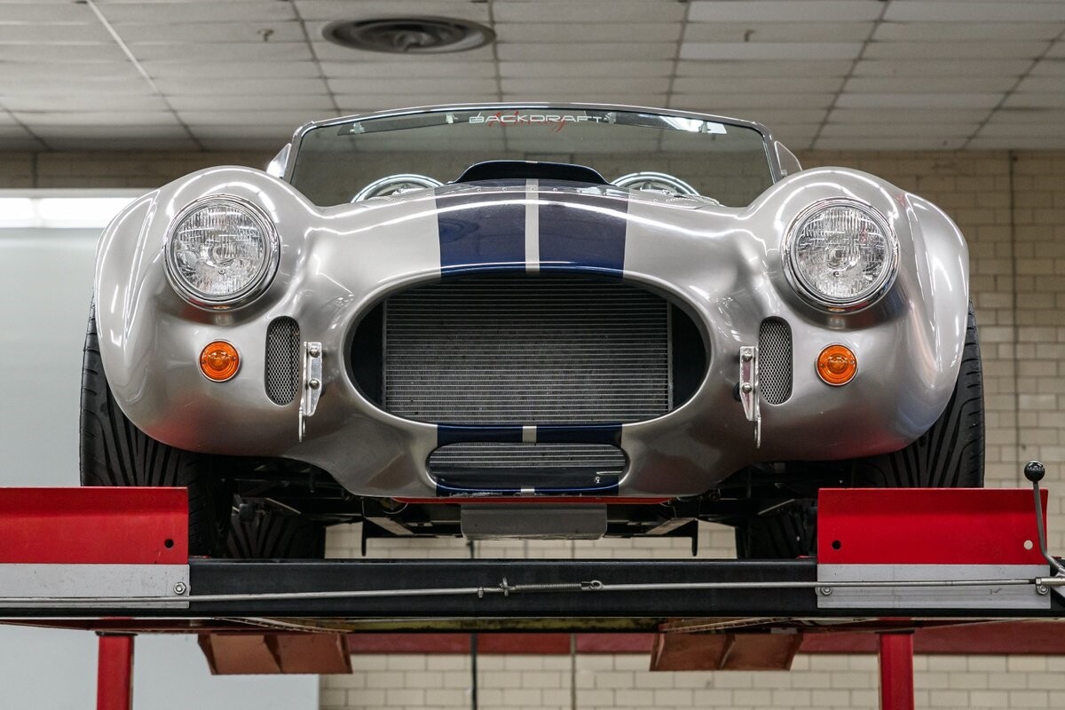 Backdraft Racing is a premier manufacturer of classic Cobra replicars. Based in the Boynton Beach, FL, BDR produces various Cobra kits and are very highly respected in the business. This beautiful 1-owner 1965 Shelby Backdraft Cobra is a prime example of what a replicar should be. The BDR Roadster is a serious Cobra that is built to race. That said, this particular Cobra has never been to a track. The BDR Cobra Roadster was originally built as a show car for the BDR sales team and was purchased as a rolling chassis by our owner in 2007. This gentleman, a valued leader of one of NASCAR's best race teams, completed the build - with a little help from his NASCAR friends, and his son. The SC-style body was professionally finished in Titanium Silver w/Indigo strips and it is in outstanding condition. Accents include stainless side-pipes, clear window wings and Shelby-style alloy wheels that are true 'knock-offs' wrapped in Goodyear Eagle performance radials. The high grade vinyl interior looks as good as the day it was installed. A full complement of VDO gauges is perfectly positioned in the functional dash, there is a handsome wooden wheel and each bucket seat is equipped with lap/shoulder harness along with dual roll bars. One of the best features of this Cobra Roadster is a 2-1/2" lengthened foot box to accept tall drivers.