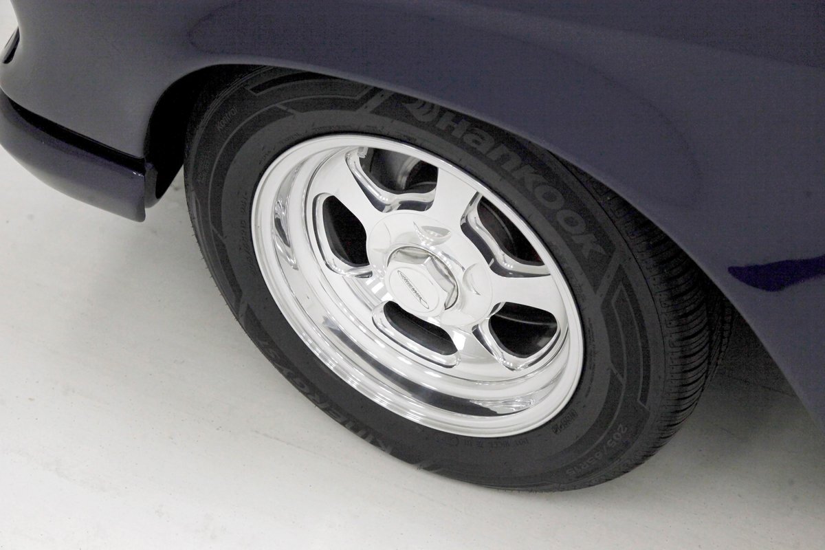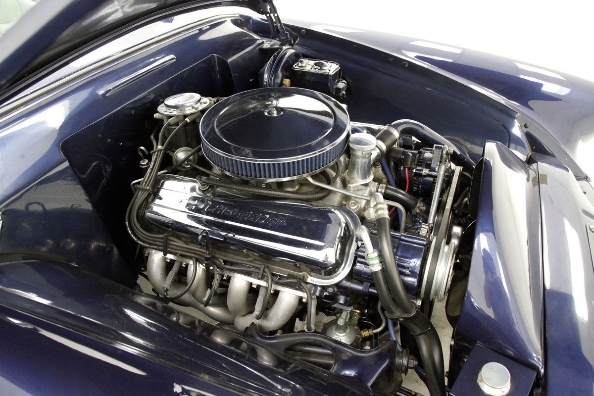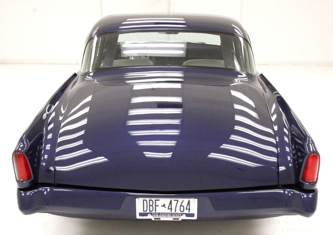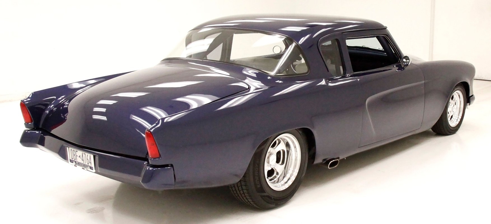 This midnight blue metallic eye catcher started out as a humble Studebaker Champion and now has been transformed into an award winning, great running, reliable and comfy inside kewl skate. A 3-inch chopping of the top, all steel which is rust free, some shaving of the trimmings and handles for simplification, flush mount front and rear glass, and lightly smoked windows all work together to give us a modern looking 1953 street Stude. Wonderful flowing lines courtesy Raymond Loewy show from the side that the hood and trunk deck are virtually the same length with the now lowered roof with sloped back glass. The bumpers have been painted to match the exterior and all trimmings have been shaved for a surgically clean look. The back of the car has also been simplified with frenched tail lights to match the frenched headlights. Below, in front of the rear wheels are the oval tipped side exit exhaust and highly polished Budnik Formosa 15-inch wheels are on all 4 corners and are wrapped with staggered width black wall rubber from the 29th week of 2022. The finish is in the deep end of the pool and few small chips and scratches are the only flaw to be noted in the body.
