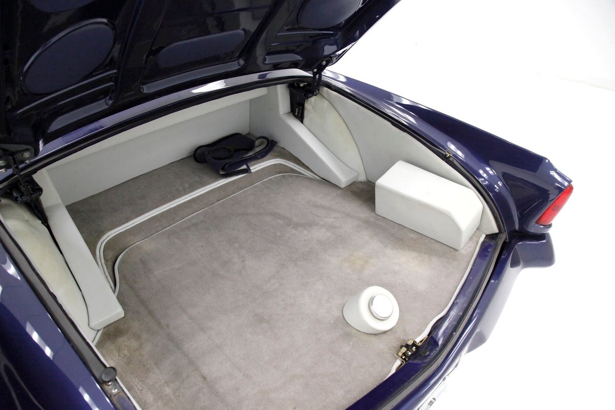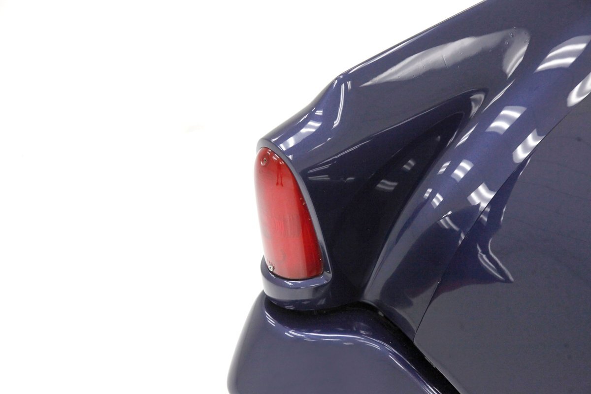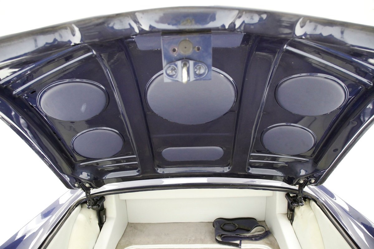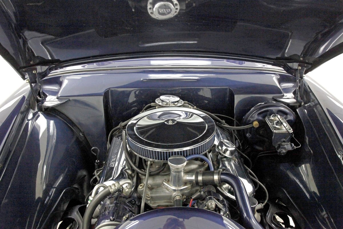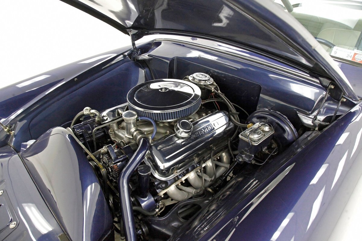 This midnight blue metallic eye catcher started out as a humble Studebaker Champion and now has been transformed into an award winning, great running, reliable and comfy inside kewl skate. A 3-inch chopping of the top, all steel which is rust free, some shaving of the trimmings and handles for simplification, flush mount front and rear glass, and lightly smoked windows all work together to give us a modern looking 1953 street Stude. Wonderful flowing lines courtesy Raymond Loewy show from the side that the hood and trunk deck are virtually the same length with the now lowered roof with sloped back glass. The bumpers have been painted to match the exterior and all trimmings have been shaved for a surgically clean look. The back of the car has also been simplified with frenched tail lights to match the frenched headlights. Below, in front of the rear wheels are the oval tipped side exit exhaust and highly polished Budnik Formosa 15-inch wheels are on all 4 corners and are wrapped with staggered width black wall rubber from the 29th week of 2022. The finish is in the deep end of the pool and few small chips and scratches are the only flaw to be noted in the body.