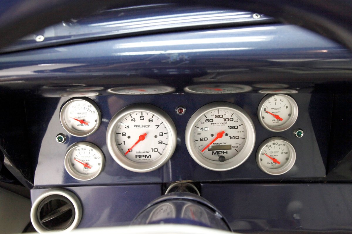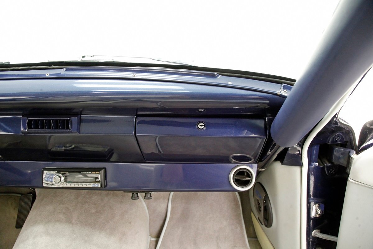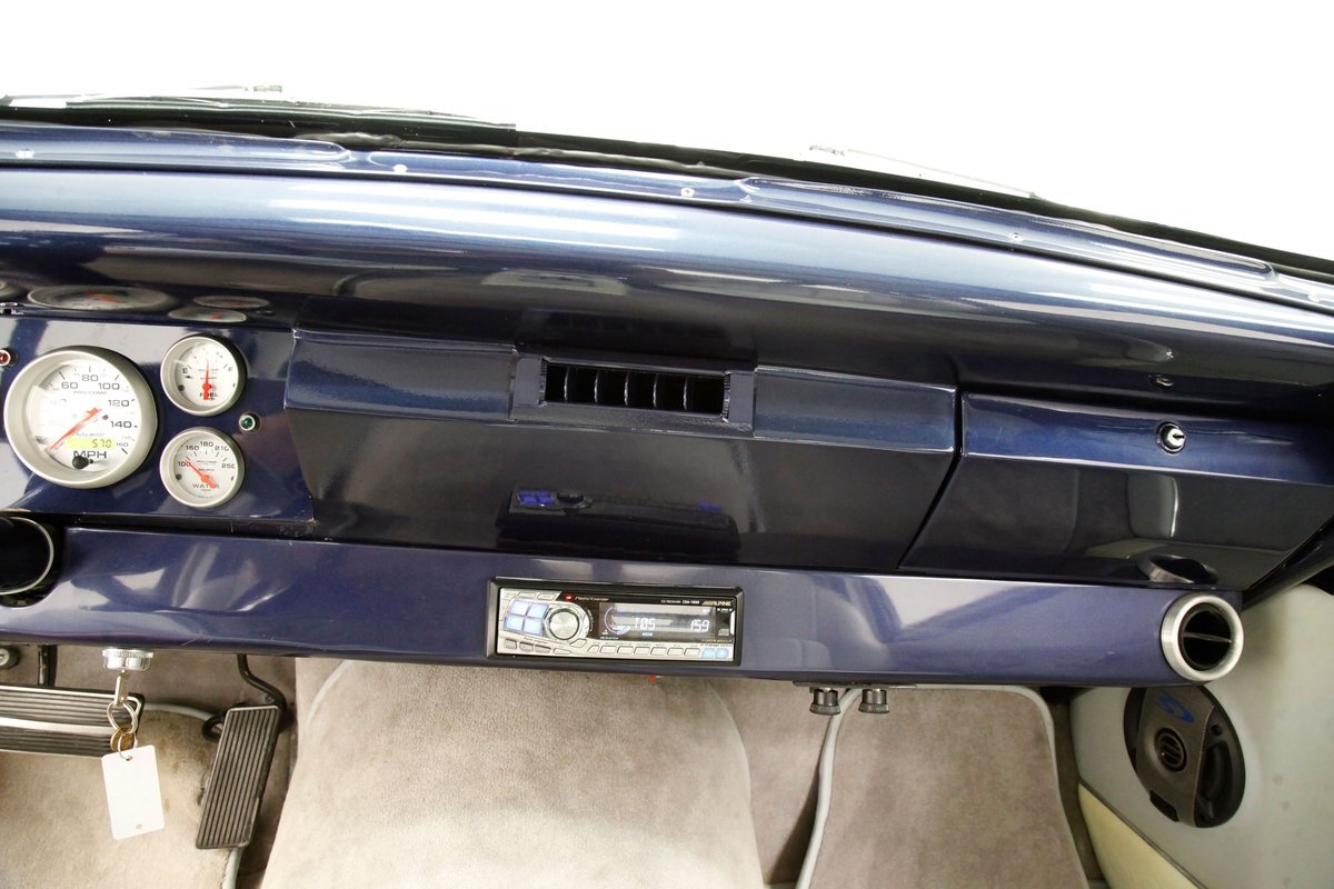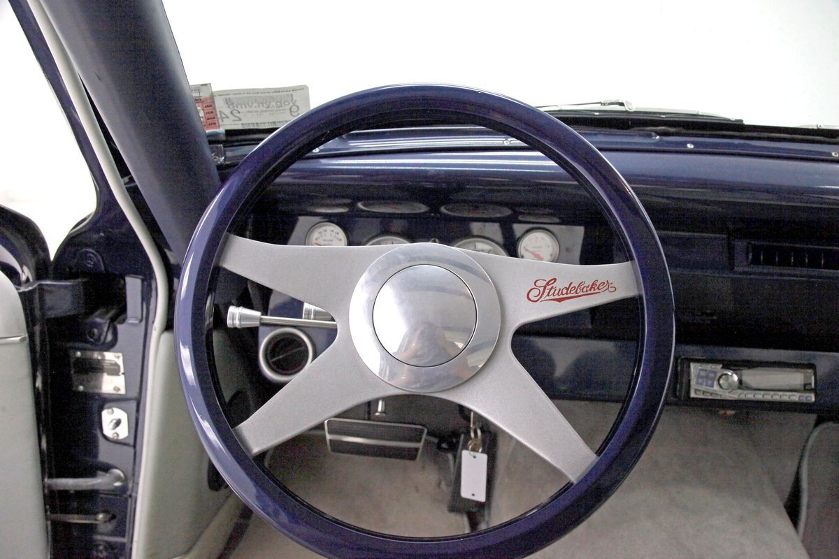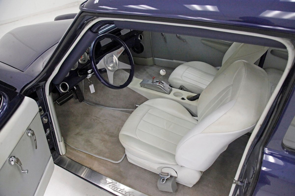 Gray and ivory ultraleather makes up the majority of the door panels that present with some light yellowing on the upper sills and armrests. Adding to the wow factory are mirror polished cranks and actuators and we are in resto-mod custom heaven! Smooth sculpted late model low back buckets are using more ultraleather for the smooth bolsters and tuck and roll inserts. Running through them is a custom fabricated ivory ultraleather wrapped center console, now fashioned with a B&M Pro-Ratchet shifter and a pair of cupholders. Warm gray carpeting floods the floors and is very clean. The original dash has been modified and now a wonderfully fashioned custom dash is presenting in body matching midnight blue. It is fronted by a tilt column with a billet rally style Studebaker steering wheel. The gauge cluster in front of the driver is now all silver faced AutoMeter ProComp Ultra light units. An Alpine AM/FM/CD stereo has been fitted into the dash, as have rectangle and round vents for the heater & AC. In back is a nicely rounded bench that very much matches the buckets and a well tucked custom 6-point roll cage has been installed for some extra safety. A quick look upward gives us the view of a stitched ivory headliner, and this material carries forth into the rear side panels as well.