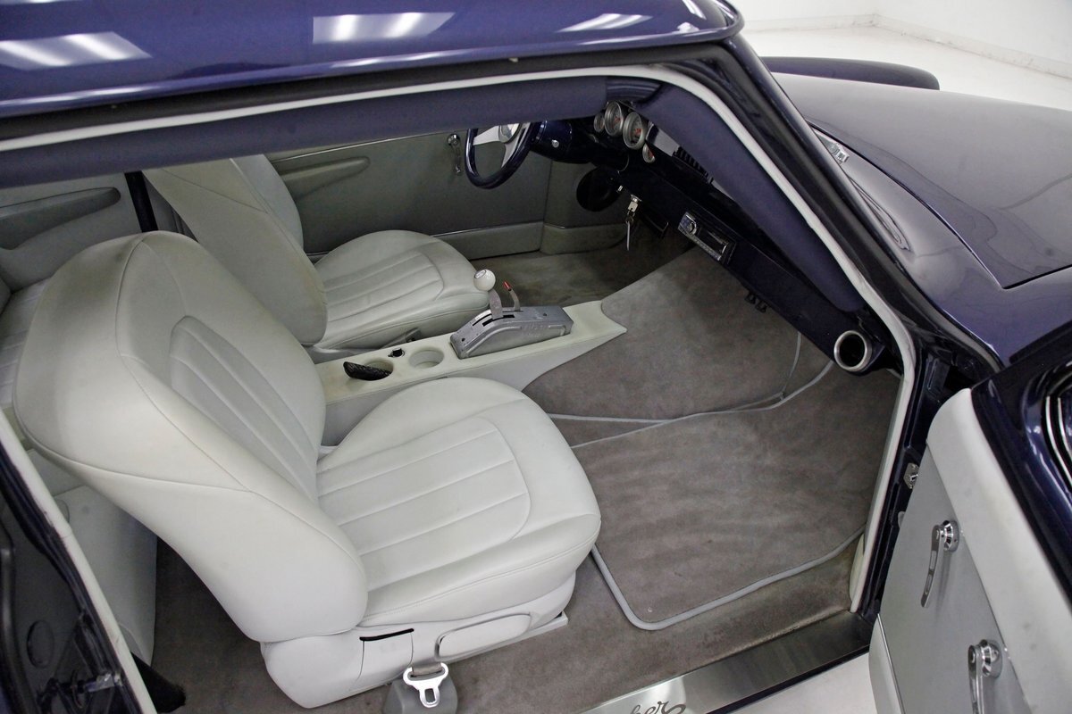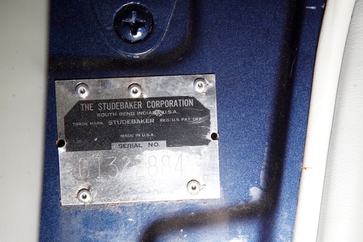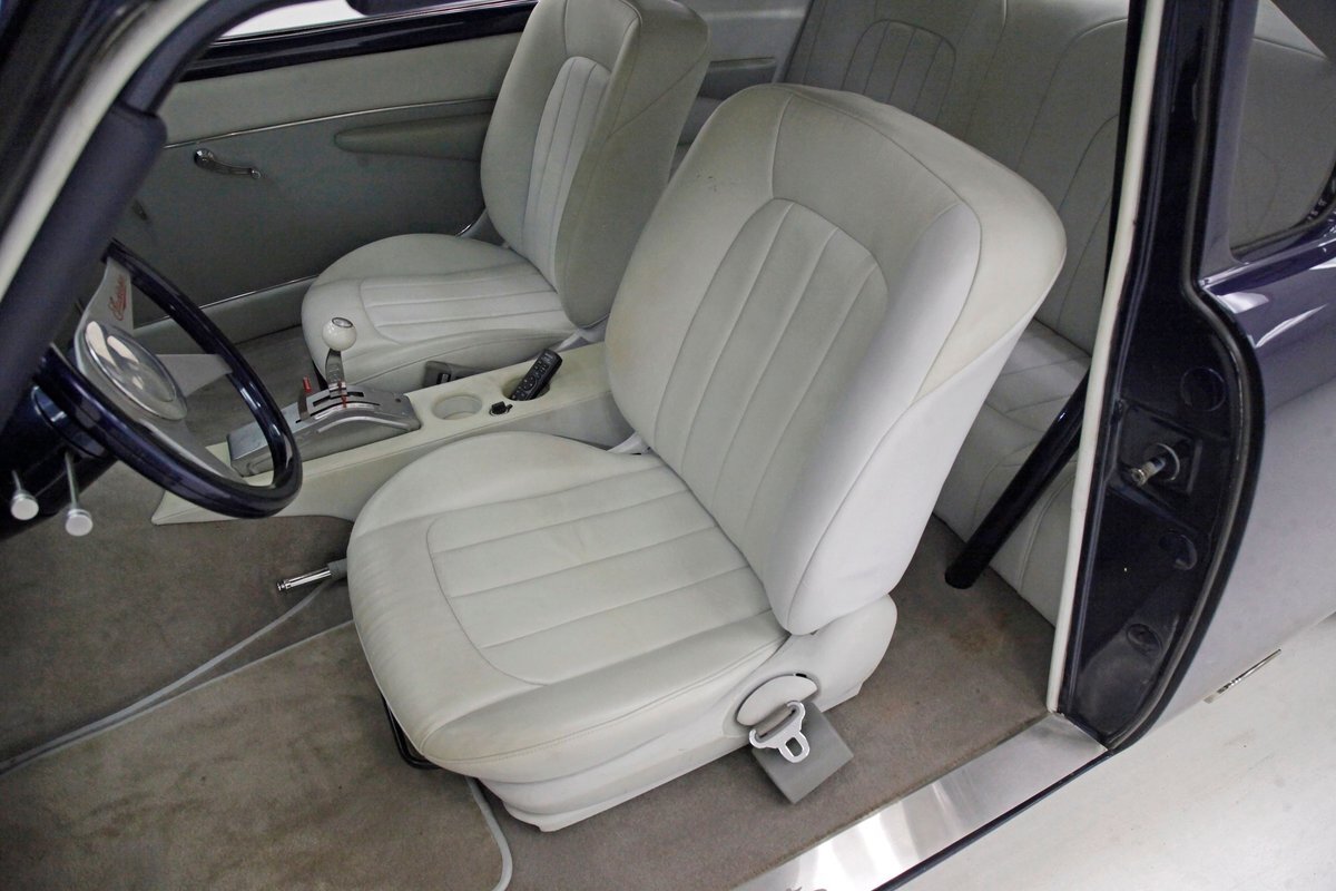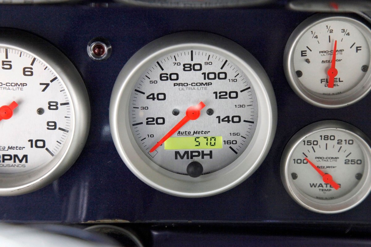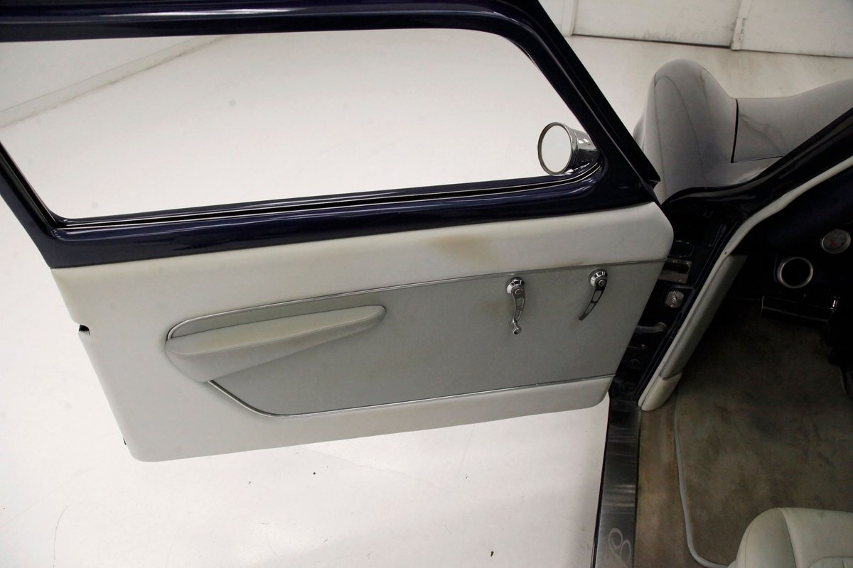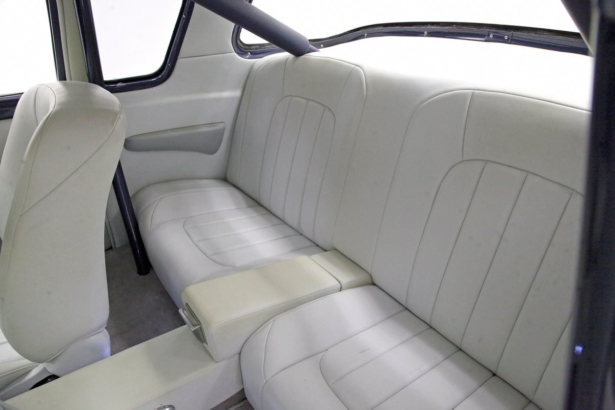 Gray and ivory ultraleather makes up the majority of the door panels that present with some light yellowing on the upper sills and armrests. Adding to the wow factory are mirror polished cranks and actuators and we are in resto-mod custom heaven! Smooth sculpted late model low back buckets are using more ultraleather for the smooth bolsters and tuck and roll inserts. Running through them is a custom fabricated ivory ultraleather wrapped center console, now fashioned with a B&M Pro-Ratchet shifter and a pair of cupholders. Warm gray carpeting floods the floors and is very clean. The original dash has been modified and now a wonderfully fashioned custom dash is presenting in body matching midnight blue. It is fronted by a tilt column with a billet rally style Studebaker steering wheel. The gauge cluster in front of the driver is now all silver faced AutoMeter ProComp Ultra light units. An Alpine AM/FM/CD stereo has been fitted into the dash, as have rectangle and round vents for the heater & AC. In back is a nicely rounded bench that very much matches the buckets and a well tucked custom 6-point roll cage has been installed for some extra safety. A quick look upward gives us the view of a stitched ivory headliner, and this material carries forth into the rear side panels as well.