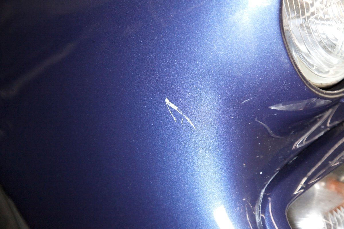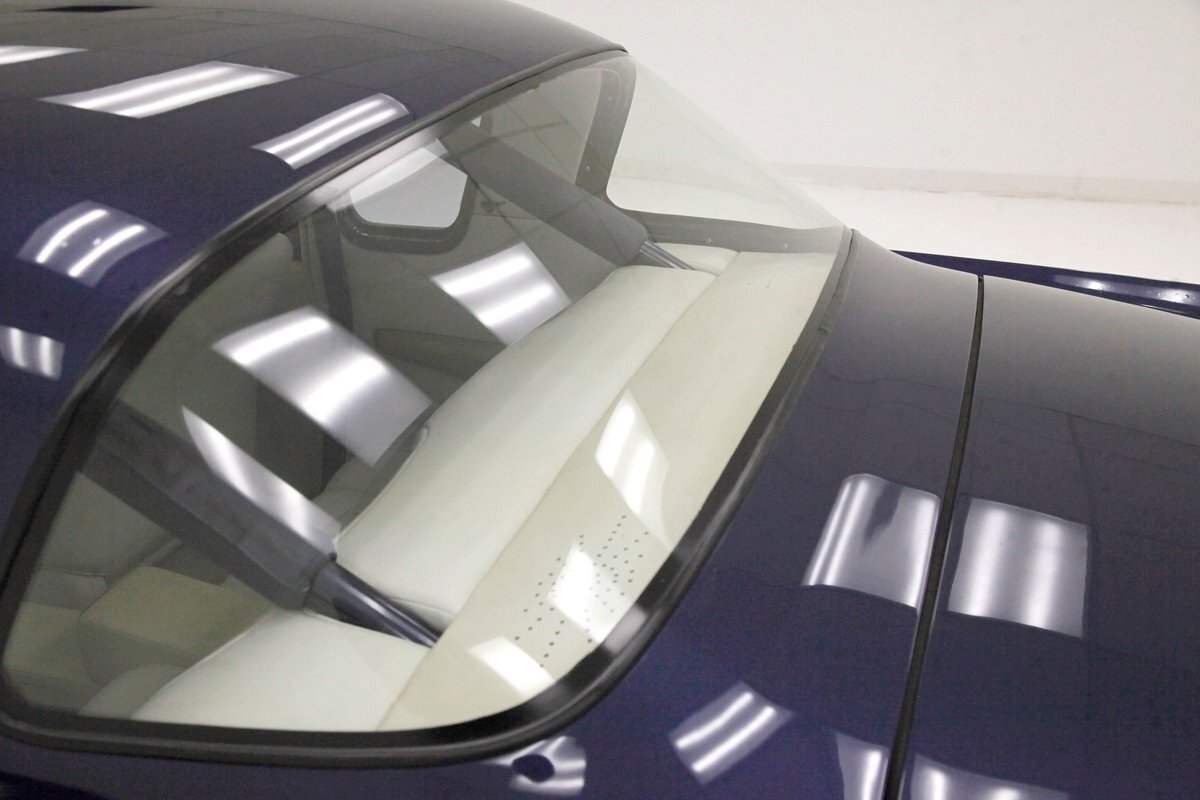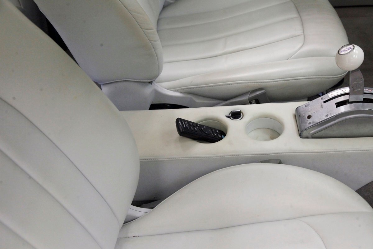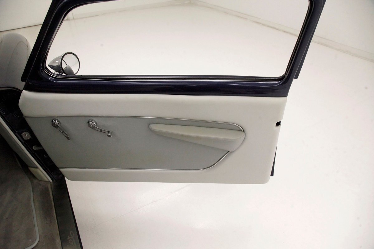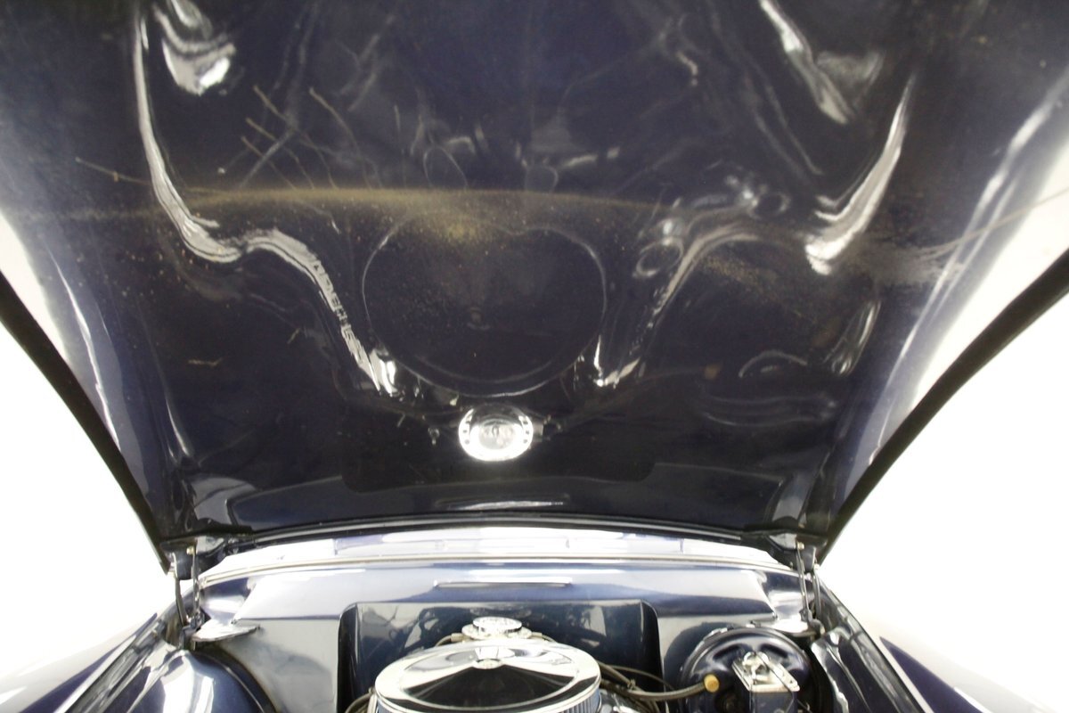 Gray and ivory ultraleather makes up the majority of the door panels that present with some light yellowing on the upper sills and armrests. Adding to the wow factory are mirror polished cranks and actuators and we are in resto-mod custom heaven! Smooth sculpted late model low back buckets are using more ultraleather for the smooth bolsters and tuck and roll inserts. Running through them is a custom fabricated ivory ultraleather wrapped center console, now fashioned with a B&M Pro-Ratchet shifter and a pair of cupholders. Warm gray carpeting floods the floors and is very clean. The original dash has been modified and now a wonderfully fashioned custom dash is presenting in body matching midnight blue. It is fronted by a tilt column with a billet rally style Studebaker steering wheel. The gauge cluster in front of the driver is now all silver faced AutoMeter ProComp Ultra light units. An Alpine AM/FM/CD stereo has been fitted into the dash, as have rectangle and round vents for the heater & AC. In back is a nicely rounded bench that very much matches the buckets and a well tucked custom 6-point roll cage has been installed for some extra safety. A quick look upward gives us the view of a stitched ivory headliner, and this material carries forth into the rear side panels as well.