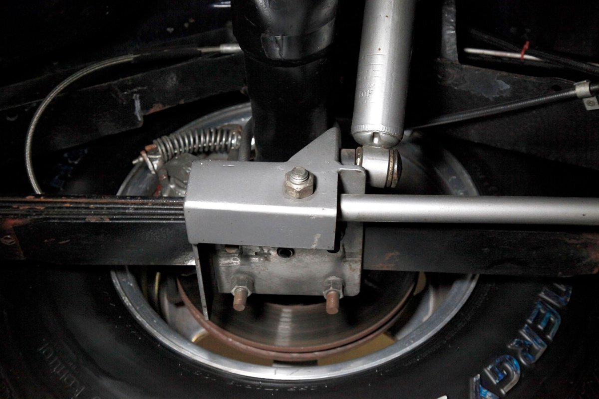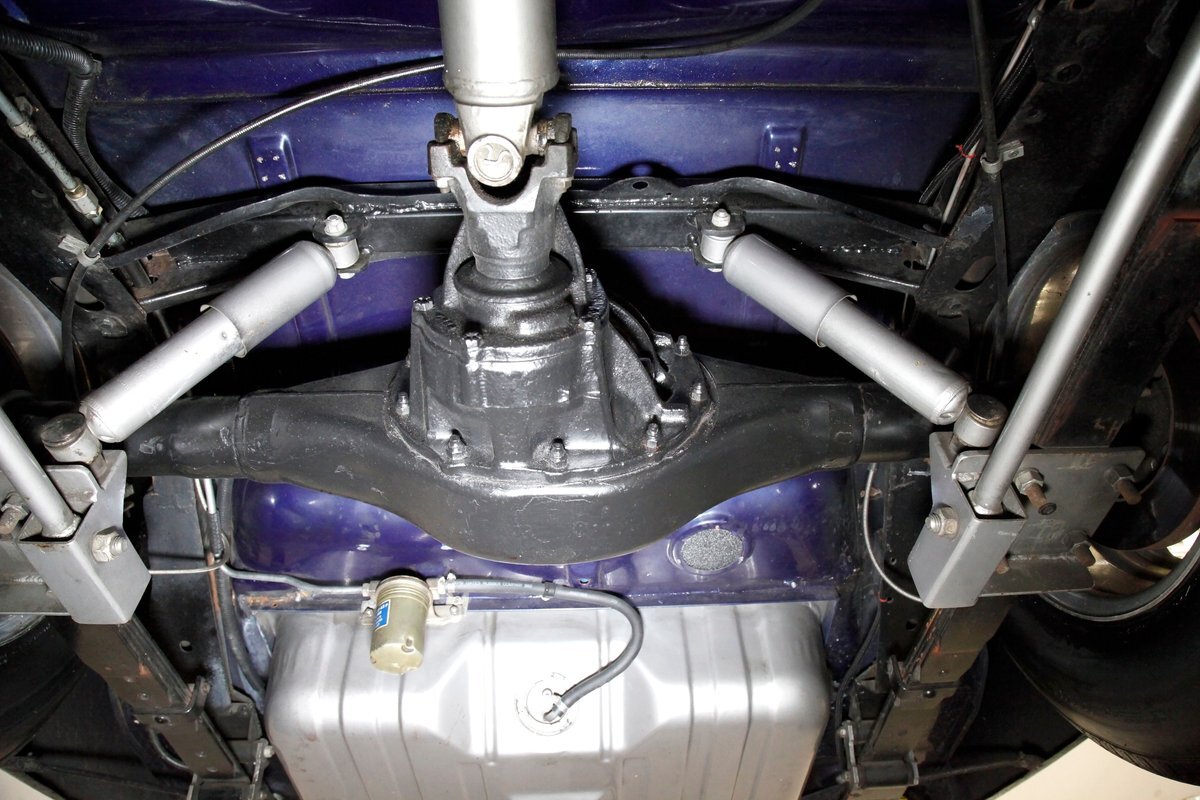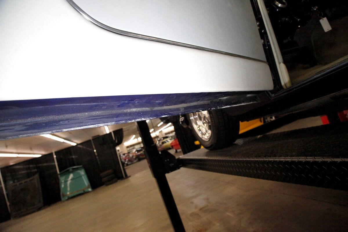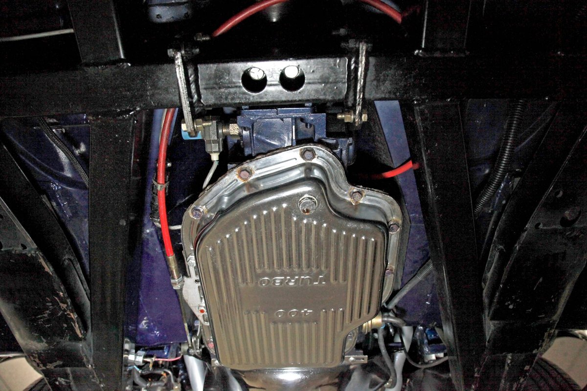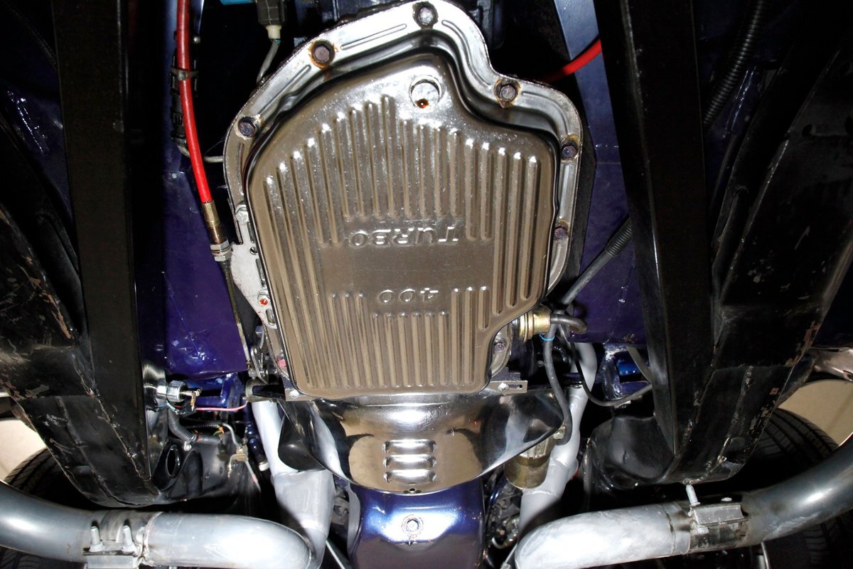 Initially, with a raise of the hood, we feel like we may be peering into a black hole, but upon a little bit of further investigation, what to our wondering eyes does appear but a midnight blue painted 454ci V8 that sits perfectly in the smoothed and customized engine bay. Aluminum is the material of choice for the intake manifold and a 4-barrel carburetor is perched atop. On this mill, if it's not painted midnight blue it is either cast or polished and it all looks great, including the silver coated headers that can be seen for the exhale, and on the back a rebuilt TH400 3-speed automatic transmission. Taking the handoff from the transmission is a Currie supplied Ford 9" axle with 2.75 gearing and TracLoc.