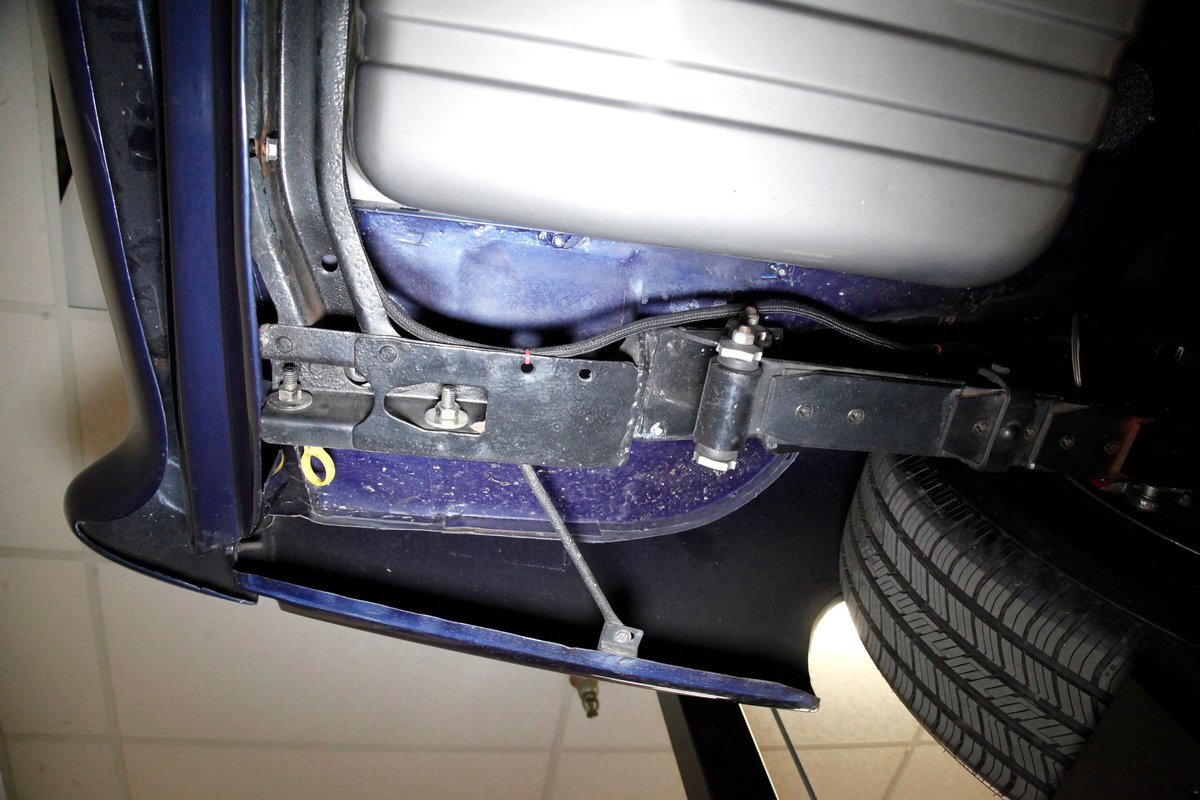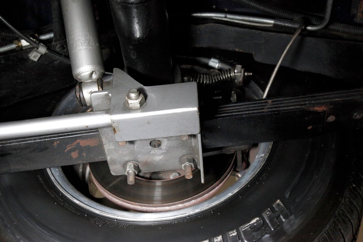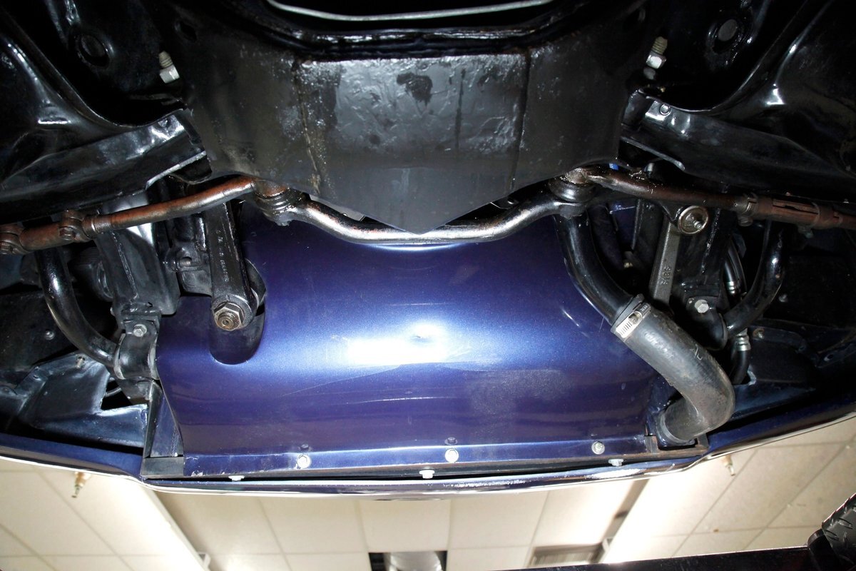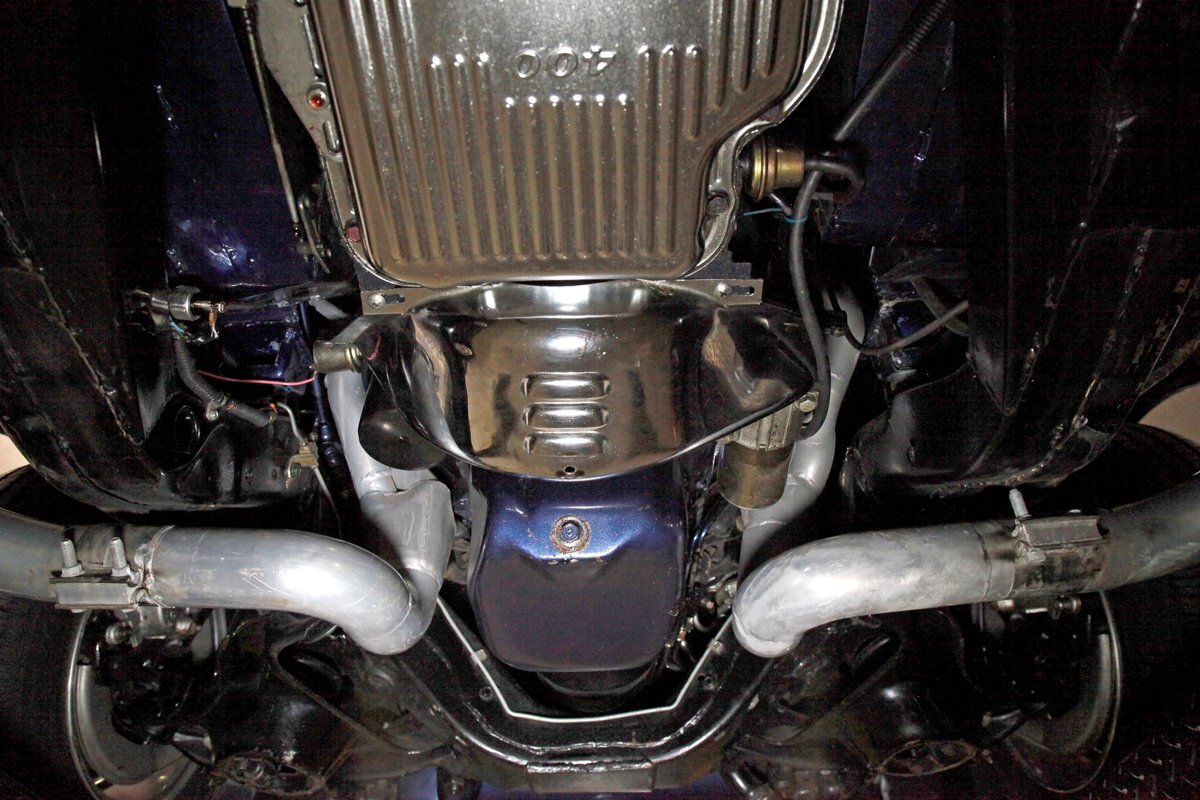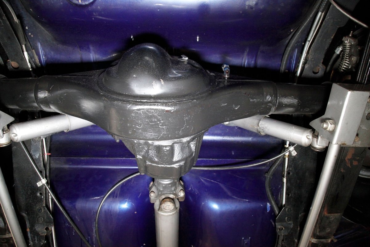 Initially, with a raise of the hood, we feel like we may be peering into a black hole, but upon a little bit of further investigation, what to our wondering eyes does appear but a midnight blue painted 454ci V8 that sits perfectly in the smoothed and customized engine bay. Aluminum is the material of choice for the intake manifold and a 4-barrel carburetor is perched atop. On this mill, if it's not painted midnight blue it is either cast or polished and it all looks great, including the silver coated headers that can be seen for the exhale, and on the back a rebuilt TH400 3-speed automatic transmission. Taking the handoff from the transmission is a Currie supplied Ford 9" axle with 2.75 gearing and TracLoc.