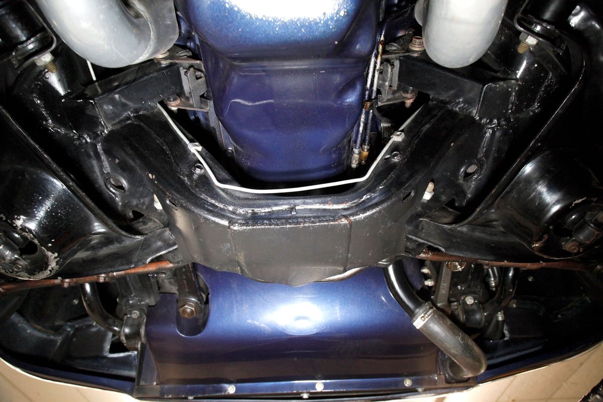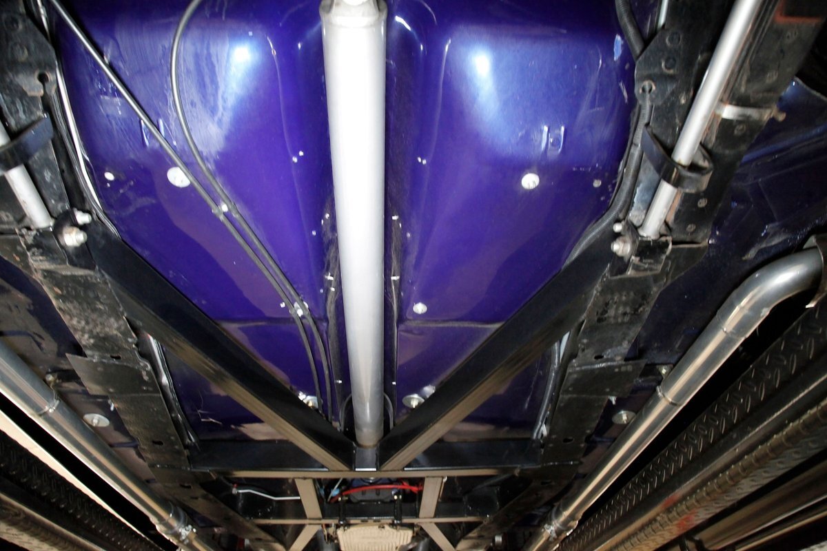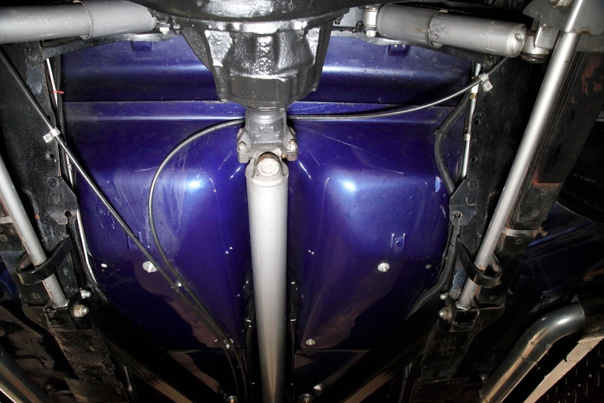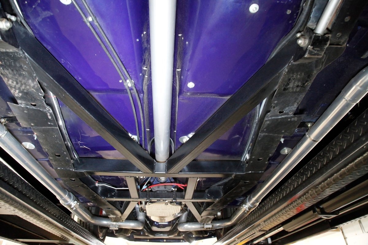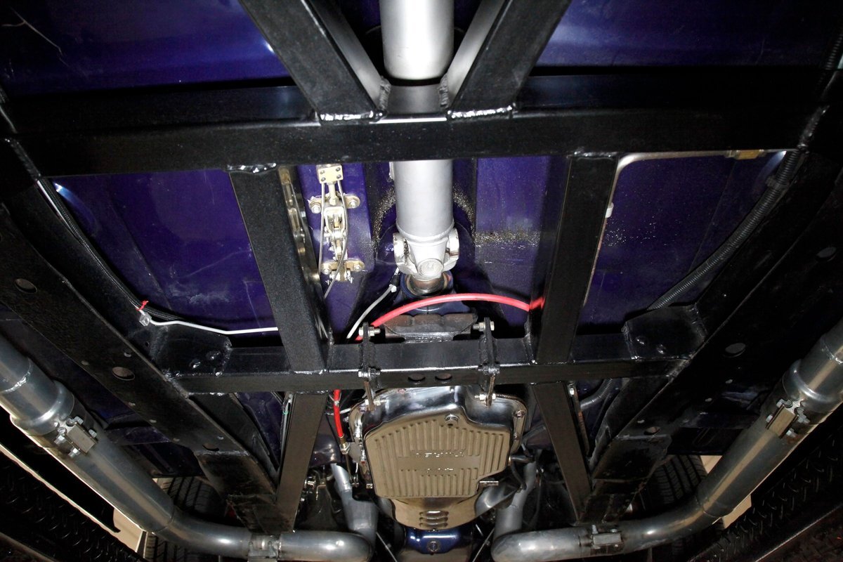 These surfaces have been painstakingly sandblasted and then repainted in black for the frame and purplish/midnight blue flooring, rockers and body hangers. An overall great look can be seen on the floor pans rockers and suspension parts with all being rust free. Speaking of which, a 1970 Camaro has donated its front subframe and comes to us with power disc brakes, and on back are leaf springs and Caltracs bars and more power discs. Polished stainless exhaust in dual form shows up and the pipes are snarling rearward from those headers under the hood.