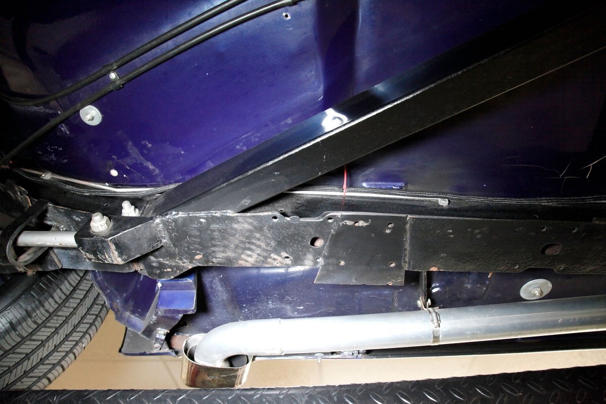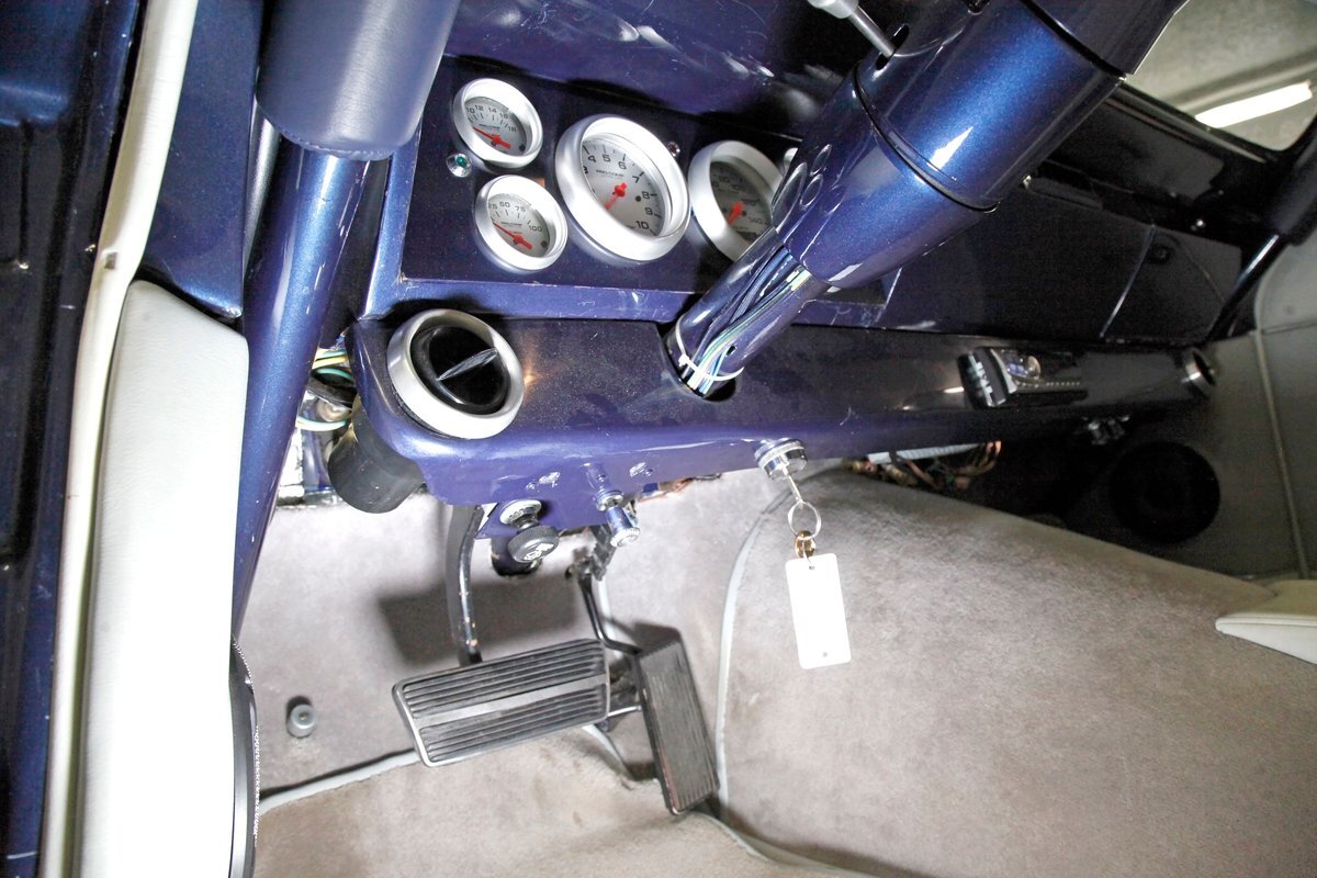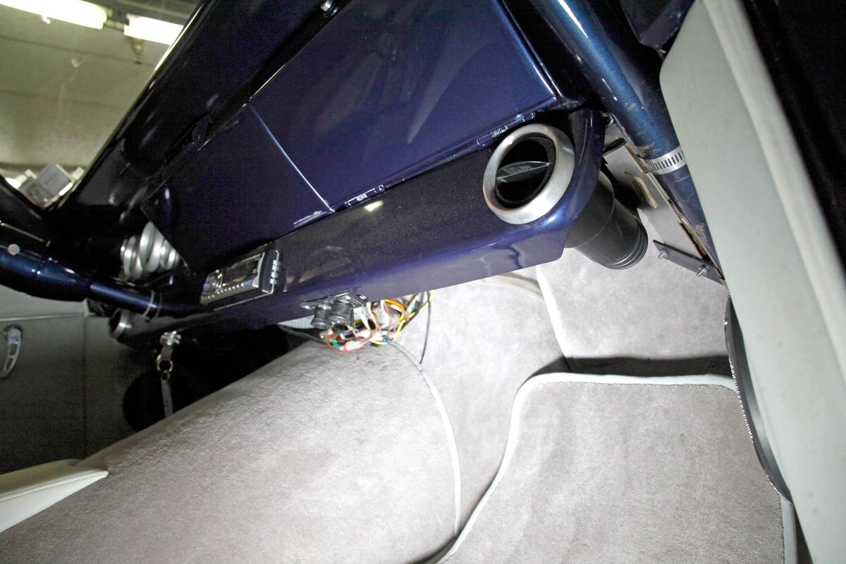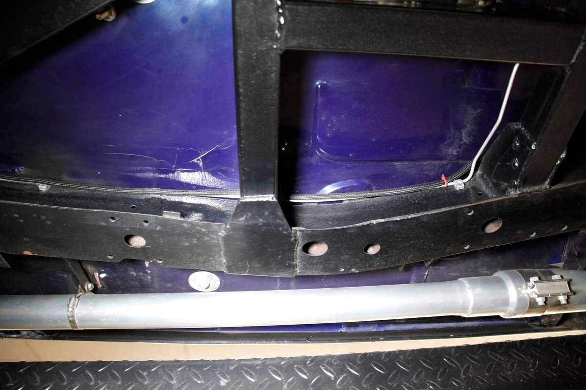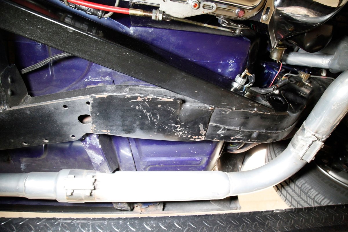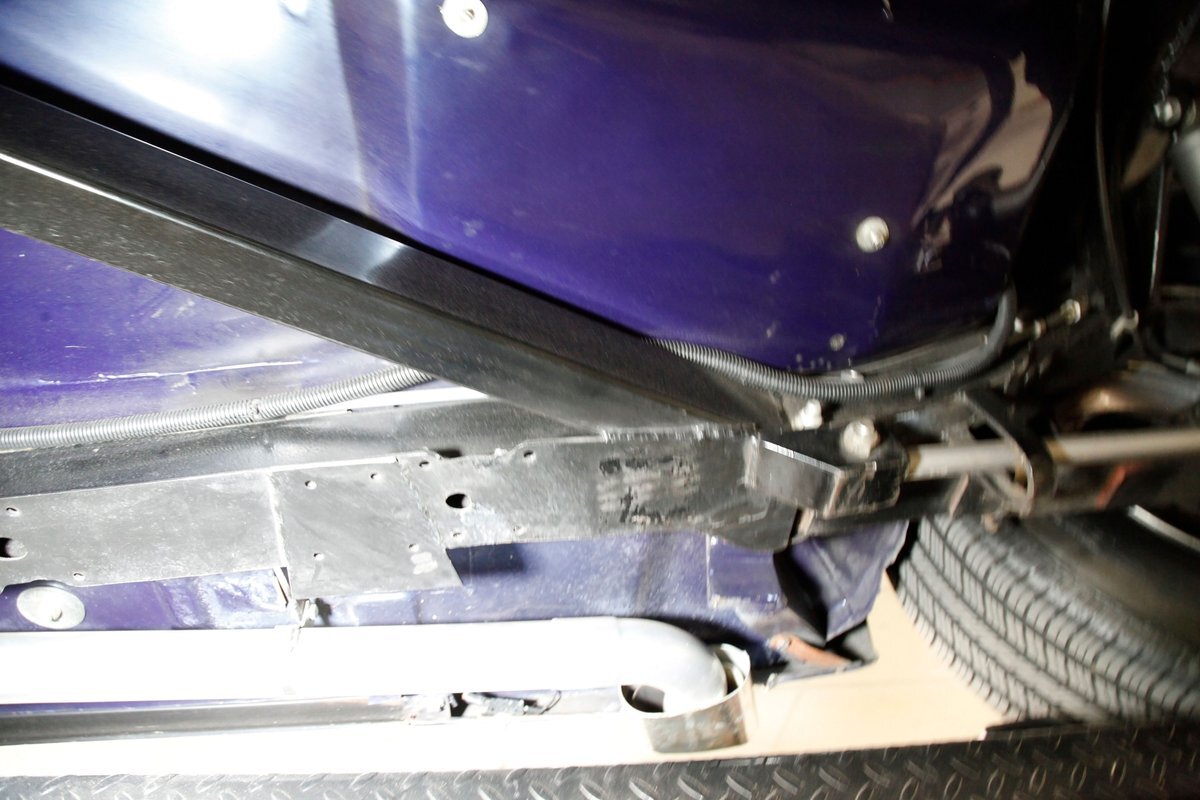 These surfaces have been painstakingly sandblasted and then repainted in black for the frame and purplish/midnight blue flooring, rockers and body hangers. An overall great look can be seen on the floor pans rockers and suspension parts with all being rust free. Speaking of which, a 1970 Camaro has donated its front subframe and comes to us with power disc brakes, and on back are leaf springs and Caltracs bars and more power discs. Polished stainless exhaust in dual form shows up and the pipes are snarling rearward from those headers under the hood.