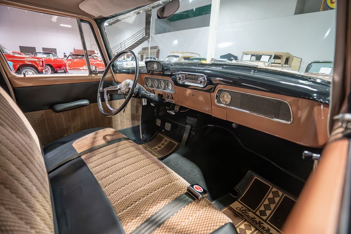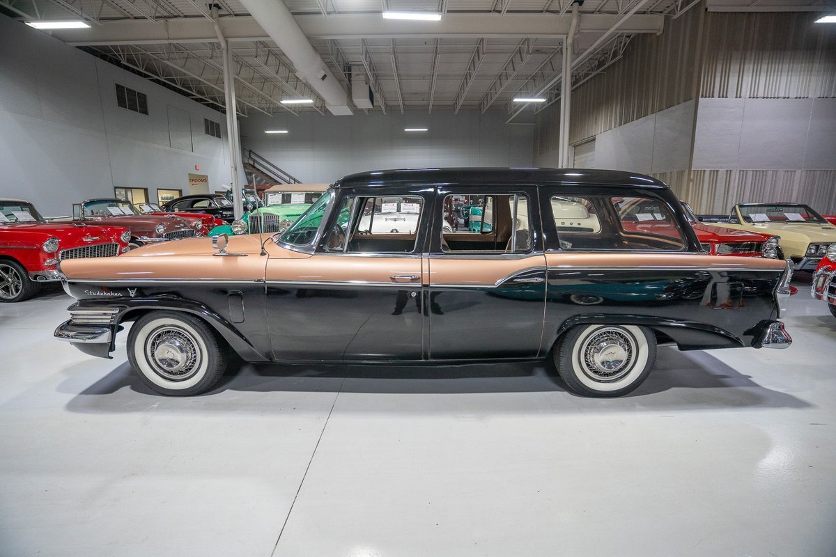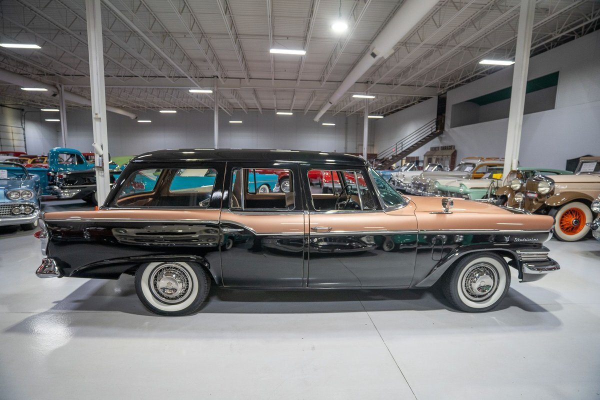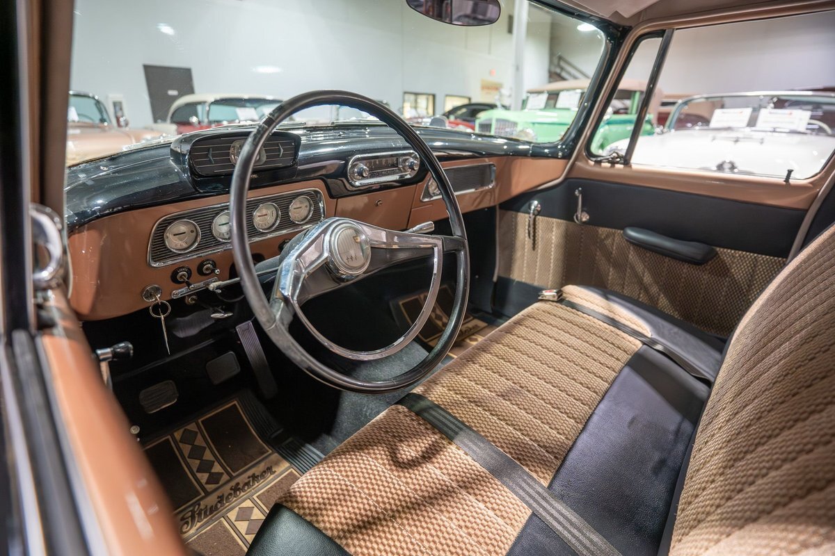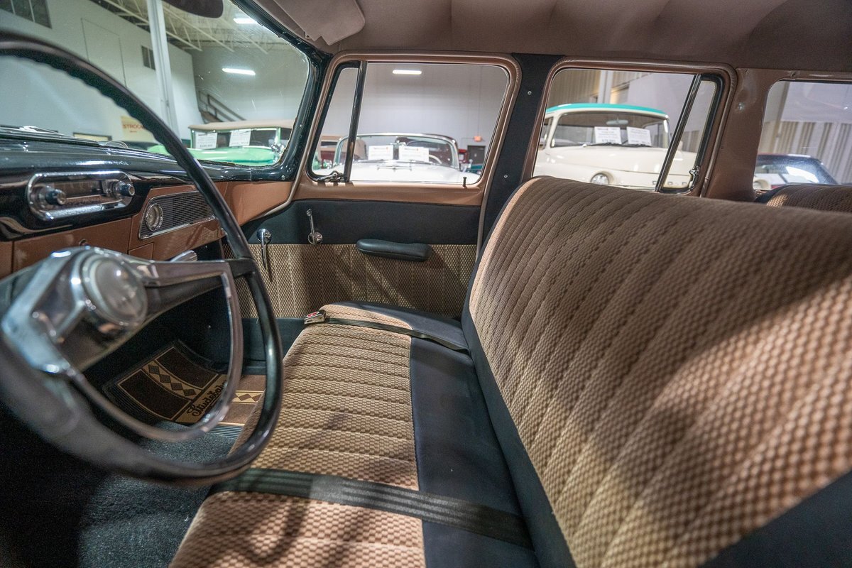This 1957 Studebaker Commander Provincial Station Wagon is a beautifully restored, 50s wagon with quintessential 50s flair! 1957 was a significant year for the Studebaker-Packard Corporation in that it marked the first time that the company, which was the result of a merger of the namesake American independent automakers, produced vehicles using the same body shell. In other words, besides just badging and minor trim differences, a Studebaker and a Packard was essentially the same car. On the Studebaker side, little changed on Studebaker's passenger cars from 1956 into 1957. The most notable change on the Studebakers was a redesigned front grille that now wrapped around the front end into the sides. The other major stylistic update was that the '57 Studebakers also sported larger taillights from the previous year design. Perhaps most relevant here was that 1957 also marked the the first time since World War II that Studebaker offered a 4-door wagon design with the addition of the Provincial Station Wagon to Studebaker's passenger car lineup. Nonetheless, 1957 was just a so-so sales year for the Studebaker-Packard Corporation with total production sitting just over 63,000 units and placing Studebaker-Packard in 13th place among American automaker production totals. That being said, only 3,995 of the Commander Provincial Station Wagons were produced which makes this particular example quite a rare Studebaker from the 1950s. Under the hood on this '57 Studebaker Provincial Station Wagon is a 259 Cubic Inch V8 engine fed by a single 2 barrel carburetor that together were said to have created 180 horsepower when new. The 259 V8 is backed by a 3 speed manual transmission with overdrive that makes this 50s Station Wagon a truly enjoyable car to drive. Exhaust leaves the Studebaker 259 via a dual exhaust setup that generates a nice throaty sound out of the rear tailpipes. This 1957 Studebaker Station Wagon cruises down the road smoothly on a set of wide whitewall radial tires, each paired with a wire basket wheelcover, that gives this classic wagon a great look and even better ride! Squeezing into a tight parking space at the local car show or drive-in is a total breeze since this 1957 Studebaker Commander Wagon is equipped with power steering. Further helping you squeeze into that tight spot is a pair of fender-mounted outside chrome mirrors that help you see what's on either side. The exterior of this Studebaker has been refinished in a two-tone paint scheme consisting of Taupe Metallic over Midnight Black that completes the beautiful exterior appearance of this Station Wagon. The interior of this 1957 Studebaker Commander Provincial Wagon is absolutely gorgeous! The front and rear bench seats have been reupholstered in beautiful black vinyl with taupe cloth inserts that complement the exterior look of this wagon. The matching upholstered door panels, black carpeting, painted dash, rubber lined rear compartment, and steering wheel are all in wonderful condition as well and appear to be in their stock configuration. The instrument cluster is equipped with a 115 MPH rotary-style Speedometer, along with indicators for amps, engine temperature, oil pressure and fuel. The dash is finished off with a push-button AM radio, clock, ashtray, and locking glovebox. Whether you're buying your first classic station wagon or you're adding to an existing collection of classic wagons, this 1957 Studebaker Commander Provincial Station Wagon would make an excellent addition. Give Ellingson's a call today at763-428-7337!