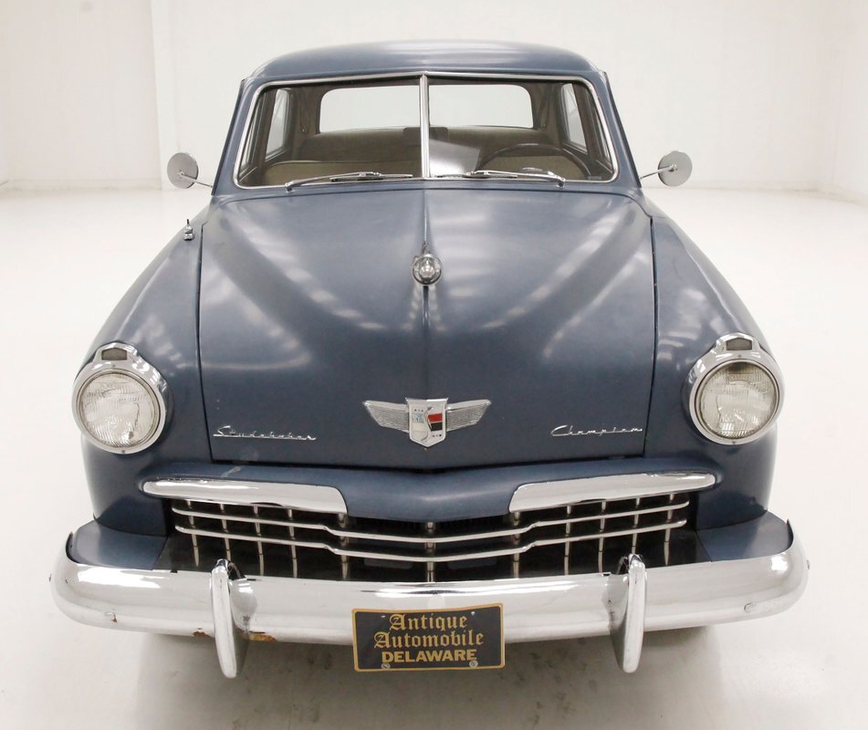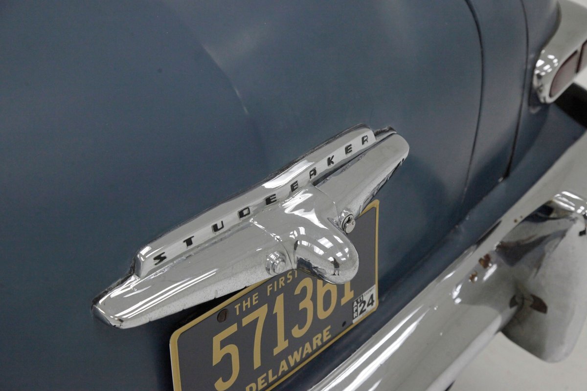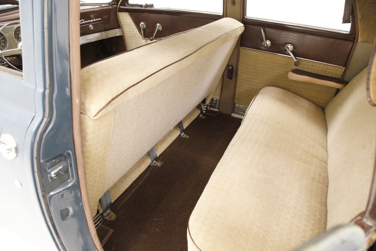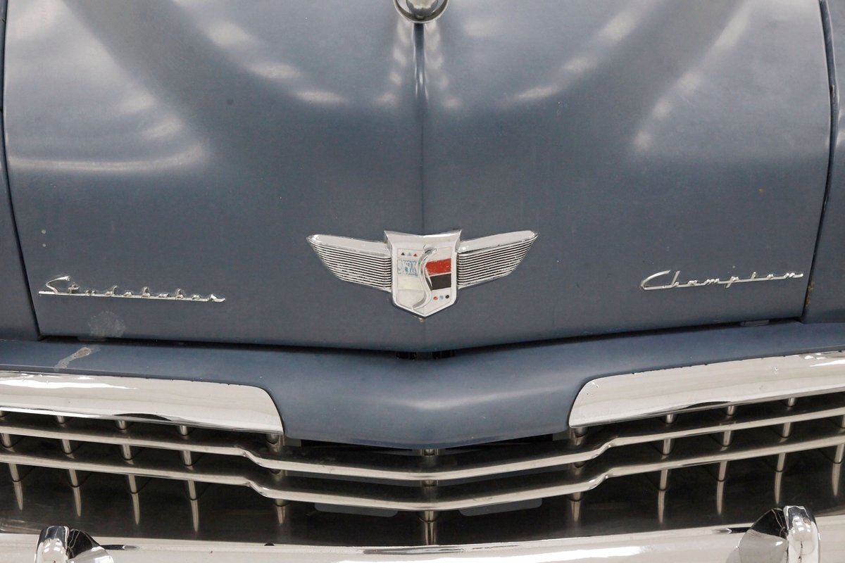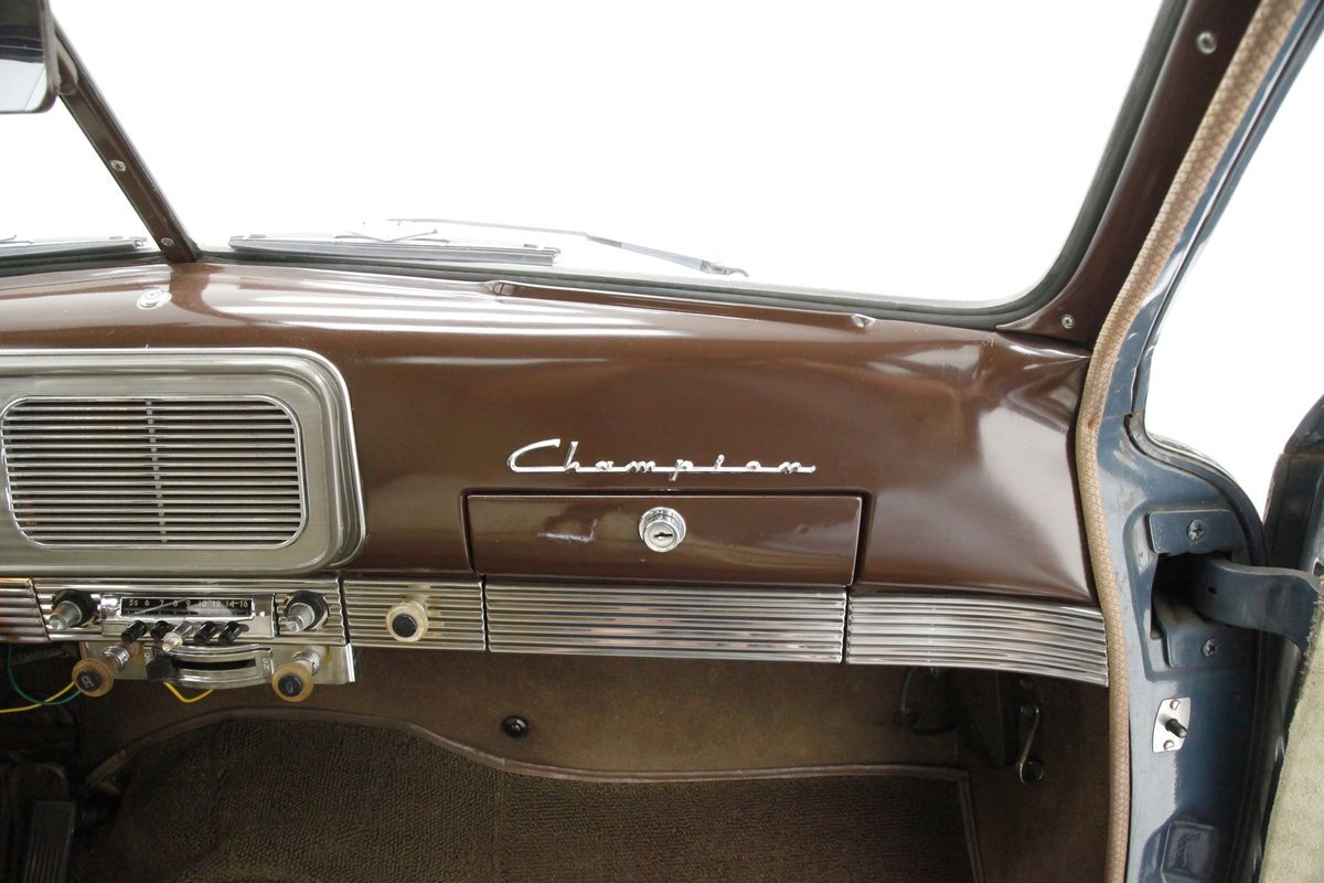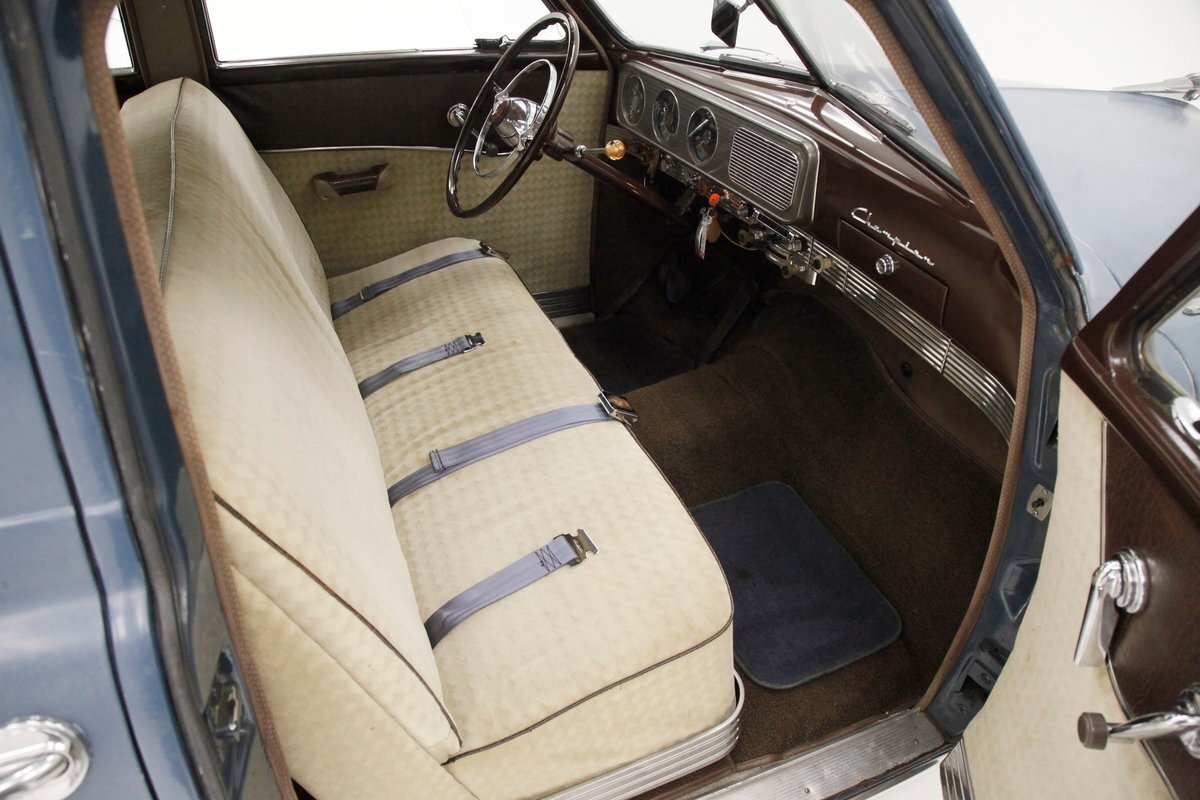 Pontoon styling with its fenders and sleek rear trunk deck which are the first features you'll notice on this car. You'll also see a wrap-around rear greenhouse glass split rear window. Nicely preserved chrome throughout, shaped B pillar door latches, a nice bulbous hood, egg crate grille, futuristic hood ornament and a slight coattail for the trunk lid is in its design. The paint is Concord Blue and has an overall patina and dulled surface with no rust being noted on this steel. Nice chrome trim for the rockers is noted and even a chrome stone guard trimming on the edge of the provided protruding rear fender lead. A cloisonne badge adorns the center of the hood and on either side are the Studebaker and Champion badges in grandmother's handwriting. Black wall tires and simple dog dish chromed wheel coverings on all 4 corners and we are all buttoned top and ready to cruise the highways and save some precious fuel with this lightweight sedan. Lovely.