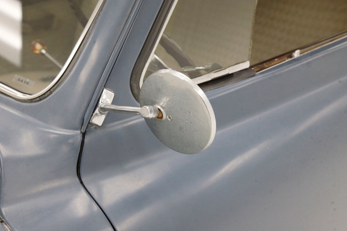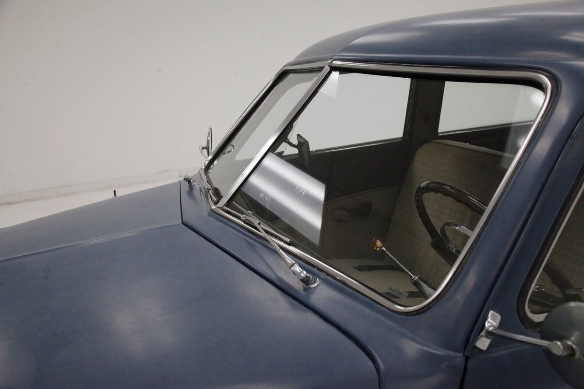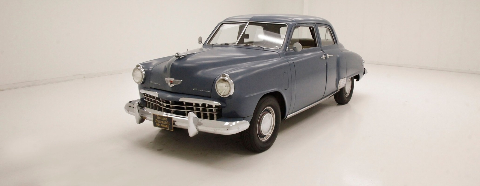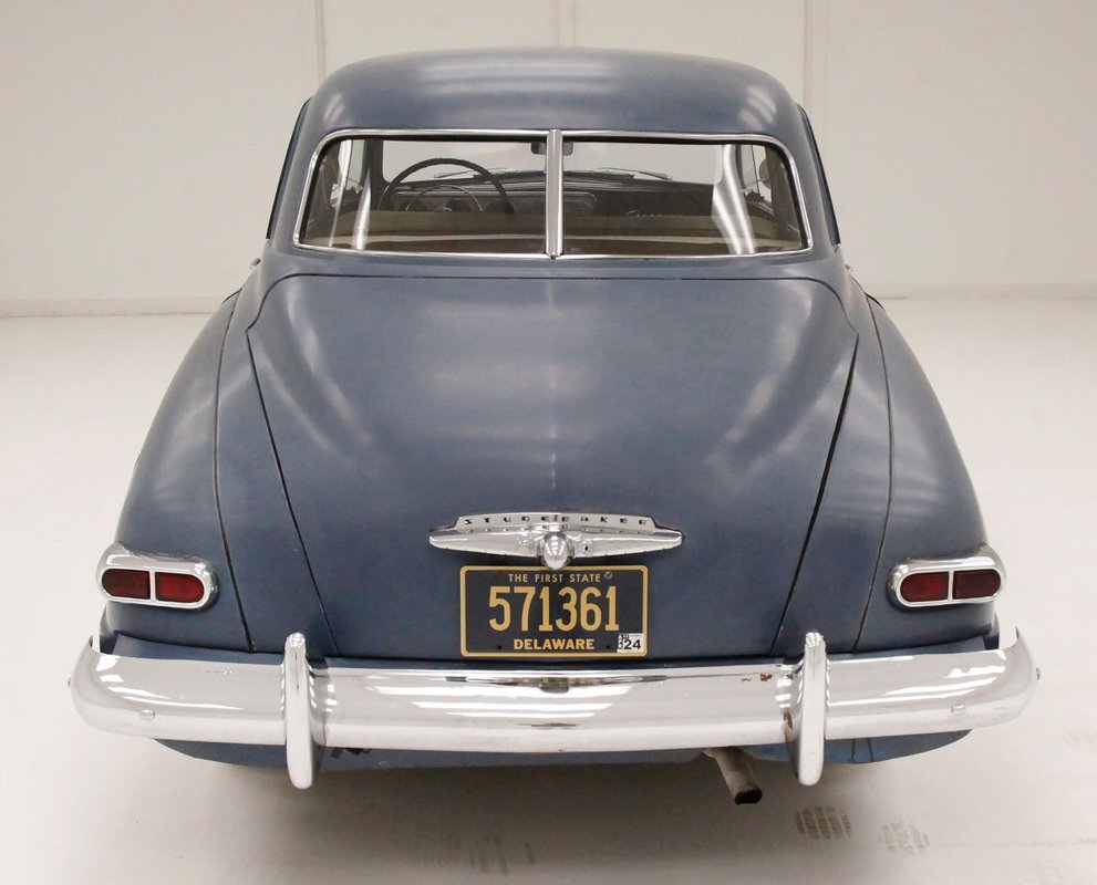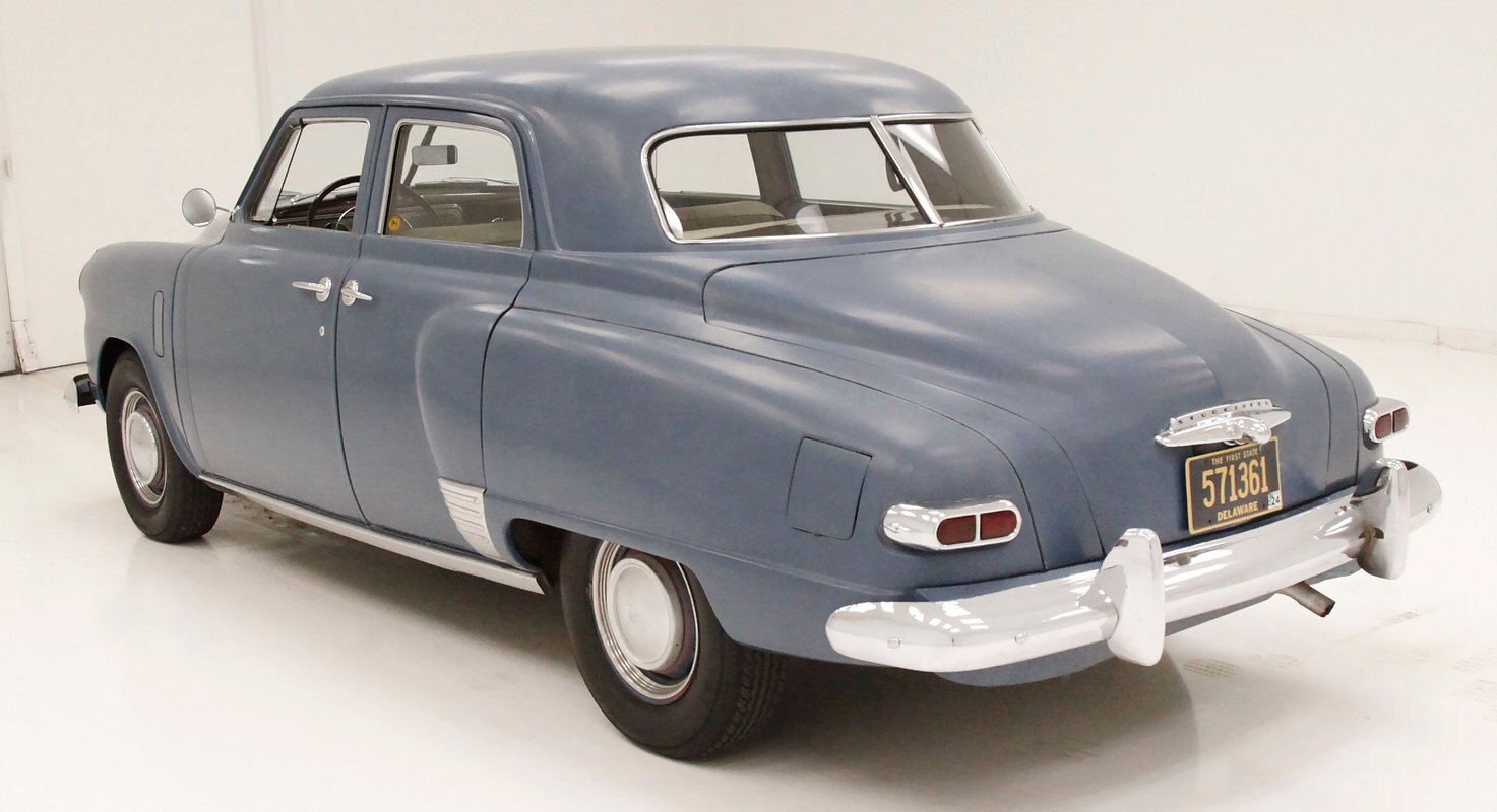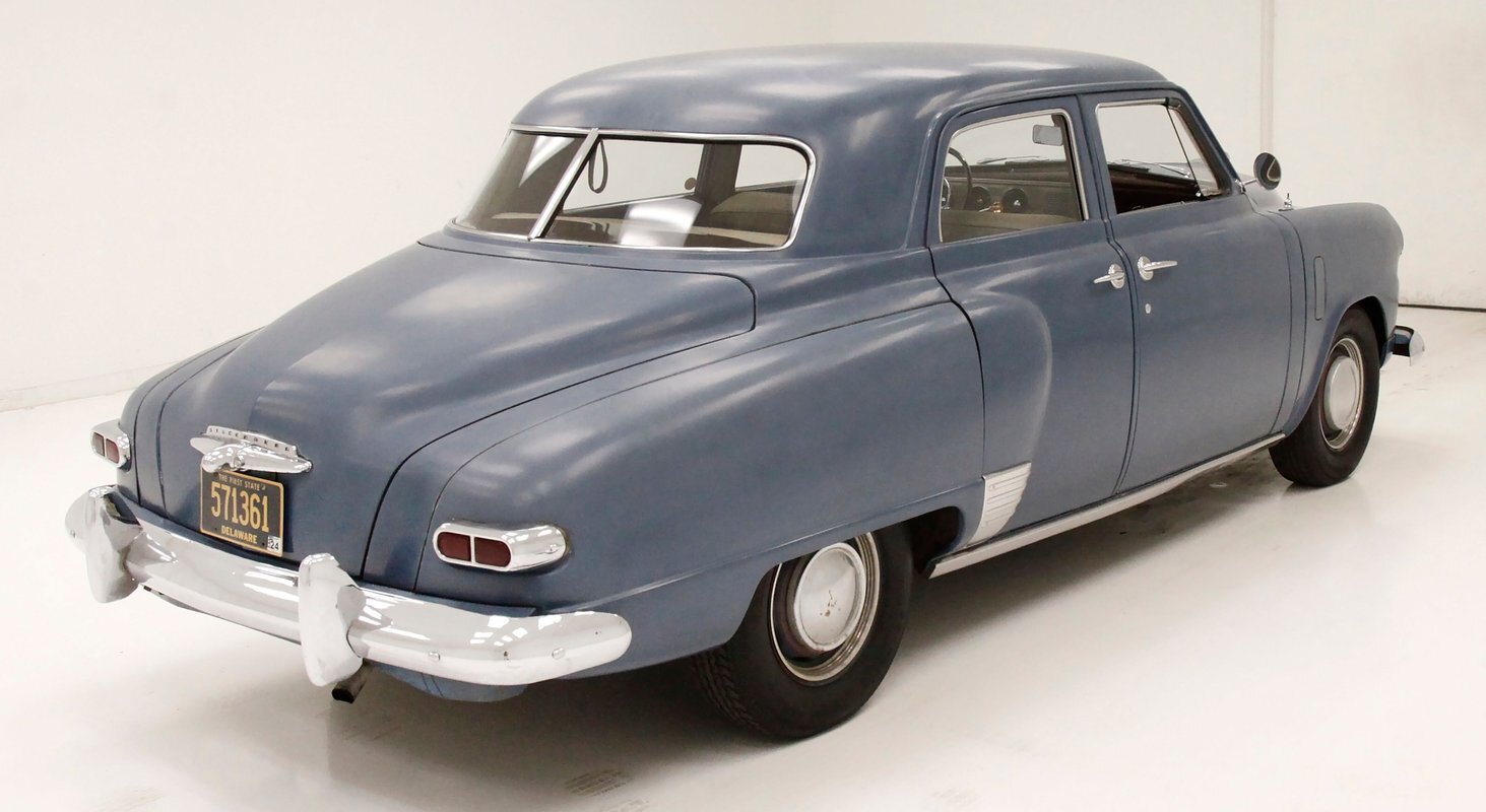 Pontoon styling with its fenders and sleek rear trunk deck which are the first features you'll notice on this car. You'll also see a wrap-around rear greenhouse glass split rear window. Nicely preserved chrome throughout, shaped B pillar door latches, a nice bulbous hood, egg crate grille, futuristic hood ornament and a slight coattail for the trunk lid is in its design. The paint is Concord Blue and has an overall patina and dulled surface with no rust being noted on this steel. Nice chrome trim for the rockers is noted and even a chrome stone guard trimming on the edge of the provided protruding rear fender lead. A cloisonne badge adorns the center of the hood and on either side are the Studebaker and Champion badges in grandmother's handwriting. Black wall tires and simple dog dish chromed wheel coverings on all 4 corners and we are all buttoned top and ready to cruise the highways and save some precious fuel with this lightweight sedan. Lovely.