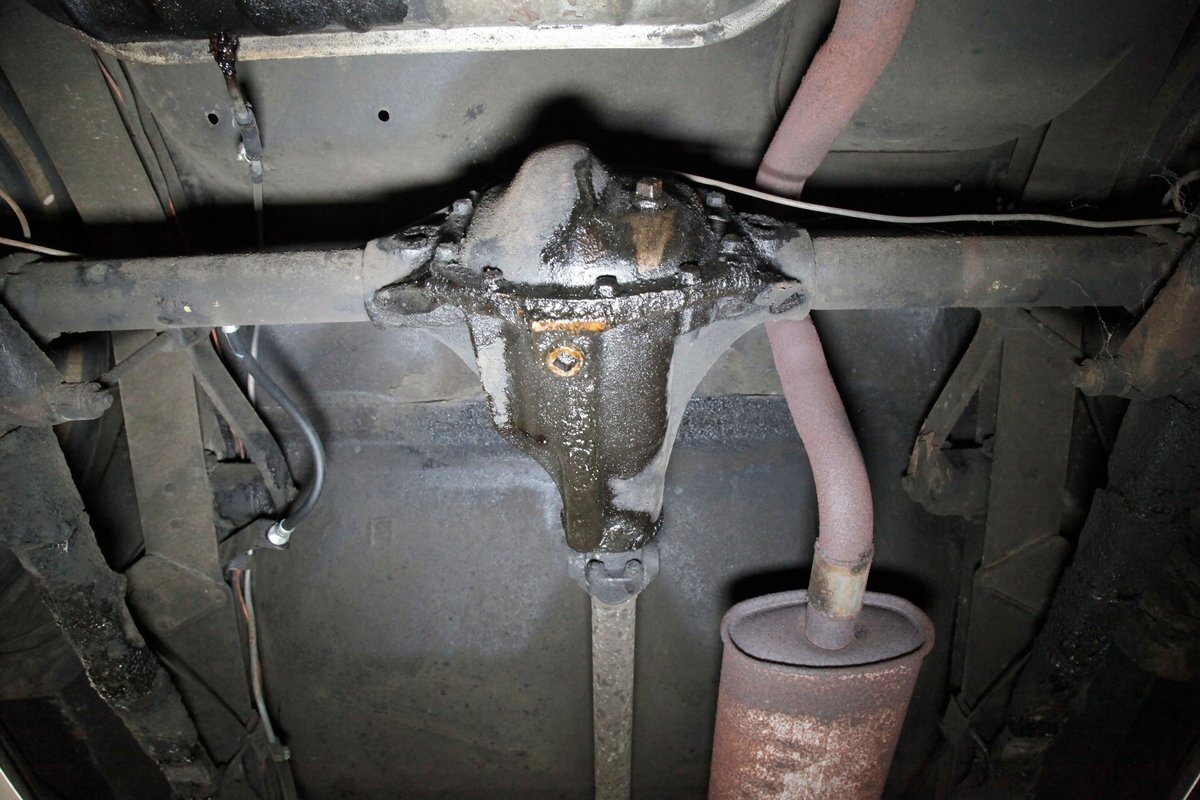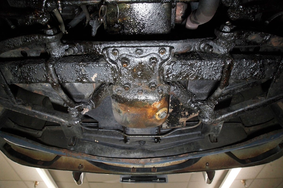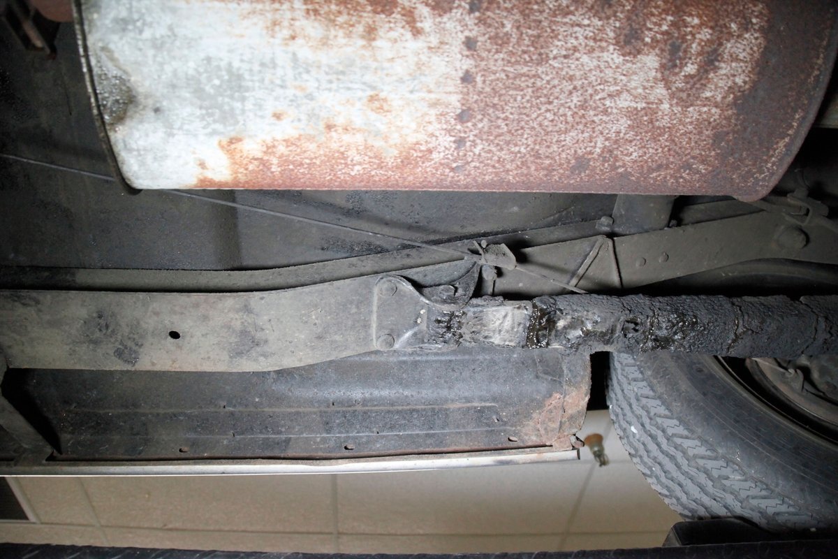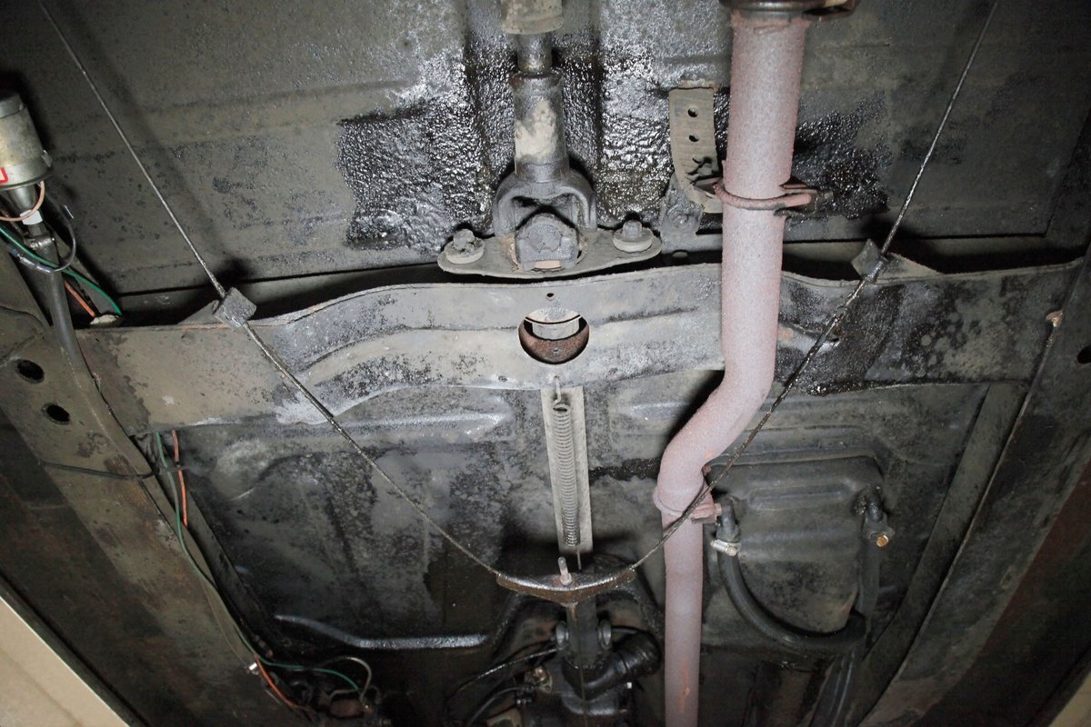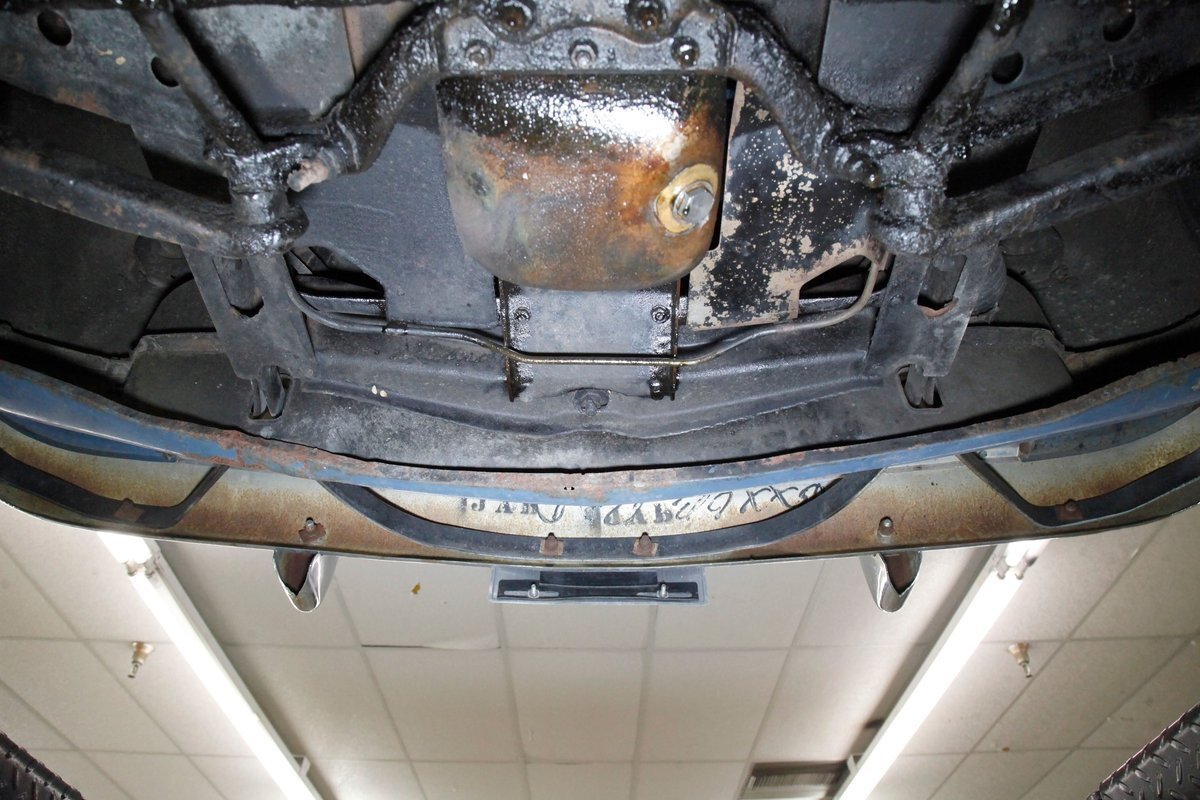 Underneath we see some patina undercoating in black and mostly simple structural steel floor pans and framing. The insides of the rockers is not rusted, and slight oil blowback is noted in the rear axle and lower oil pan oil the engine. Independent coil springs are in front and on back the standard leaf springs. Drum brakes are installed all around. A stock exhaust is noted with no rust.