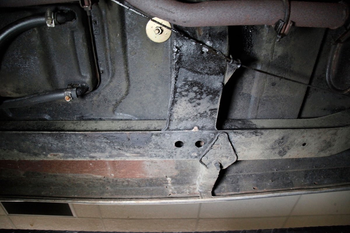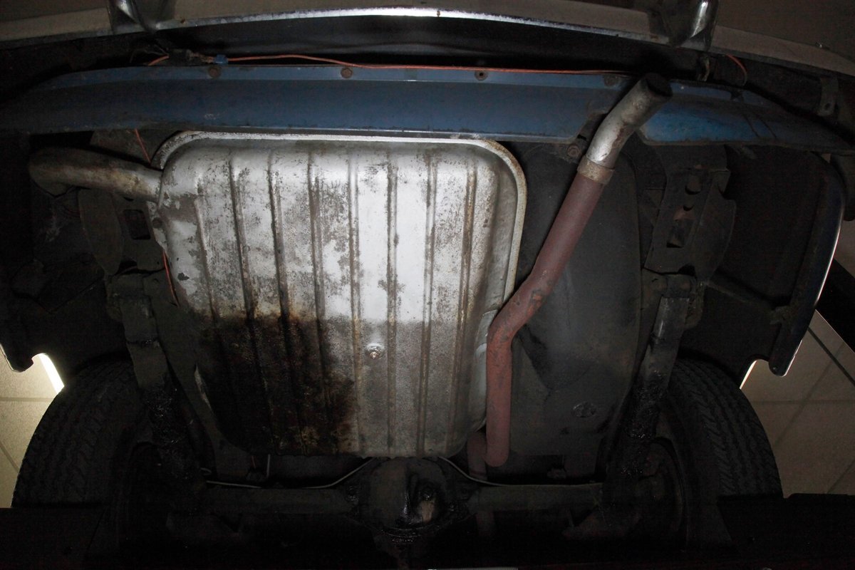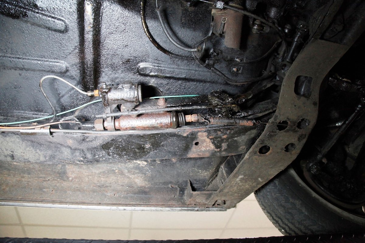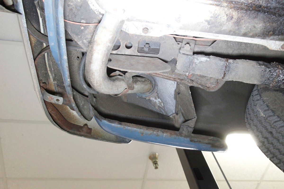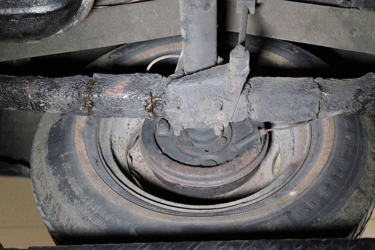 Underneath we see some patina undercoating in black and mostly simple structural steel floor pans and framing. The insides of the rockers is not rusted, and slight oil blowback is noted in the rear axle and lower oil pan oil the engine. Independent coil springs are in front and on back the standard leaf springs. Drum brakes are installed all around. A stock exhaust is noted with no rust.