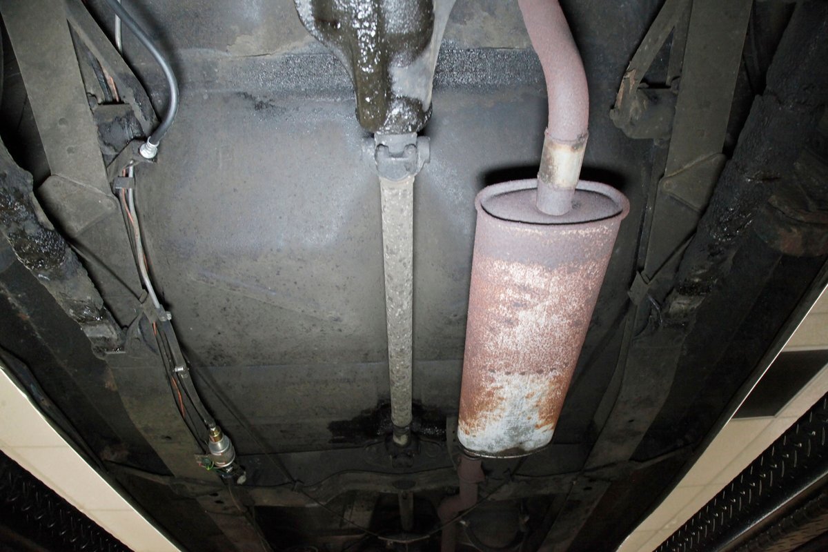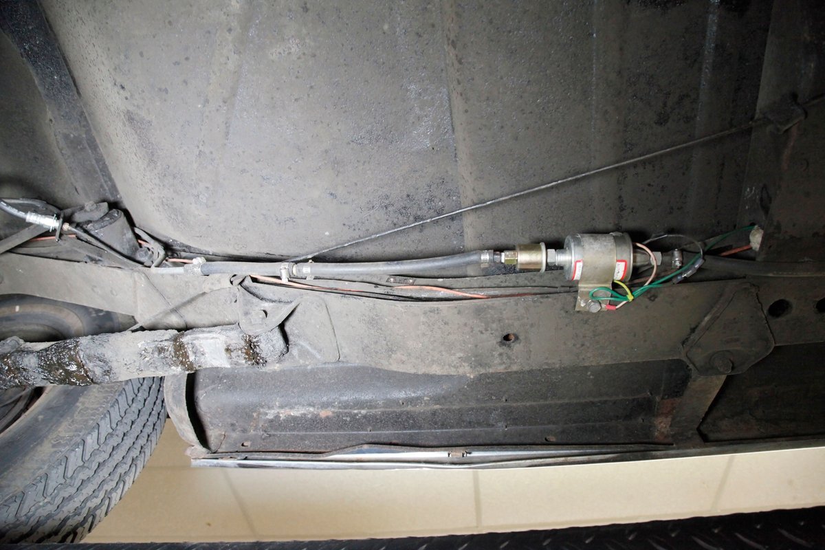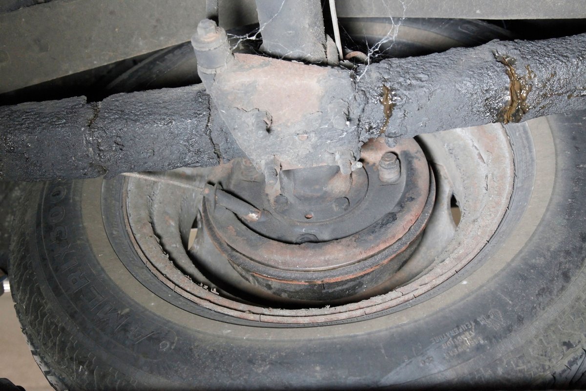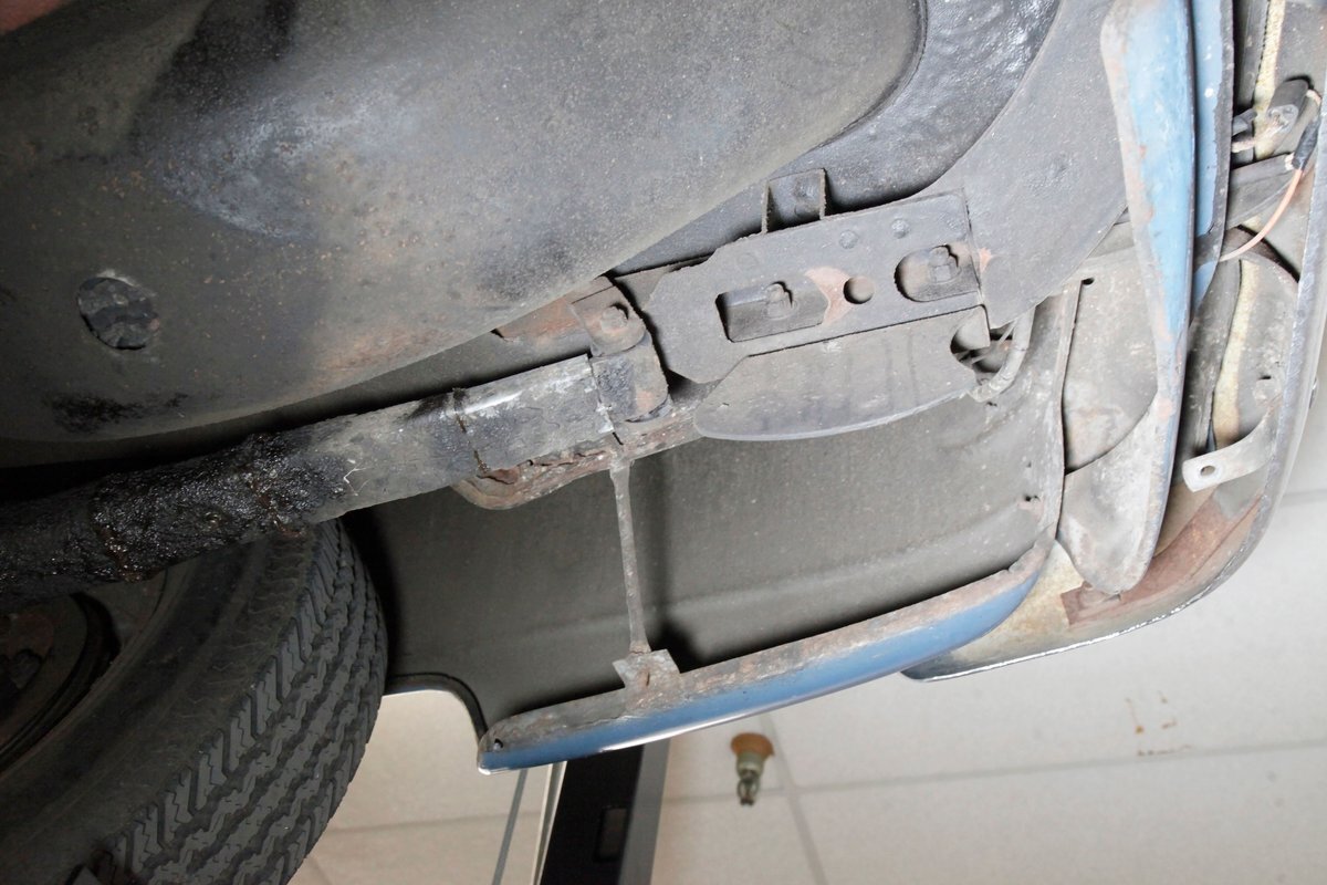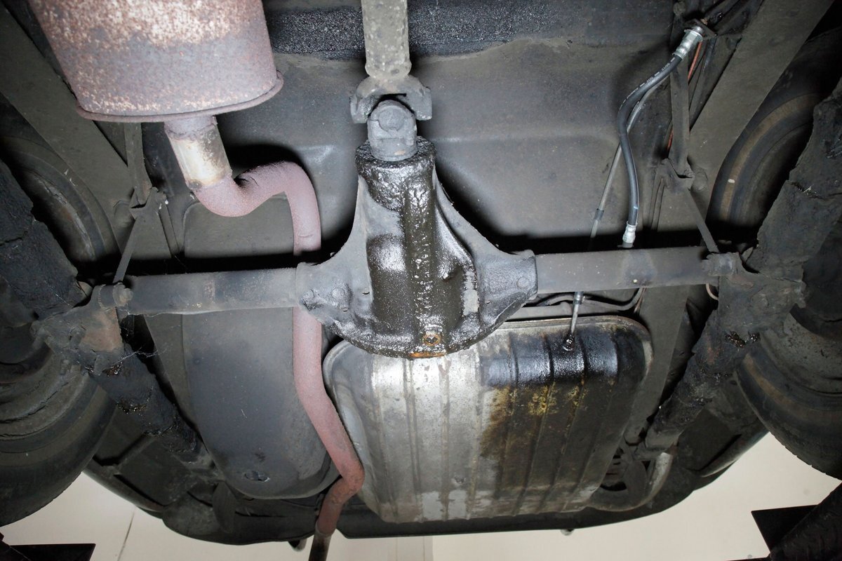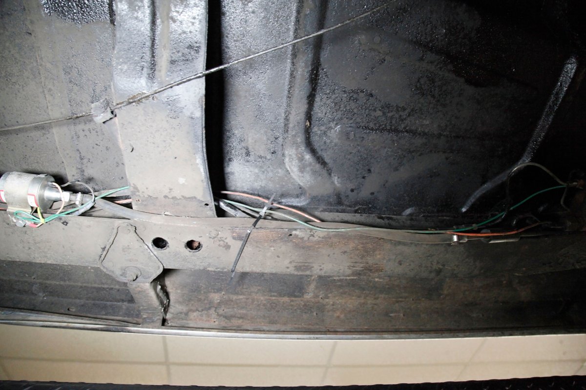 Underneath we see some patina undercoating in black and mostly simple structural steel floor pans and framing. The insides of the rockers is not rusted, and slight oil blowback is noted in the rear axle and lower oil pan oil the engine. Independent coil springs are in front and on back the standard leaf springs. Drum brakes are installed all around. A stock exhaust is noted with no rust.
