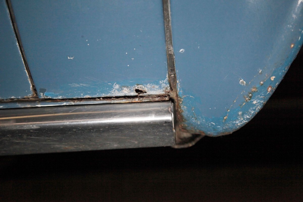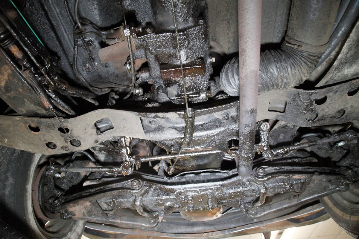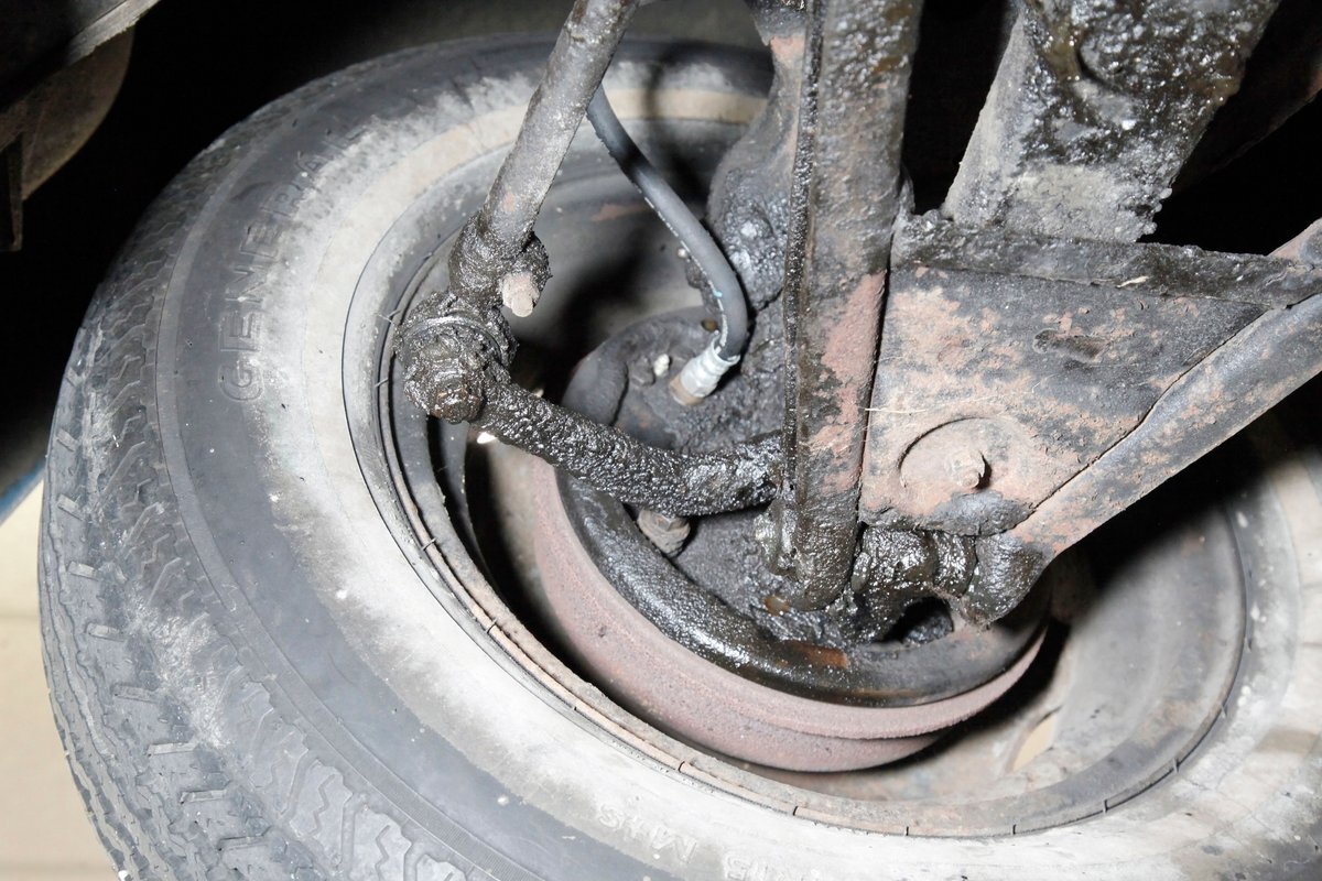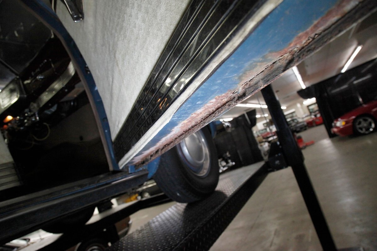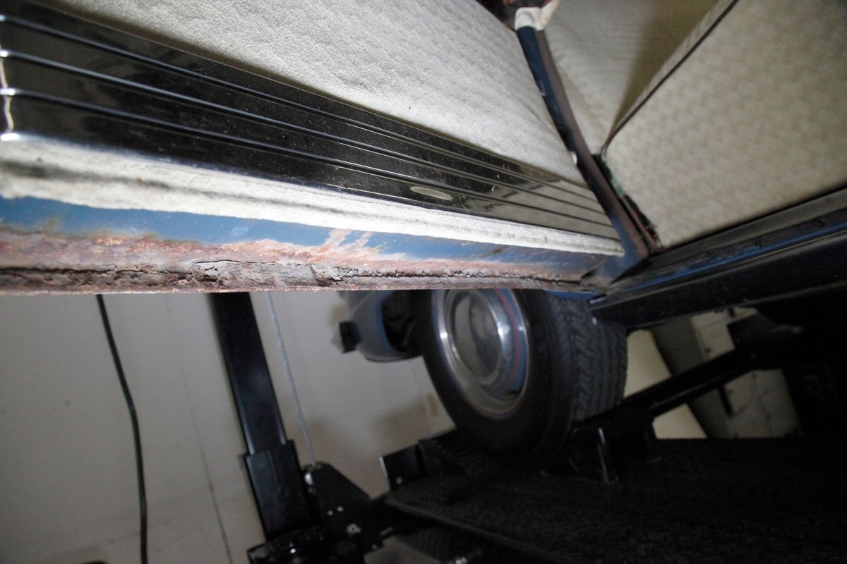 Underneath we see some patina undercoating in black and mostly simple structural steel floor pans and framing. The insides of the rockers is not rusted, and slight oil blowback is noted in the rear axle and lower oil pan oil the engine. Independent coil springs are in front and on back the standard leaf springs. Drum brakes are installed all around. A stock exhaust is noted with no rust.