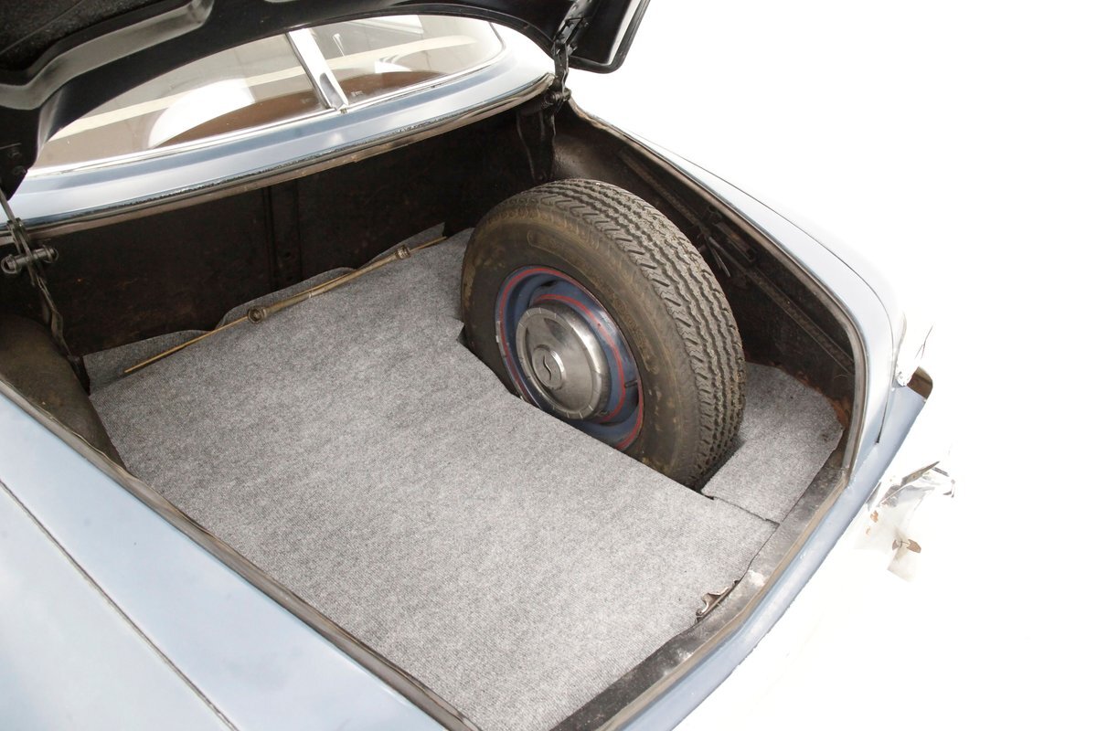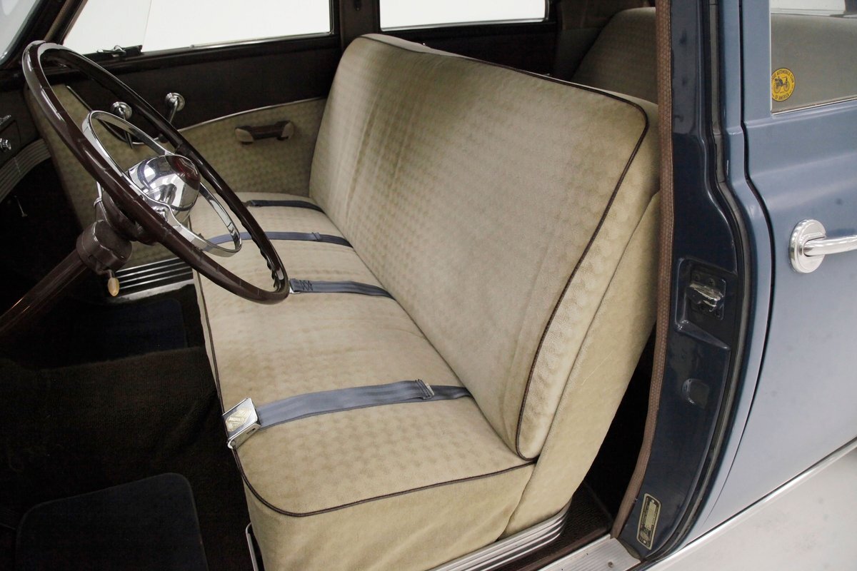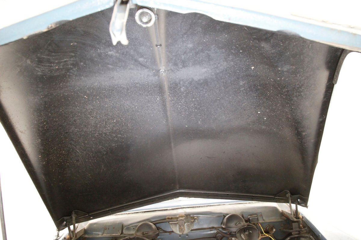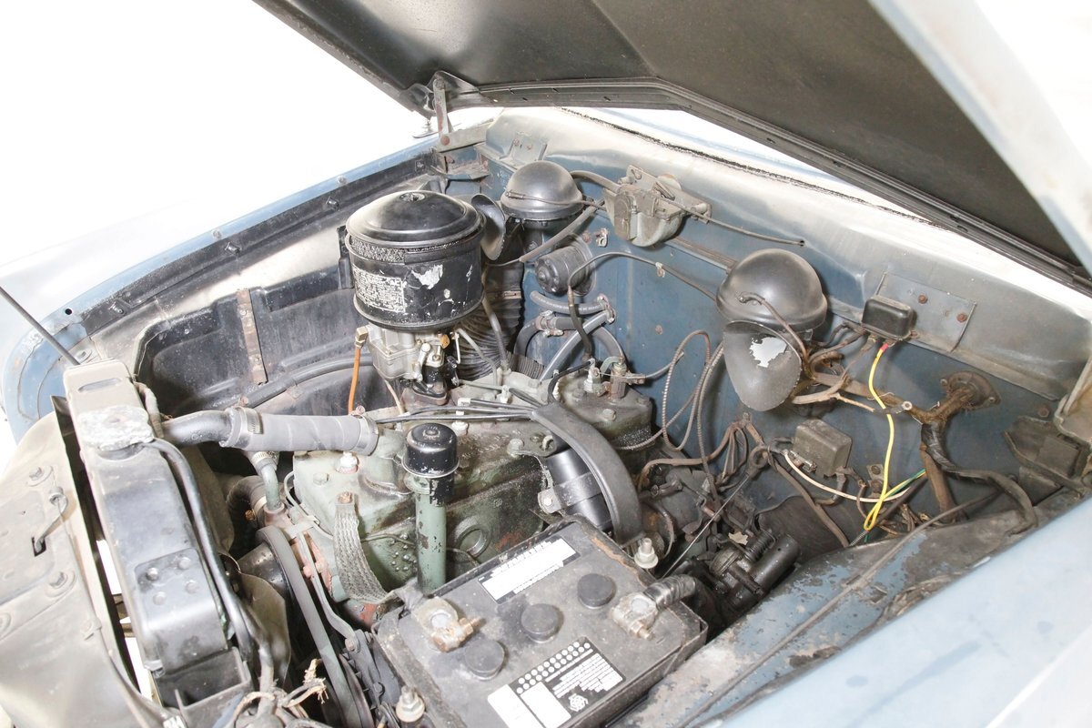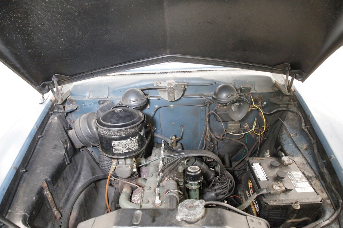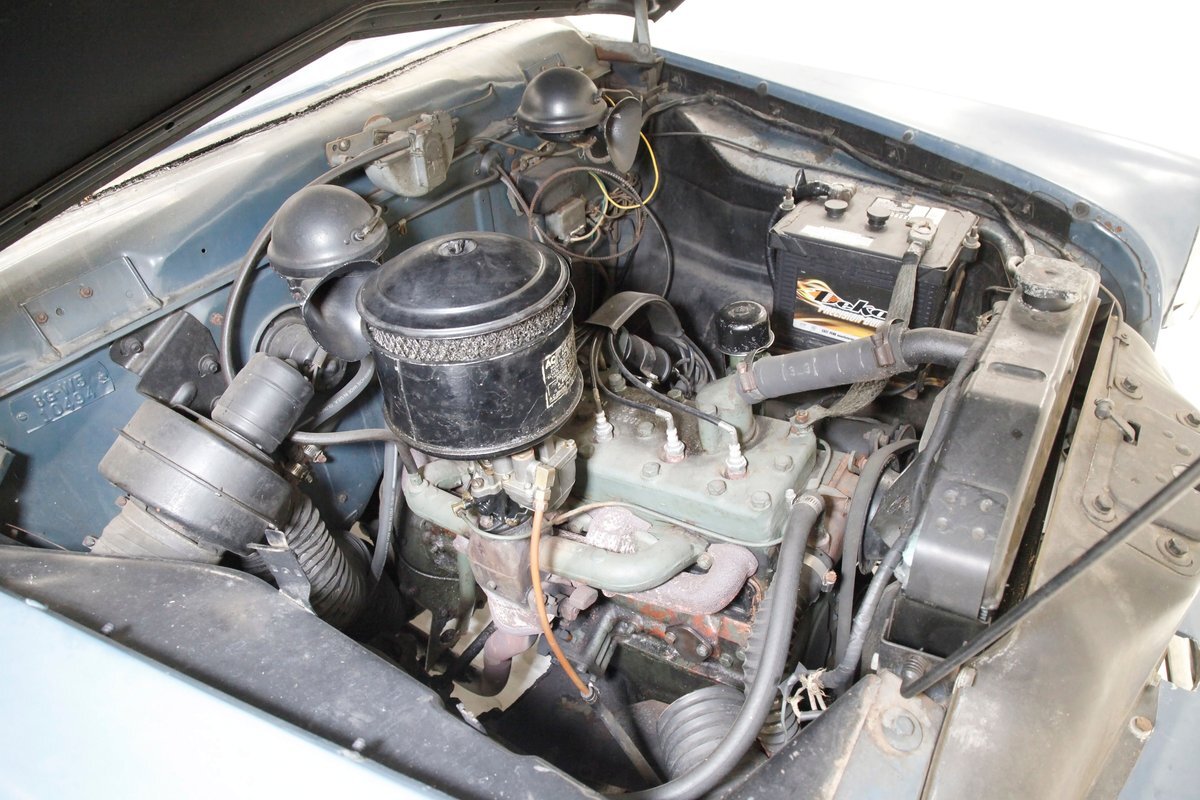 A flip of the hood and we see an unrestored engine bay in the body matching blue. Within its simple confines sits a 169.6ci L-head 6 cylinder mill. It has a 3-speed manual transmission with overdrive and hill hold on back and a 1-barrel oil bath air cleaner covered carburetor feeding it fossils and air. Way back the final drive is weighing in at 4.10.