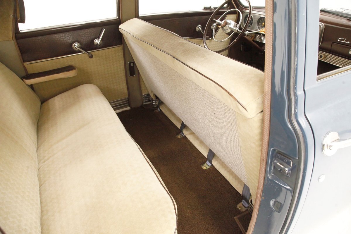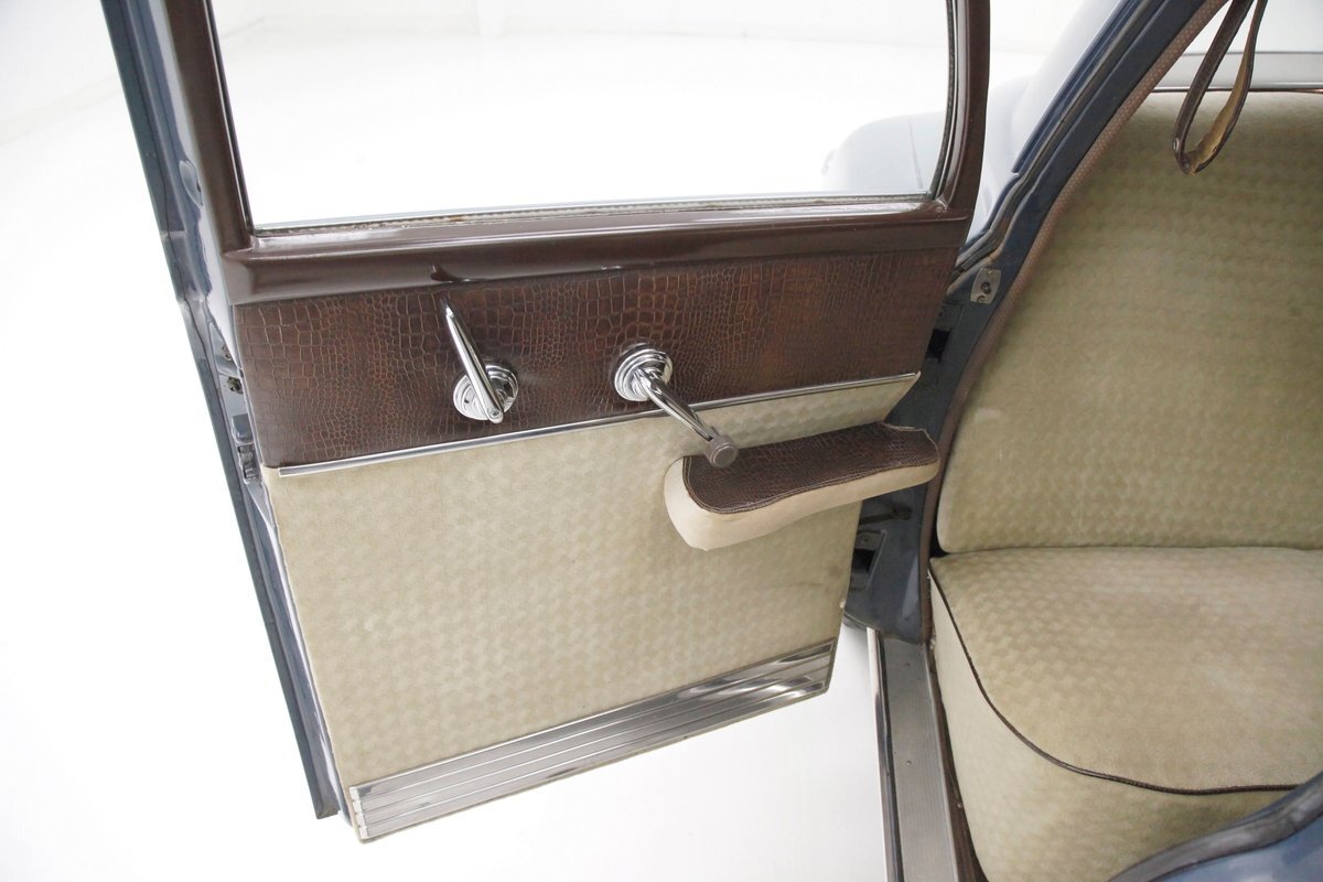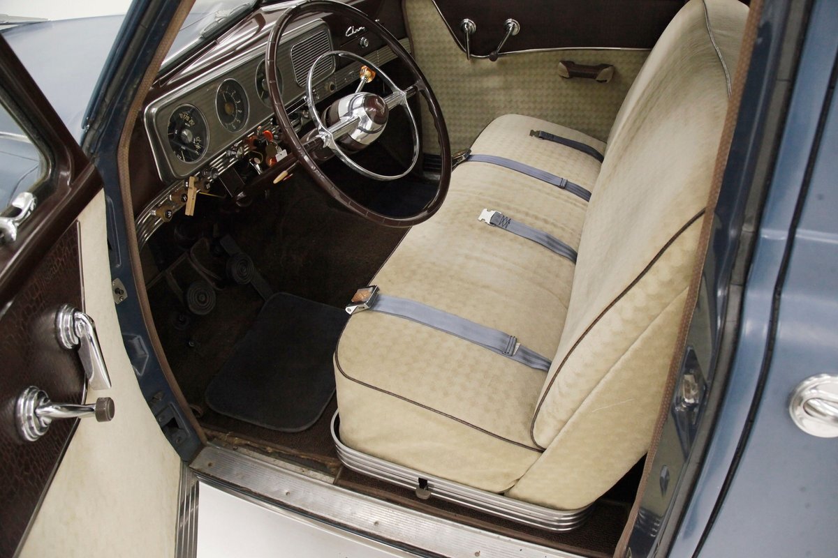 Swinging the door reveals some of the innovative special use of neat fabrics and materials Studebaker was known for. This does not disappoint as we lead off with the door panels in brown alligator textured uppers and a chrome delineation between what is a light frame square textured cream broadcloth lower. It's subtle but effective and these also includes a small armrest and chromed actuators and cranks. Slipping inside I perch myself on more of the cream broadcloth with that subtle check pattern for the inserts and smooth bolsters. Here the delineation is made with blue piping and blue added on seat belts. A ribbed chromed lower tub trimming is on the bottom finishing off nicely this front bench. A swing of the suicide rear doors that share the B pillar with the front doors and another cream checked broadcloth covered bench awaits my rear's arrival with plenty of room. This rear bench has nice long armrests on the doors and these are covered in the alligator dark brown. Deep pile brown carpeting floods the floors front and rear, and a mohair headliner and pillar liner floats above having no stains or rips. Upfront, the chrome encased dash has plenty of knobs and pulls in a horizontal ribbed trimming on the dash lower. Above is another chromed panel with a trio of backlit black face gauges. In the center is a factory radio and just below this hanging off the bottom of the dash is the "climatizer" heating control. The dash top and front of the passenger are full metal jacket steel painted brown and its peppered with more chrome trimming for extra visual eye candy. A brown bakelite steering wheel with a chromed central horn ring and a rocket nose center in clear plastic with the Studebaker lazy S embedded into it. I'm very impressed that the Studebaker designers did not let me down in this interior. Smashing.