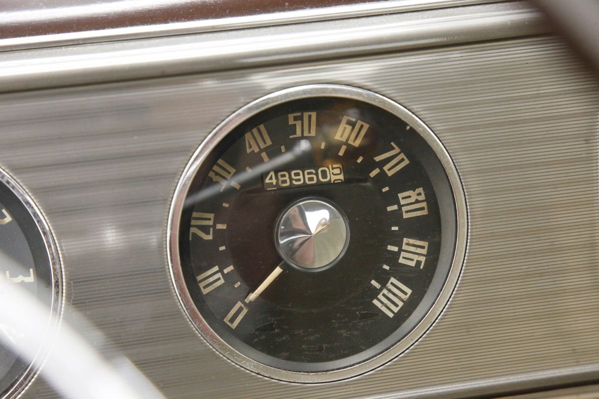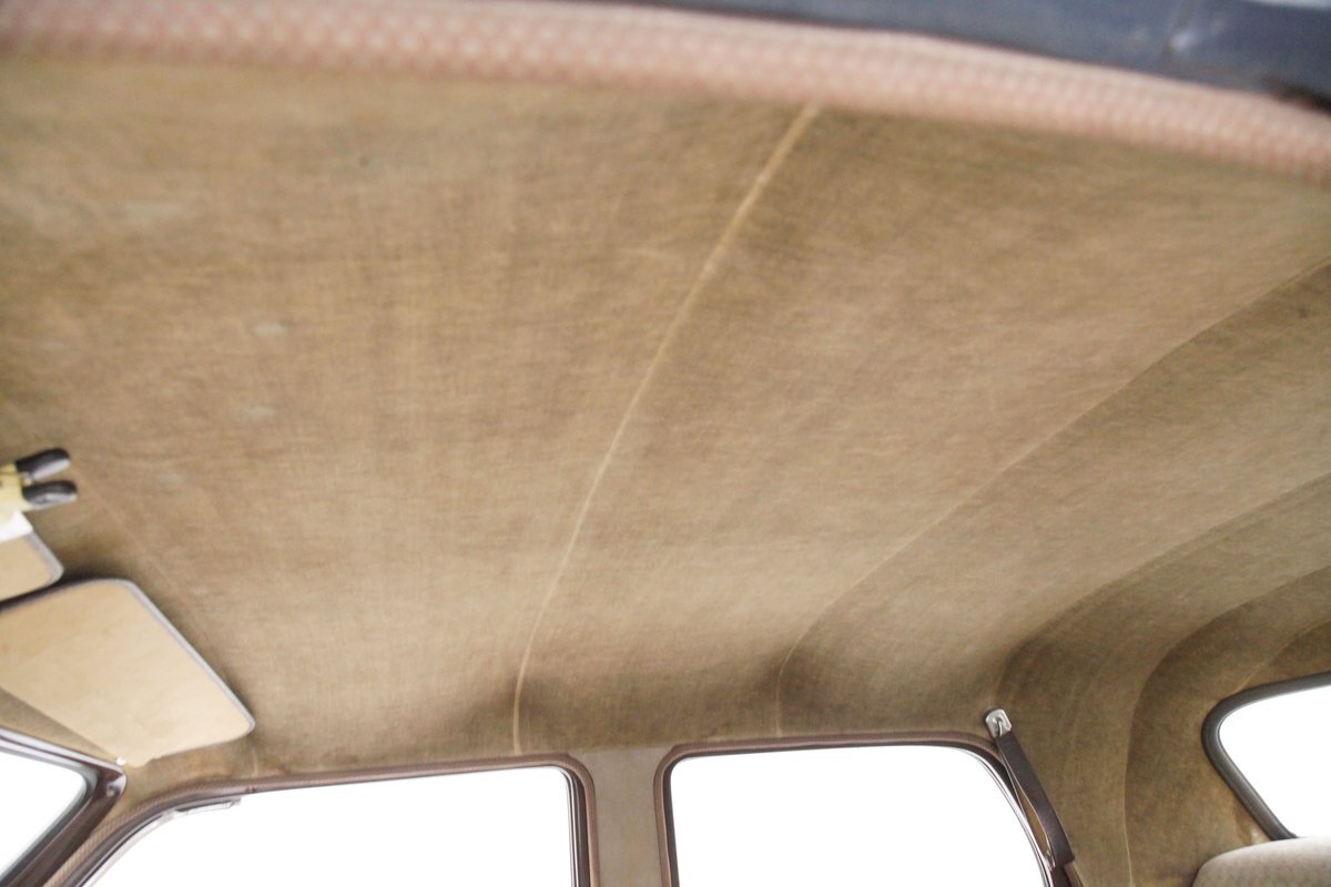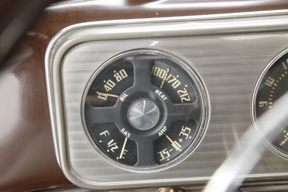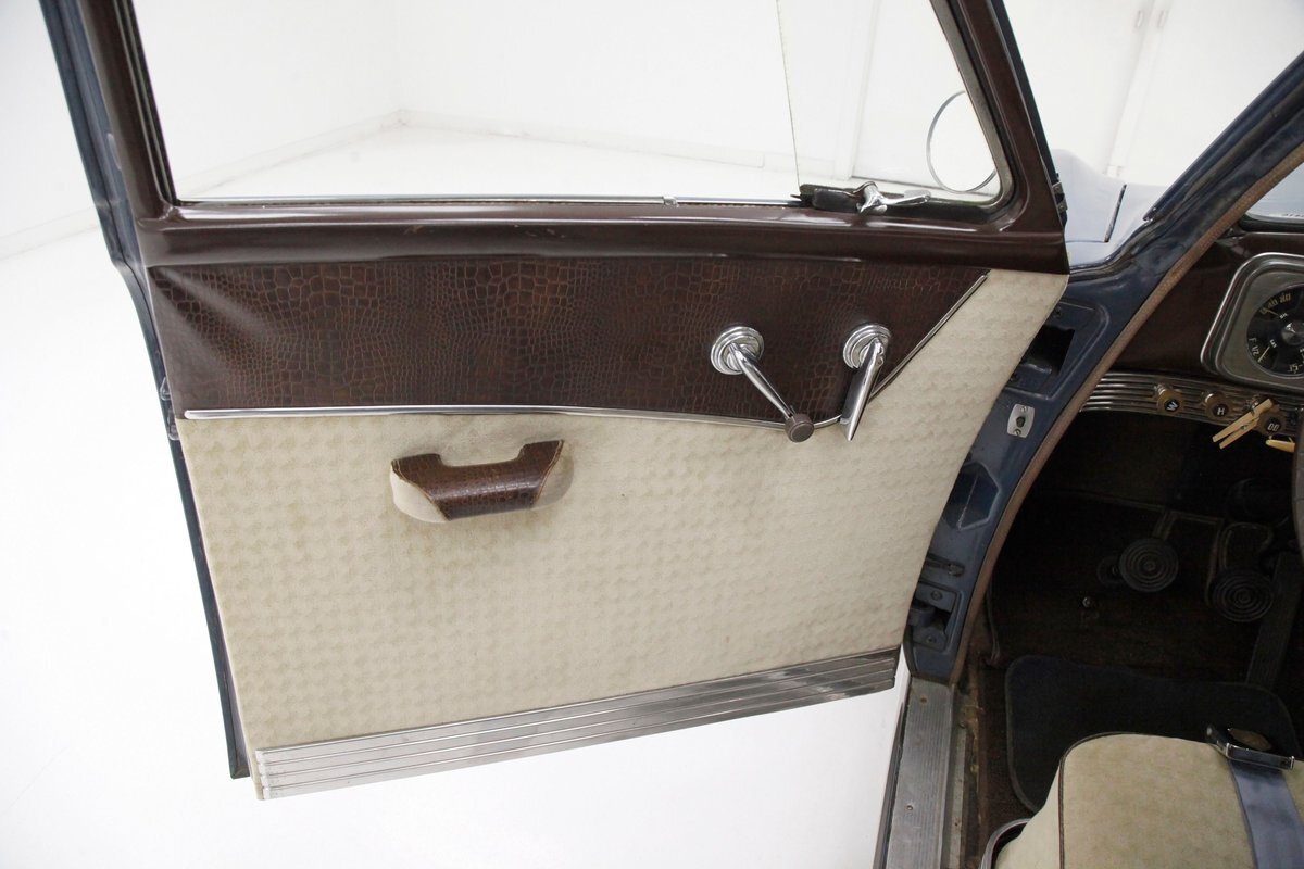 Swinging the door reveals some of the innovative special use of neat fabrics and materials Studebaker was known for. This does not disappoint as we lead off with the door panels in brown alligator textured uppers and a chrome delineation between what is a light frame square textured cream broadcloth lower. It's subtle but effective and these also includes a small armrest and chromed actuators and cranks. Slipping inside I perch myself on more of the cream broadcloth with that subtle check pattern for the inserts and smooth bolsters. Here the delineation is made with blue piping and blue added on seat belts. A ribbed chromed lower tub trimming is on the bottom finishing off nicely this front bench. A swing of the suicide rear doors that share the B pillar with the front doors and another cream checked broadcloth covered bench awaits my rear's arrival with plenty of room. This rear bench has nice long armrests on the doors and these are covered in the alligator dark brown. Deep pile brown carpeting floods the floors front and rear, and a mohair headliner and pillar liner floats above having no stains or rips. Upfront, the chrome encased dash has plenty of knobs and pulls in a horizontal ribbed trimming on the dash lower. Above is another chromed panel with a trio of backlit black face gauges. In the center is a factory radio and just below this hanging off the bottom of the dash is the "climatizer" heating control. The dash top and front of the passenger are full metal jacket steel painted brown and its peppered with more chrome trimming for extra visual eye candy. A brown bakelite steering wheel with a chromed central horn ring and a rocket nose center in clear plastic with the Studebaker lazy S embedded into it. I'm very impressed that the Studebaker designers did not let me down in this interior. Smashing.