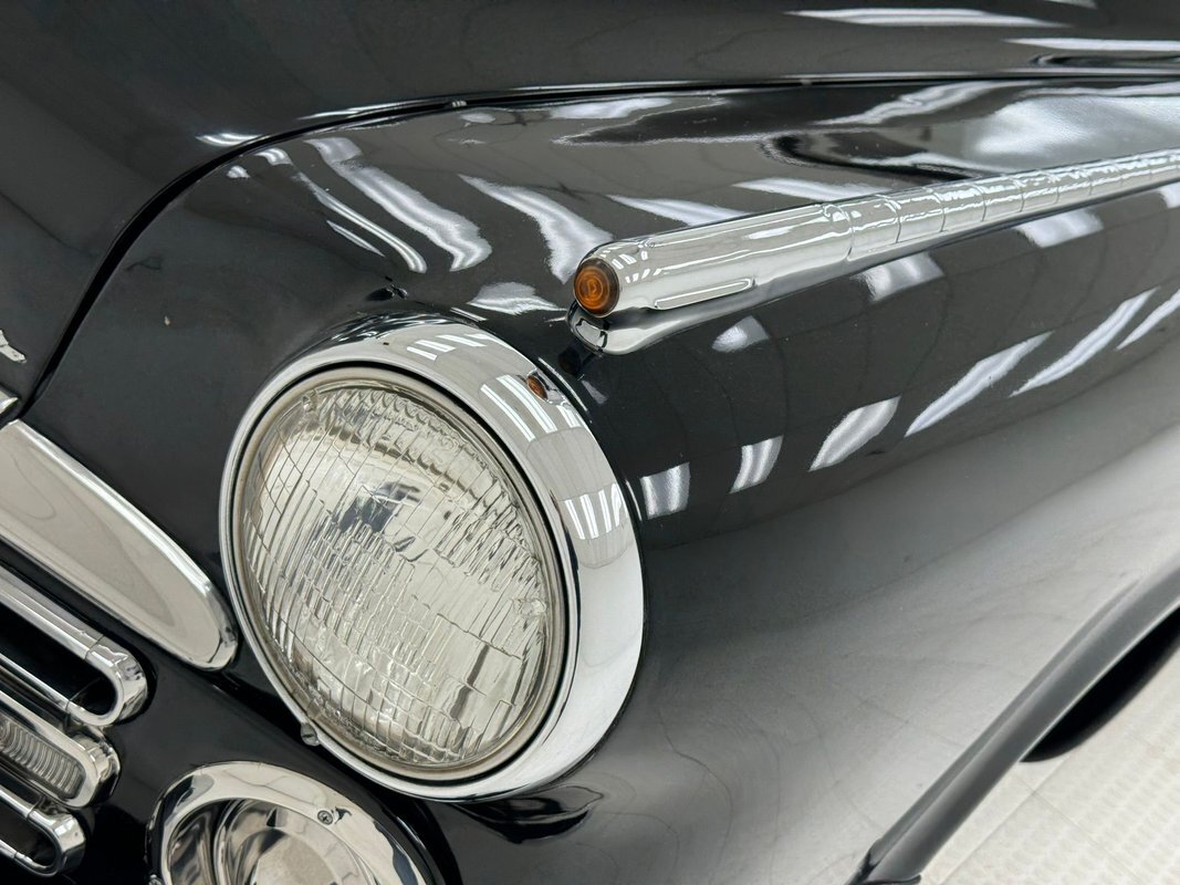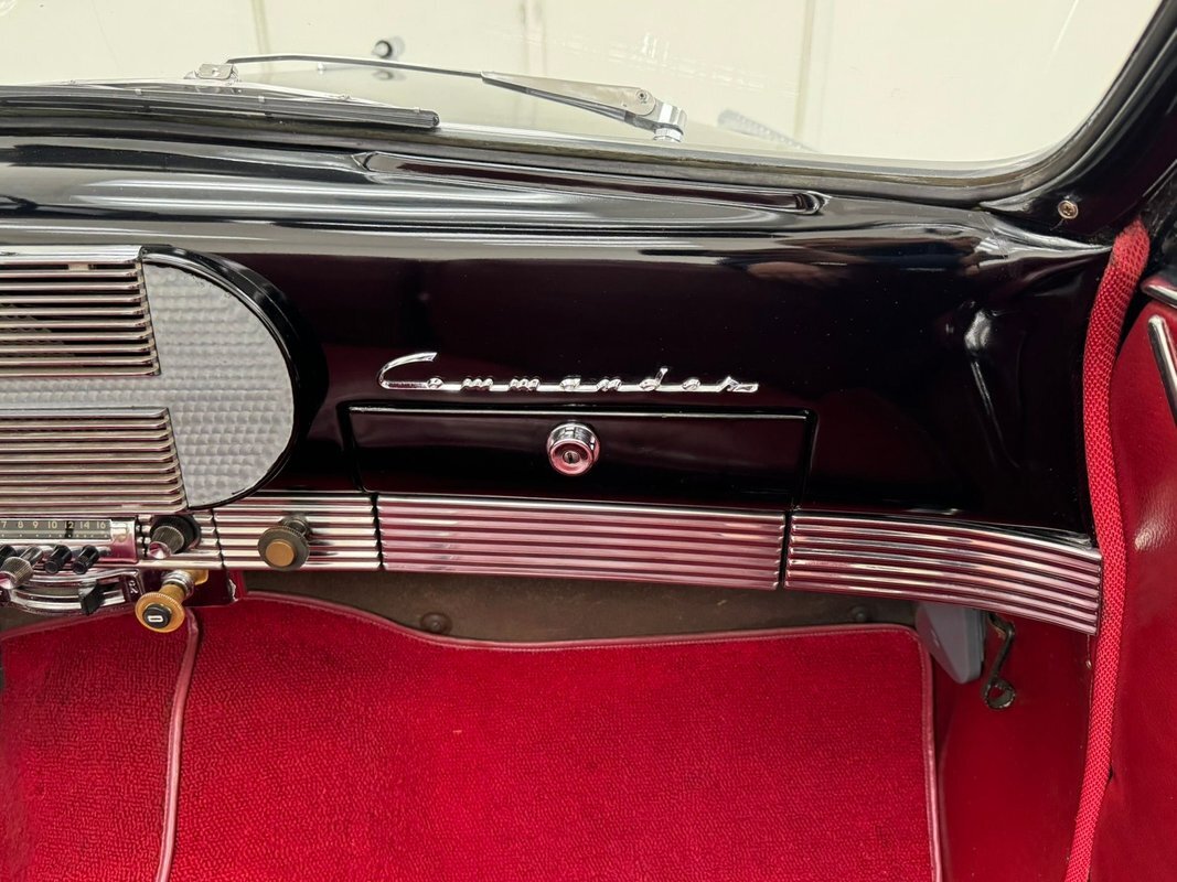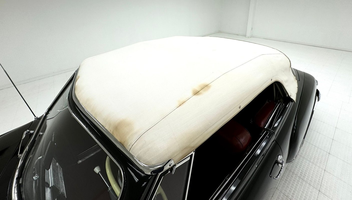 Velvet Black paint covers the extent of this large car, and the grille does show the extra shine with molding between the slots and the large rectangular piece in the center. The wraparound bumper with large bumper guards sits further outboard than in previous years and stainless steel rocker panel moldings and gravel guards were specific to the Regal Deluxe. Fender ornaments with lights leading the way are beautifully streamlined and designed. The hood ornament resembles a bomb while the Studebaker crest sits boldly on the nose. Everything is in wonderful condition. The front fenders also feature a vent behind decorative slats and the rear fender includes skirts over the rear wheels. The ivory canvas top has a bit of discoloration, a few loose threads, and a small hole or two, but is in good condition with its glass window in place. The rear taillights have distinctive four segments that helped differentiate it from the Studebaker Champion. We note a scratch near one of the skirts as the only defect worthy of documentation.