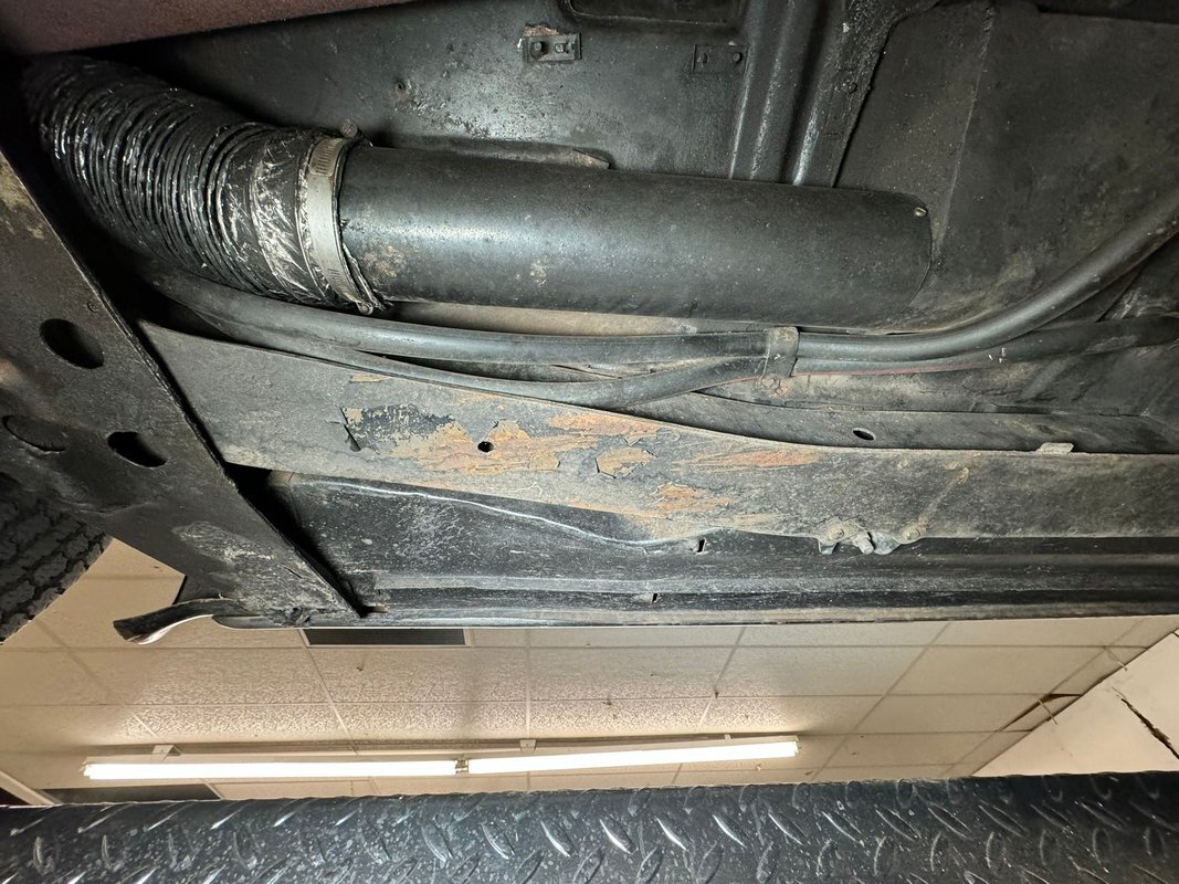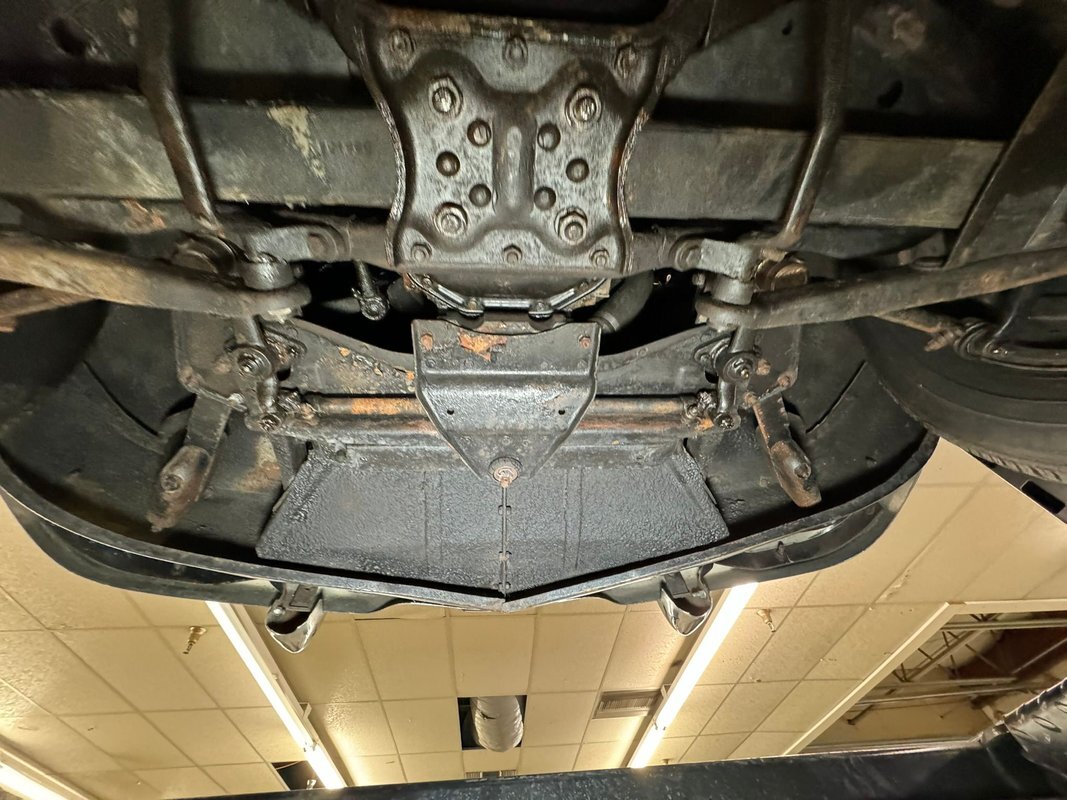 For a car that's 75 years old, it's remarkably clean and dry underneath. We are not sure of true mileage, but it's potentially very low, and the underside is evidence of that. We see normal surface rust on untreated metals, but no invasive rust is noted. The single exhaust enters a long stock style muffler and then heads back to exit beyond the rear bumper and a decorative exhaust deflector is on the very end. A transverse leaf spring is used up front while leaf springs in north south configuration are out back.