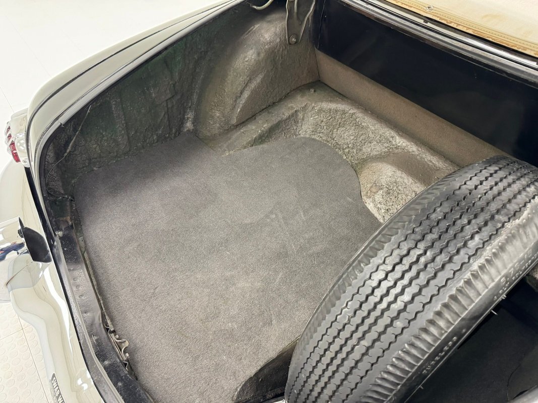 Oxblood, our favorite interior color, colors the vinyl that is stretched over the door panel in a simple, smooth design. The large split bench seat is gleaming and smooth as well and the rear bench which is narrower due to the soft top hardware, is in beautiful condition. The ivory colored Deluxe Regal steering wheel is stunning, three spokes with a horn ring floating inside the larger circle. Three large gauges with black faces and ivory art deco style lettering reside in a machined metal backing, (Trans Am owners take note!), below which we find knobs and buttons for various functions and simply labeled. The center area with a metal slatted speaker face is on top of an AM radio with a wonderful and robust metal face. The black painted dash contrasts with the red low pile carpet piece that covers the floor. The large trunk is clean and partially covered with a gray mat and home to a spare tire mounted upright.