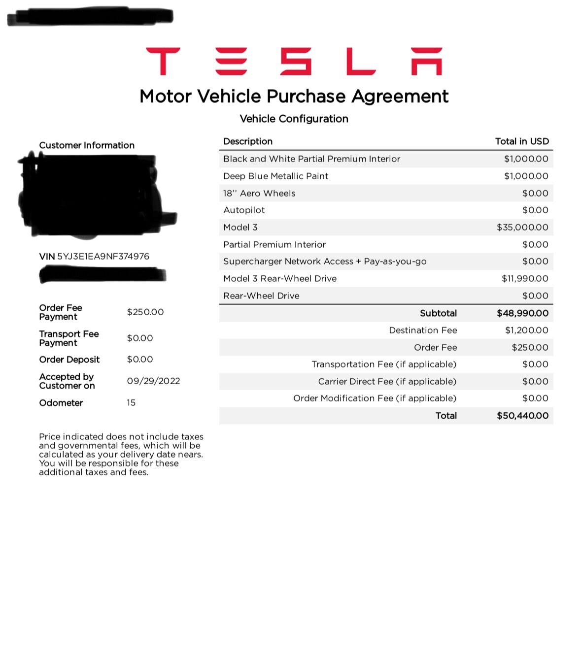 2022 Tesla Model 3 standard rear wheel drive blue with white interior see attached photo of purchase agreement with Tesla.Seller's Notes
