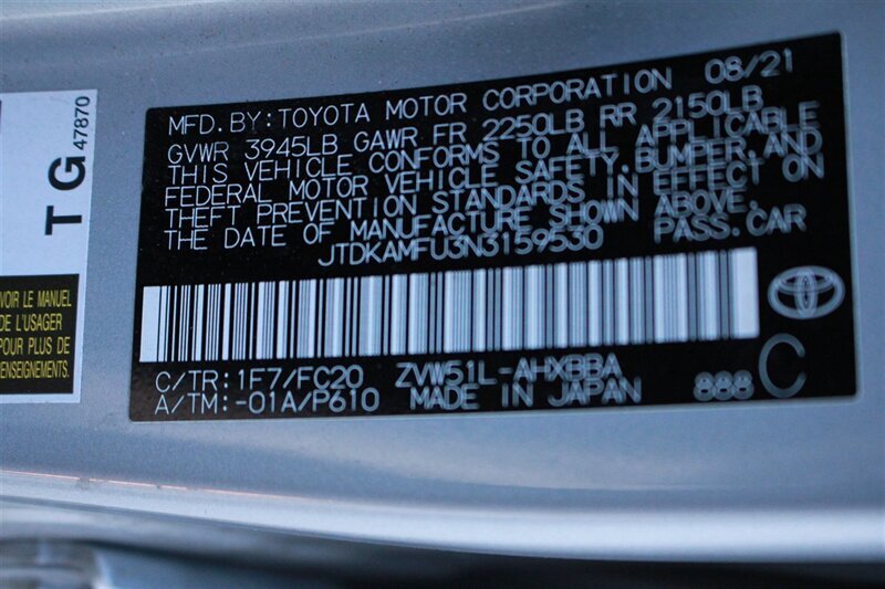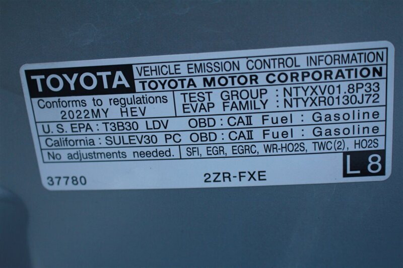 INSTALLED FEATURES: Air filtration, Front air conditioning: automatic climate control, Front air conditioning zones: single, Humidity/dewpoint sensors, Airbag deactivation: occupant sensing passenger, Front airbags: dual, Knee airbags: driver, Seat cushion airbags: passenger front, Side airbags: front / rear, Side curtain airbags: front / rear, Antenna type: diversity / mast, Auxiliary audio input: Bluetooth / USB / iPod/iPhone / jack, Radio: AM/FM / touch screen display / voice operated, Radio data system, Satellite radio: SiriusXM, Speed sensitive volume control, Total speakers: 6, ABS: 4-wheel, Braking assist, Cornering brake control, Electronic brakeforce distribution, Electronic parking brake: auto off, Emergency braking preparation, Front brake diameter: 10.0, Front brake type: ventilated disc, Power brakes, Rear brake diameter: 10.2, Rear brake type: disc, Regenerative braking system, Armrests: rear center with cupholders / rear folding, Floor material: carpet, Interior accents: chrome, Steering wheel trim: urethane, Adaptive cruise control, Adaptive stop and go cruise control: semi-automatic, Assist handle: front / rear, Autonomous lane guidance: lane centering, Cargo area light, Center console: front console with armrest and storage, Courtesy lights: door, Cupholders: front / rear, Multi-function remote: panic alarm / proximity entry system / trunk release, One-touch windows: 4, Overhead console: front, Power outlet(s): 12V front / USB front / USB rear, Power steering, Power windows: lockout button, Push-button start, Reading lights: front / rear, Rearview mirror: manual day/night, Steering wheel: tilt and telescopic, Steering wheel mounted controls: audio / cruise control / multi-function / phone / voice control, Storage: accessory hook / cargo tie-down anchors and hooks / door pockets / grocery bag holder / sunglasses holder, Vanity mirrors: dual illuminating, Axle ratio: 4.11, Drive mode selector, Auto start/stop, Battery saver, Electric motor battery type: lithium ion, Electric Motor HP: 71, Electric Motor Power Output (Kilowatts): 53, Electric Motor Torque: 120, EV battery capacity: 0.83 kWh, Hybrid Gas Engine HP: 96, Hybrid Gas Engine HP@RPM: 5200, Hybrid Gas Engine Torque: 105, Hybrid gas Engine Torque@RPM: 3600, Active grille shutters, Door handle color: body-color, Front bumper color: body-color, Grille color: black, Mirror color: body-color, Rear bumper color: black, Rear trunk/liftgate: liftgate, Rocker panel color: body-color, Window trim: black, Starter type: motor/generator, Connected in-car apps: Amazon Alexa / Google POIs / Google search, Infotainment screen size: 7 in., Smartphone integration: Android Auto / Apple CarPlay, Clock, Digital odometer, External temperature display, Fuel economy display: MPG / range, Instrument cluster screen size: 4.2 in., Multi-function display, Trip odometer, Warnings and reminders: low battery / low fuel level / maintenance due, Daytime running lights: LED, Headlights: LED / auto delay off / auto high beam dimmer, Taillights: LED, Side mirror adjustments: manual folding / power, Side mirrors: heated, Automatic emergency braking: front / front pedestrian, Camera system: rearview, Check rear seat reminder, Child safety door locks, Child seat anchors: LATCH system, Crumple zones: front / rear, Impact sensor: alert system / battery disconnect / fuel cut-off / post-collision safety system, Lane deviation sensors, Lane keeping assist, Pedestrian safety sound generation, Pre-collision warning system: audible warning / pedestrian detection / visual warning, Rearview monitor: in dash, Safety brake pedal system, Traffic sign recognition, Emergency locking retractors: front / rear, Front seatbelts: 3-point, Rear seatbelts: 3-point, Seatbelt force limiters: front, Seatbelt pretensioners: front, Seatbelt warning sensor: front, Driver seat manual adjustments: height / reclining / 6, Front headrests: adjustable / 2, Front seat type: bucket, Passenger seat manual adjustments: reclining / 4, Rear headrests: adjustable / foldable / 3, Rear seat folding: split, Rear seat type: 60-40 split bench, Upholstery: cloth, Anti-theft system: vehicle immobilizer, Power door locks: anti-lockout / auto-locking, Hill holder control, Stability control, Traction control, Front shock type: gas, Front spring type: coil, Front stabilizer bar, Front struts: MacPherson, Front suspension classification: independent, Front suspension type: lower control arms, Rear shock type: gas, Rear spring type: coil, Rear stabilizer bar, Rear suspension classification: independent, Rear suspension type: multi-link, Driver assistance app: roadside assistance, Electronic messaging assistance: voice operated / with read function, Hands-free phone call integration: voice operated, Smart device app compatibility: Toyota Connected Services, Smart device app function: maintenance scheduling / maintenance status / security event/collision alert / vehicle location, Wi-Fi: hotspot, Wireless data link: Bluetooth, Spare tire kit: inflator kit / tire sealant, Tire Pressure Monitoring System, Tire type: all season, Wheel covers: full, Wheels: aluminum alloy, Front wipers: variable intermittent, Liftgate window: fixed, Power windows: safety reverse, Window defogger: rear