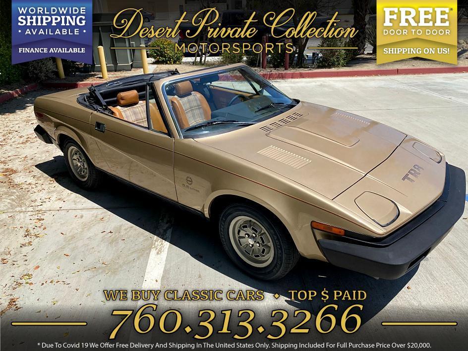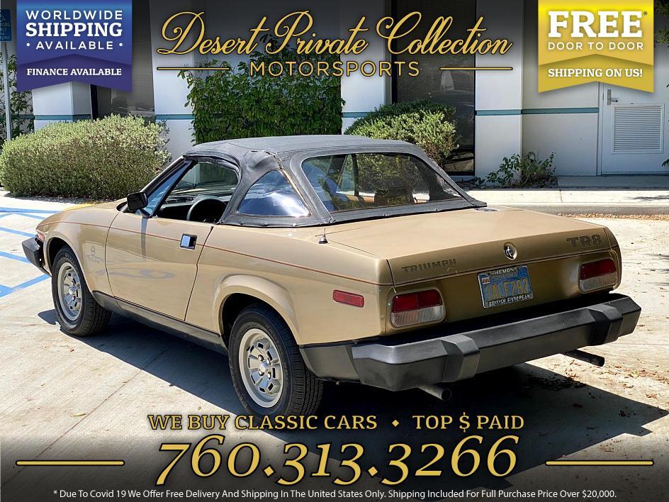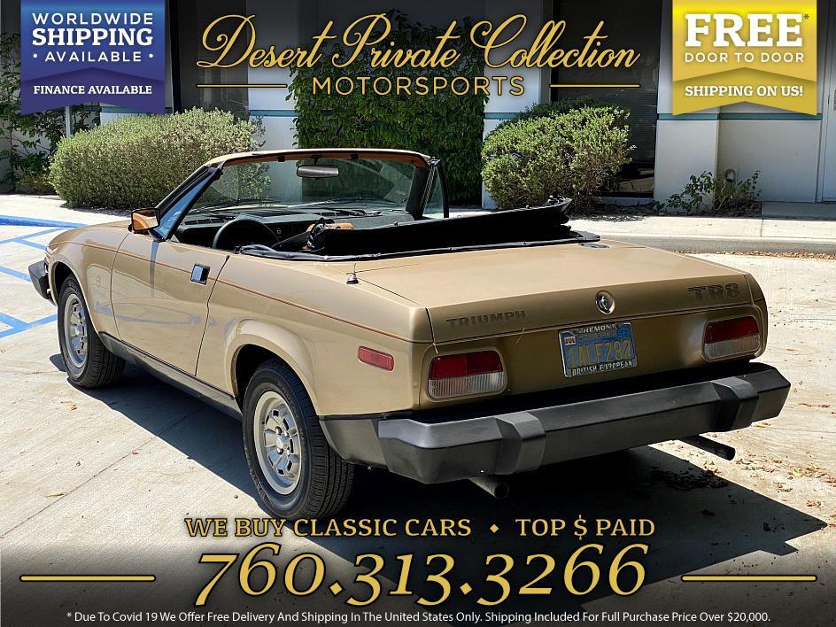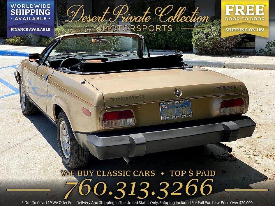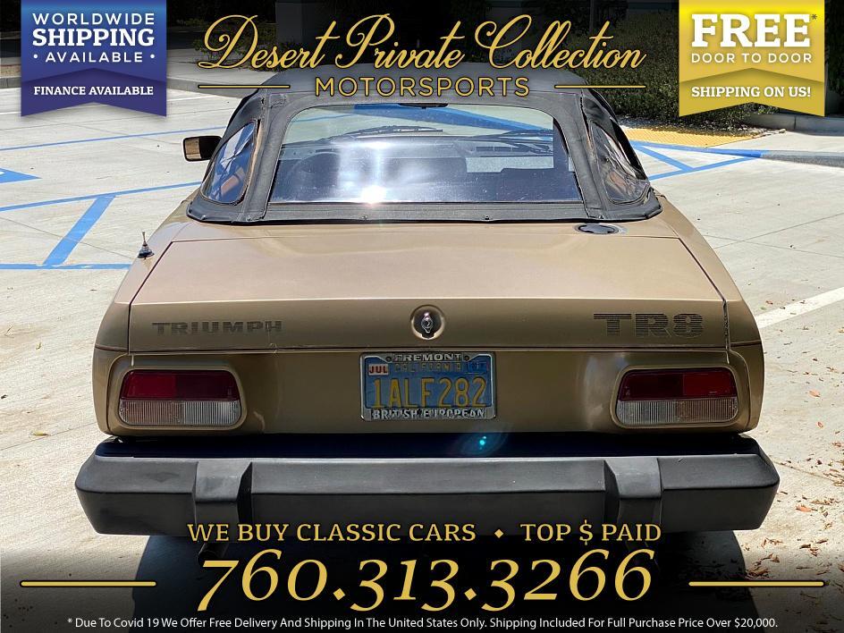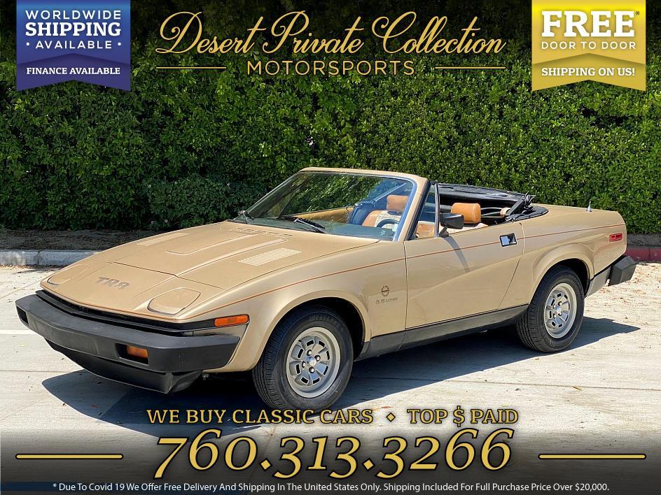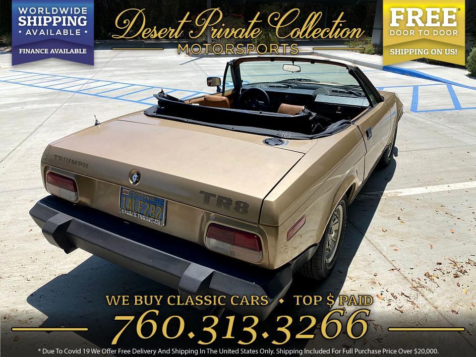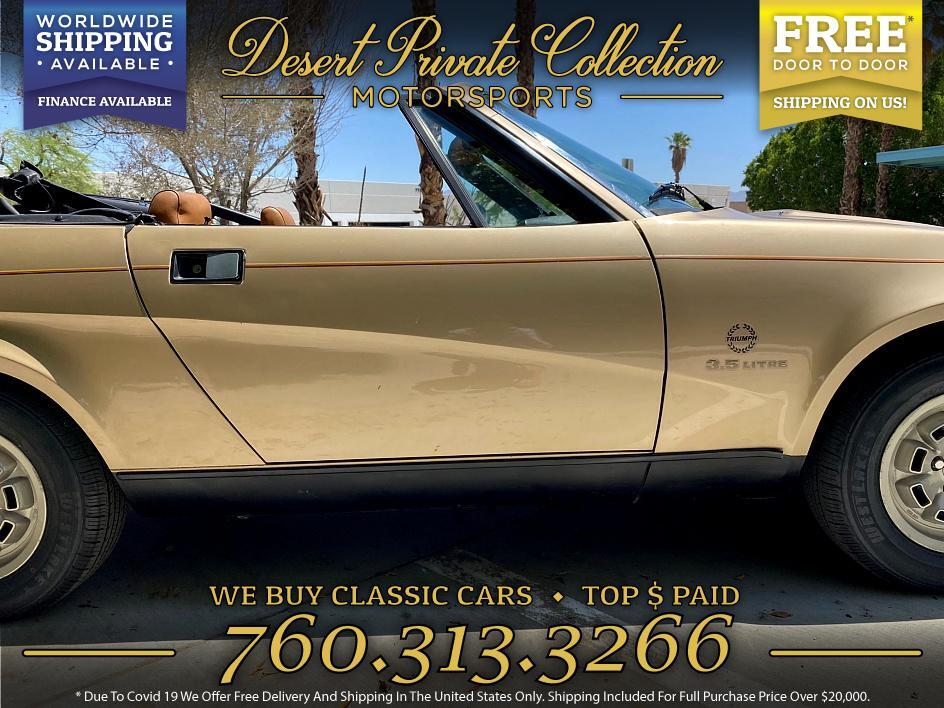 This very presentable Triumph TR8 Convertible comes in gold metallic with tan and tartan interior. It comes equipped with a 5 speed manual transmission| air conditioning| 13 alloy wheels| pop out headlights| black vinyl soft top and it includes the convertible boot. Excellent original blue plate California car. Runs and drives strong. ... Read the full description on our Website at: