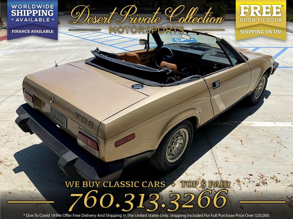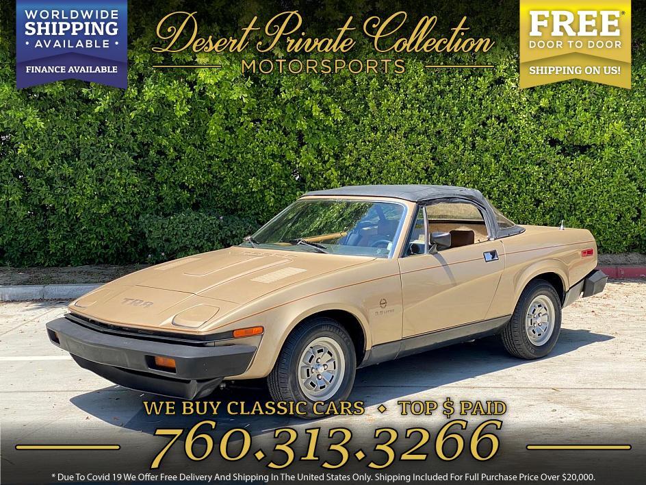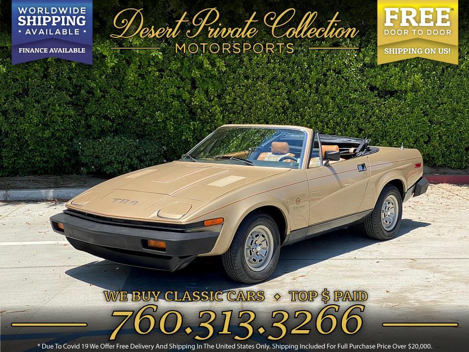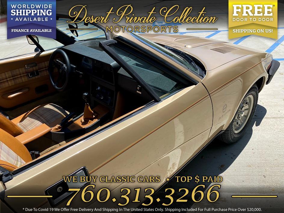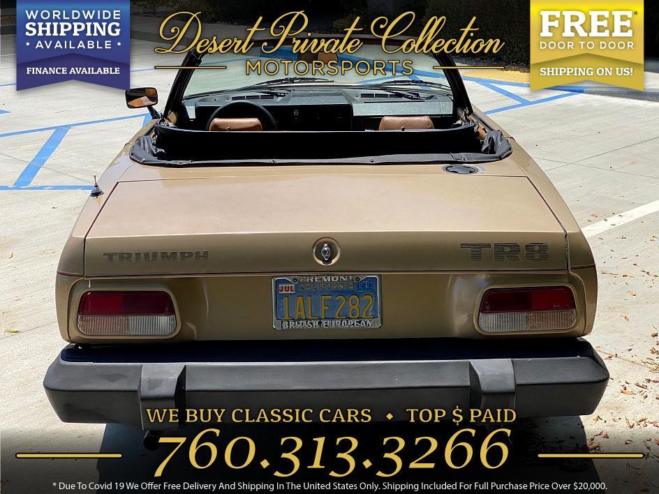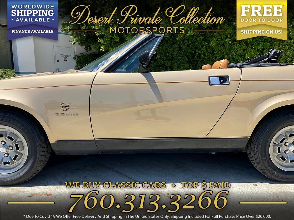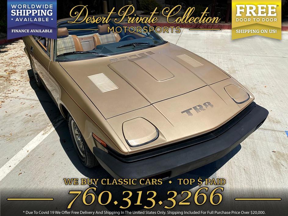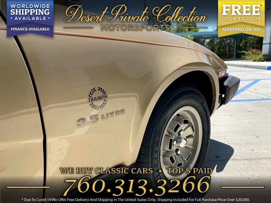 This very presentable Triumph TR8 Convertible comes in gold metallic with tan and tartan interior. It comes equipped with a 5 speed manual transmission| air conditioning| 13 alloy wheels| pop out headlights| black vinyl soft top and it includes the convertible boot. Excellent original blue plate California car. Runs and drives strong. ... Read the full description on our Website at: