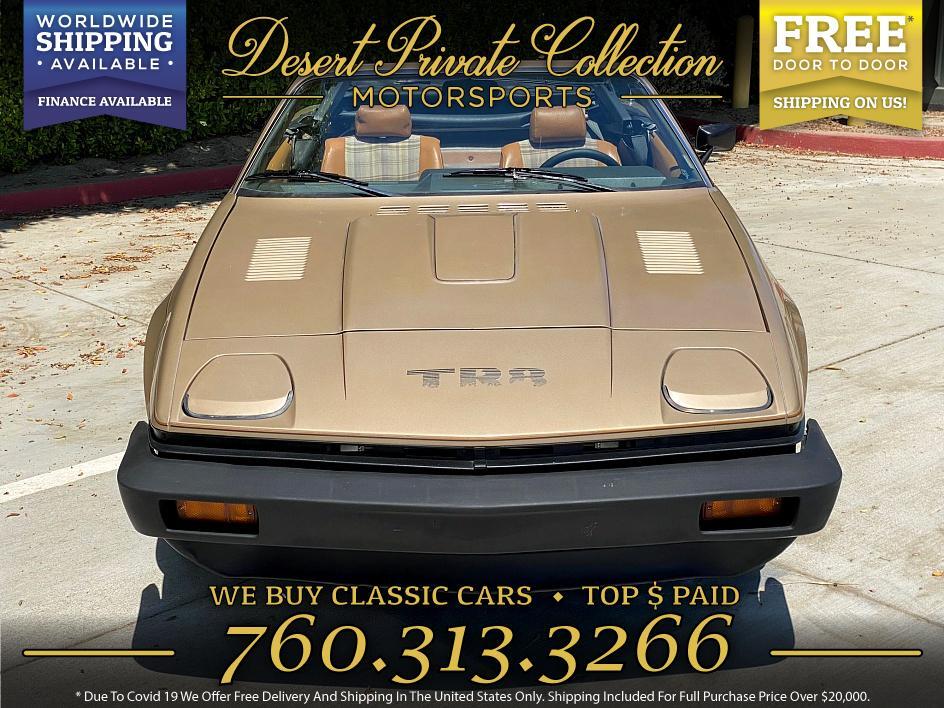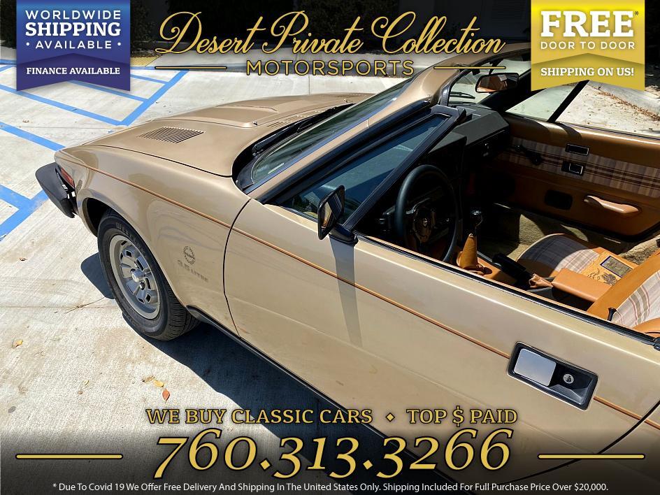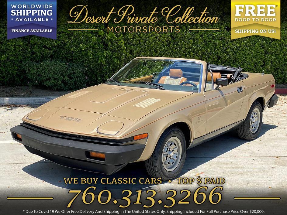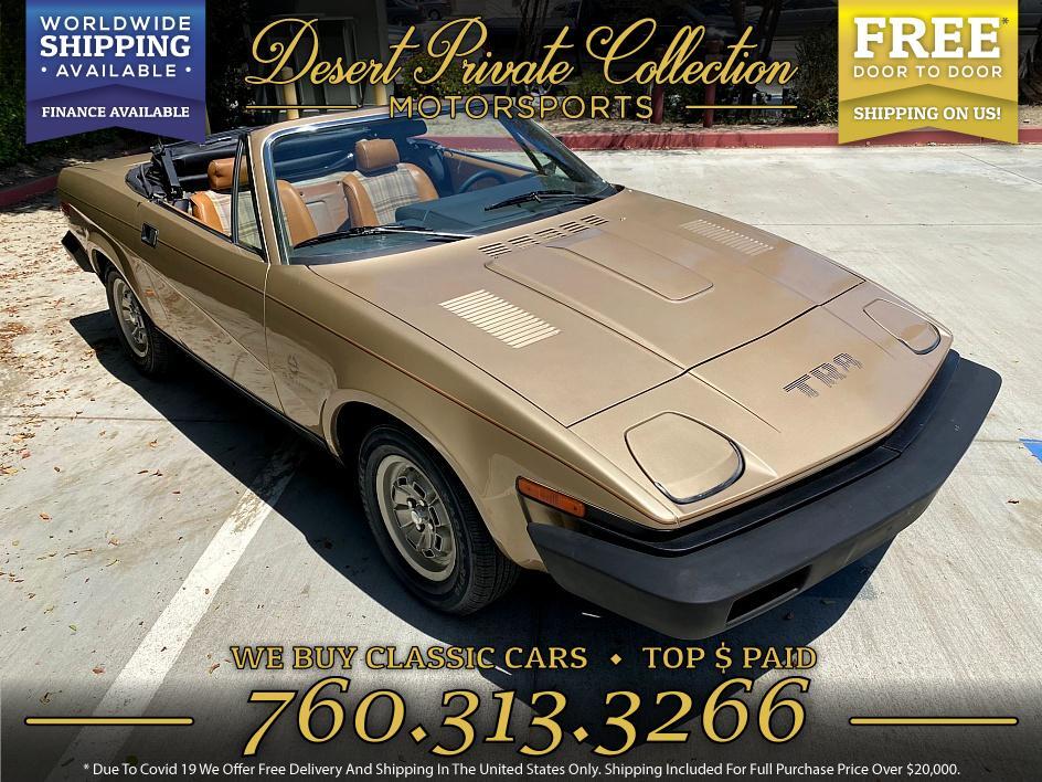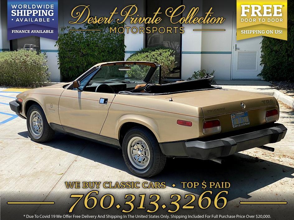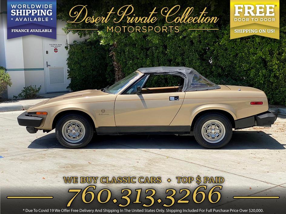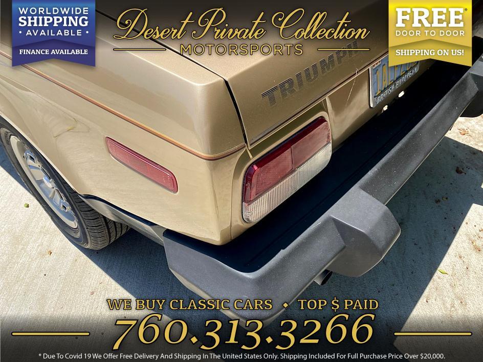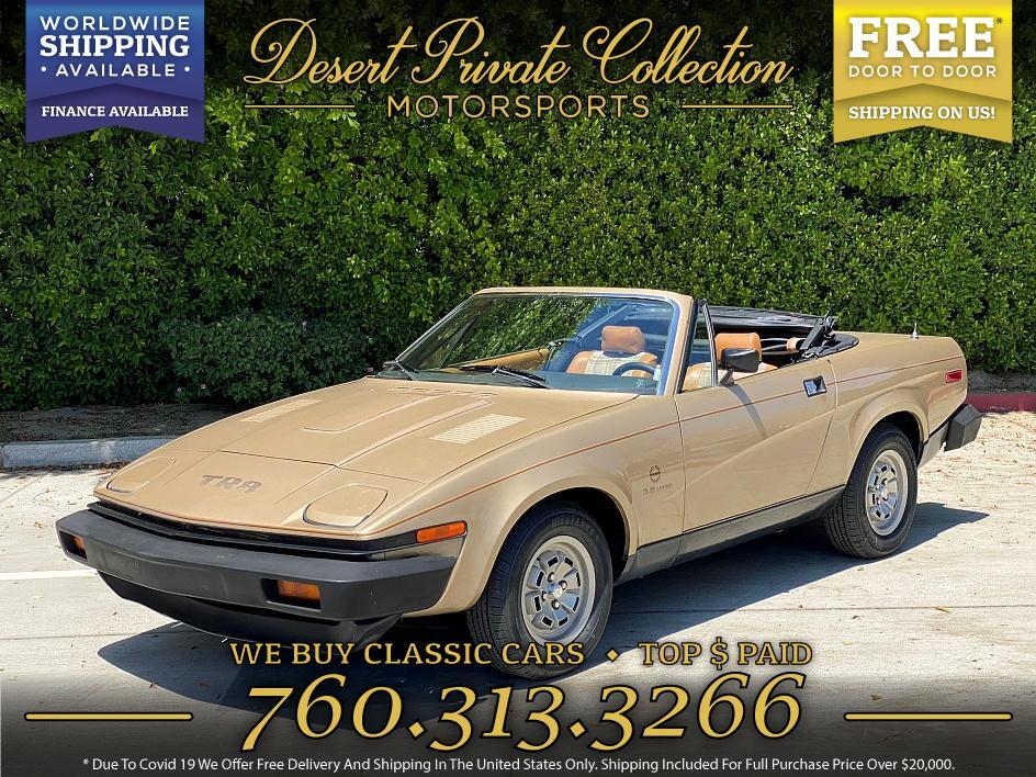 This very presentable Triumph TR8 Convertible comes in gold metallic with tan and tartan interior. It comes equipped with a 5 speed manual transmission| air conditioning| 13 alloy wheels| pop out headlights| black vinyl soft top and it includes the convertible boot. Excellent original blue plate California car. Runs and drives strong. ... Read the full description on our Website at: