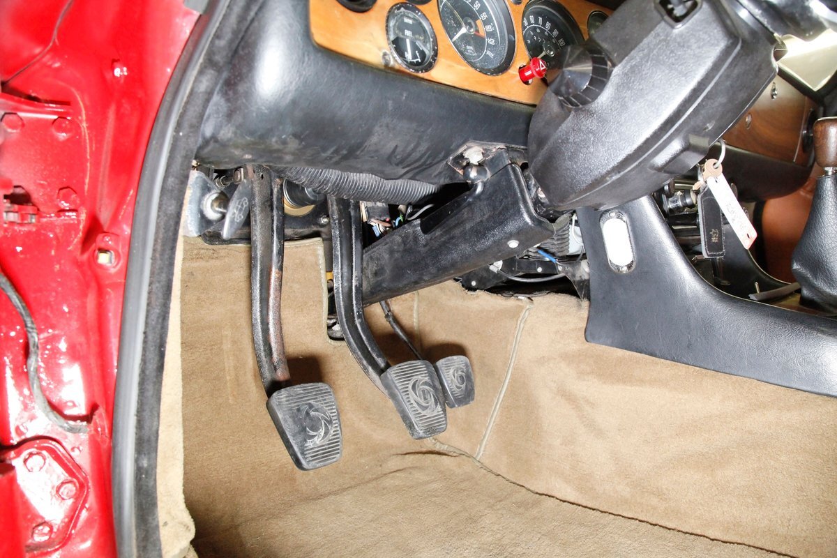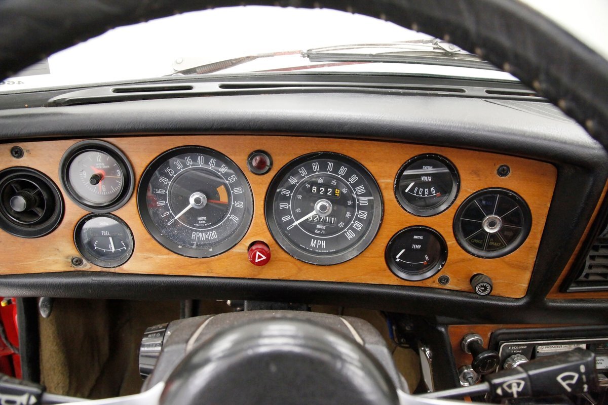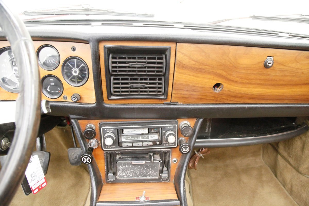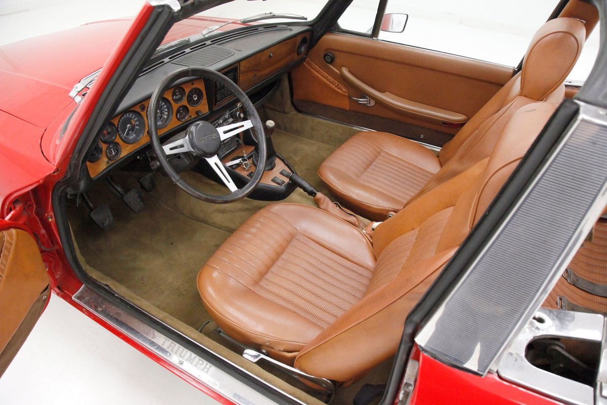 A double edged pointed spear like styled grille trimmed in chrome and supporting dual headlights and a triangular orange signal light in either corner leads the way. A nice shiny bumper with vertical push bars is on below and all this adds up to give the car a unique look. A center badge of a prancing Stag is noted on the grille. Steel is very straight, gaps are nicely managed, and it is bathed in red paint which shows nicely and is a factory matching respray with no rust or inclusions but does show some dings and scratches. The unique feature of this convertible 4 passenger car is the addition of a B pillar just behind the driver's door that becomes the rear base for what is a top structure. The front support being the windshield surround in polished chrome. The top structure is black texture coated steel. This was deemed necessary for structural rigidity for the car and support for the rag top. The top is back canvas and moves up and down easily by hand. No T insert panels are necessary or available even as an option. The top folds neatly down into a space behind the rear bench and a wide chrome trimming surrounds this area of the tonneau covering. So if it spits and you need to wear your Wellies, just put the top up and you are "covered". On back the mid 70's Spitfire-esque styling continues with another double pointed edge spear, edged in chrome complete with matching spear shaped taillights that slightly wrap around to the rear quarters. Another bumper with vertical push bars is nice and sleek and wraps around the quarters as well and a marker light floats just above. Some very light beginnings of chrome pitting are seen on this bumper. 14-inch cast aluminum wheels are on with a center hub badged with a stag. Jesus loves you more than you will know, Whoa, whoa, whoa.
