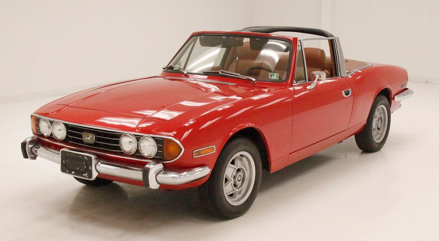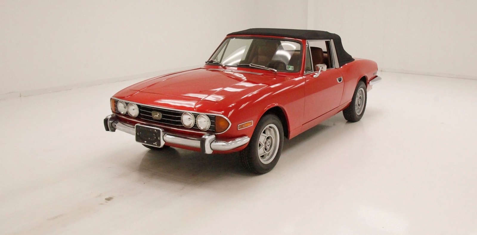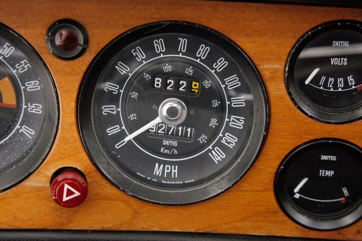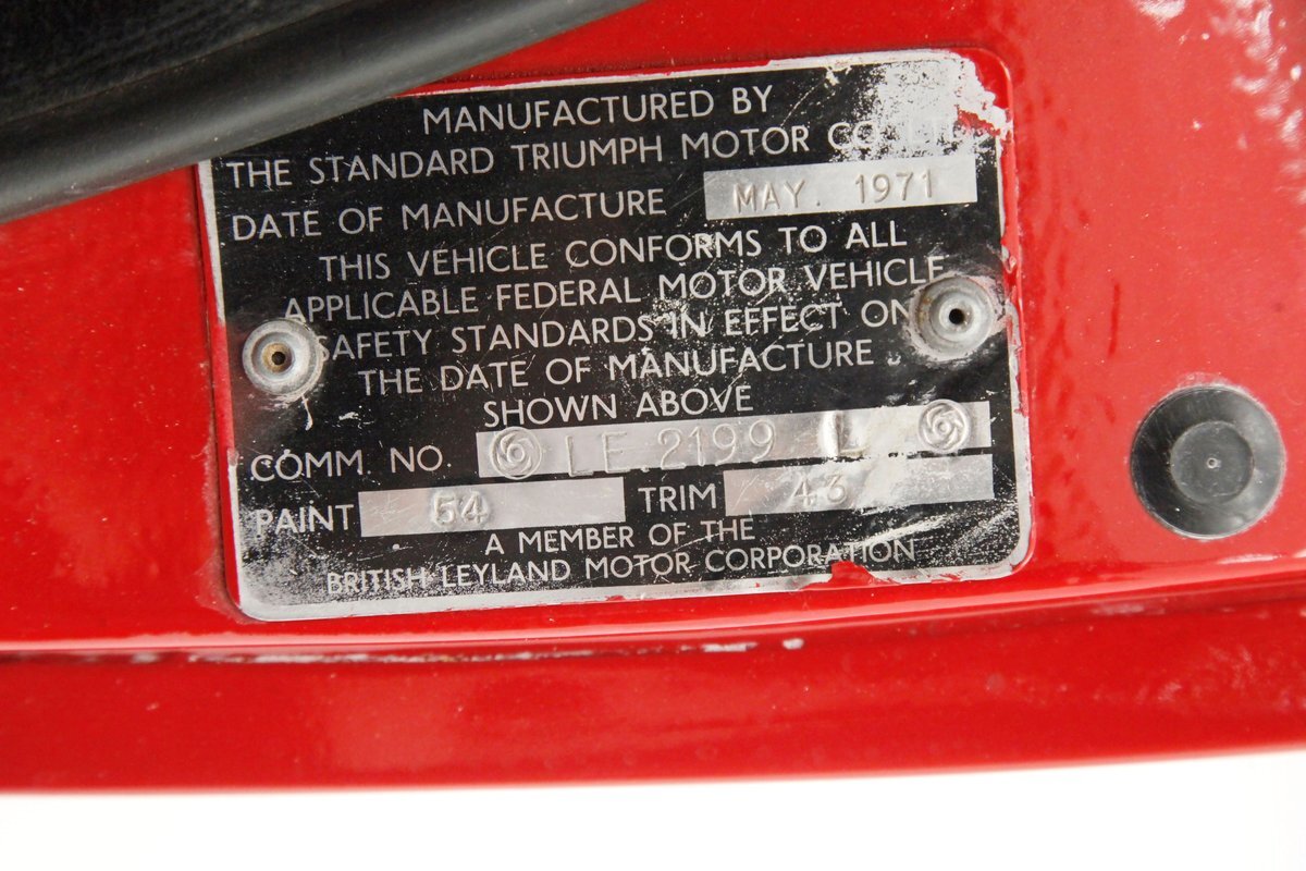 A double edged pointed spear like styled grille trimmed in chrome and supporting dual headlights and a triangular orange signal light in either corner leads the way. A nice shiny bumper with vertical push bars is on below and all this adds up to give the car a unique look. A center badge of a prancing Stag is noted on the grille. Steel is very straight, gaps are nicely managed, and it is bathed in red paint which shows nicely and is a factory matching respray with no rust or inclusions but does show some dings and scratches. The unique feature of this convertible 4 passenger car is the addition of a B pillar just behind the driver's door that becomes the rear base for what is a top structure. The front support being the windshield surround in polished chrome. The top structure is black texture coated steel. This was deemed necessary for structural rigidity for the car and support for the rag top. The top is back canvas and moves up and down easily by hand. No T insert panels are necessary or available even as an option. The top folds neatly down into a space behind the rear bench and a wide chrome trimming surrounds this area of the tonneau covering. So if it spits and you need to wear your Wellies, just put the top up and you are "covered". On back the mid 70's Spitfire-esque styling continues with another double pointed edge spear, edged in chrome complete with matching spear shaped taillights that slightly wrap around to the rear quarters. Another bumper with vertical push bars is nice and sleek and wraps around the quarters as well and a marker light floats just above. Some very light beginnings of chrome pitting are seen on this bumper. 14-inch cast aluminum wheels are on with a center hub badged with a stag. Jesus loves you more than you will know, Whoa, whoa, whoa.